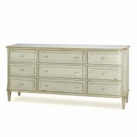 NOTE: AVAILABLE ONLY AS SHOWN Bed slats included Worn light grey paint finish Poplar solids Off-white linen upholstery with decorative fabric tape and spaced Antique brass nail head trim Low footpost conversion hardware included. |