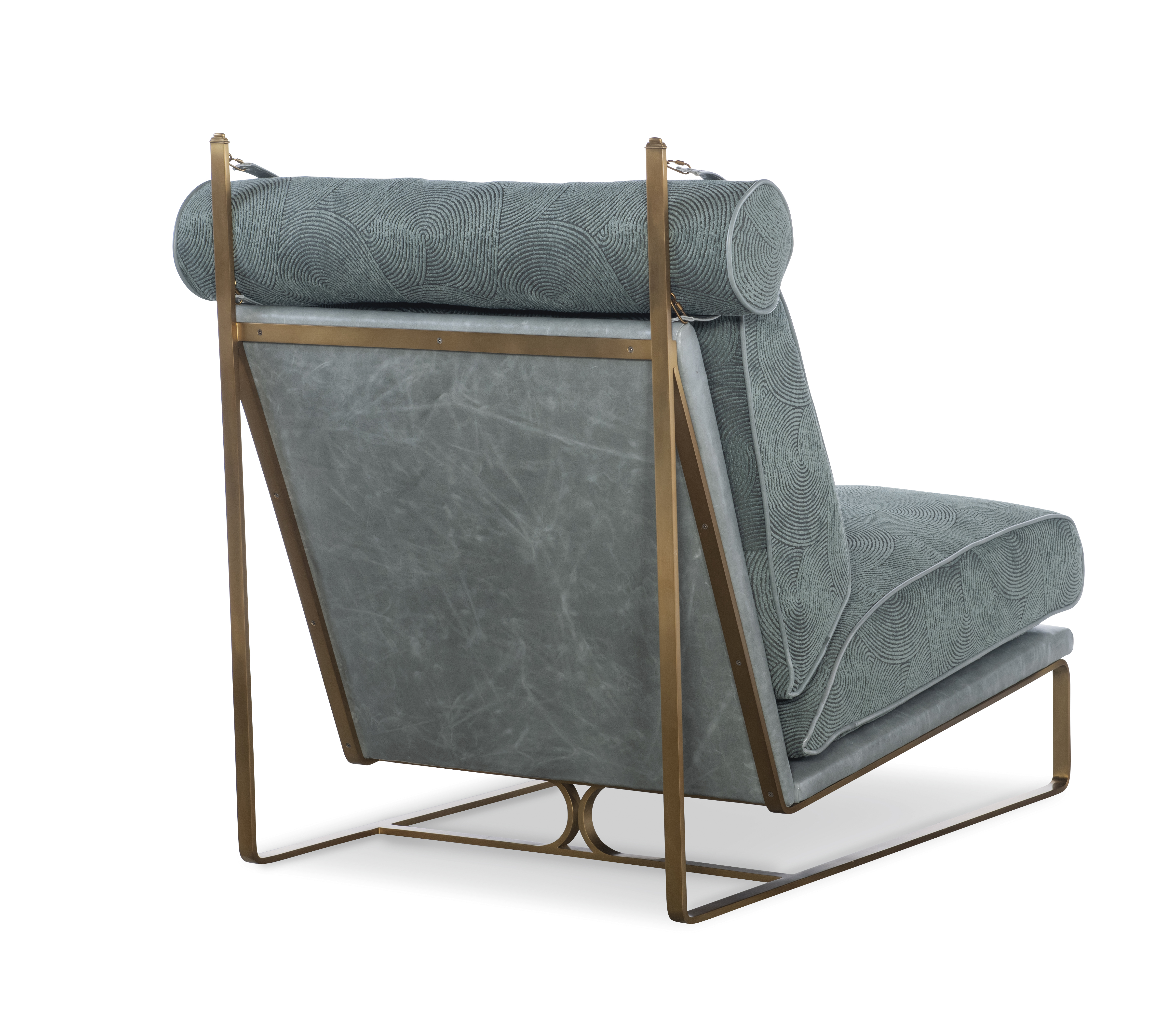 This deftly upholstered lounge chair is simply strapping with leather loops supporting its bolster head pillow and a matte gold plated steel frame. Available with ottoman, your favorite book invited.