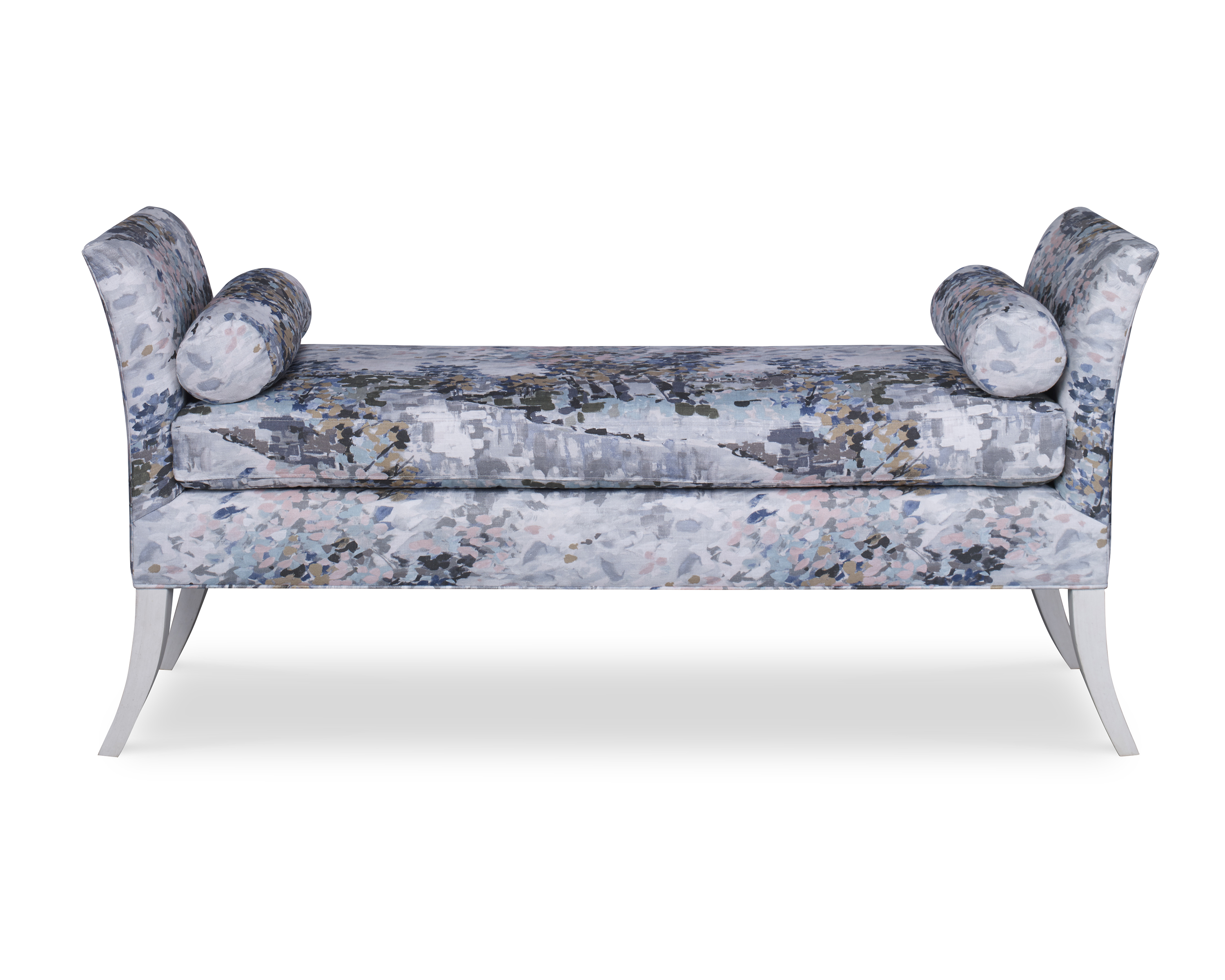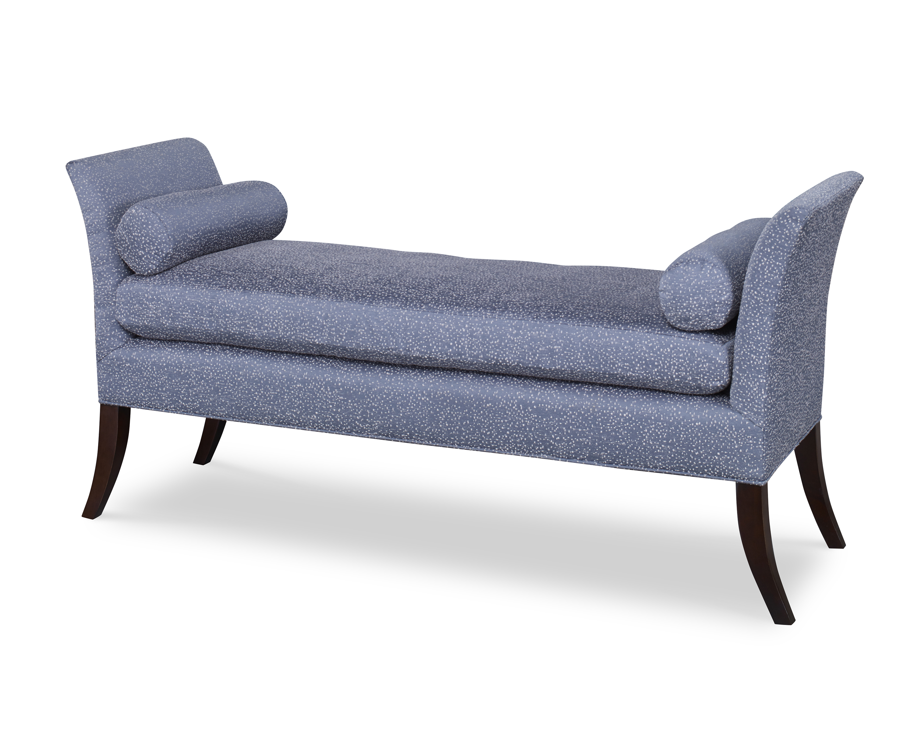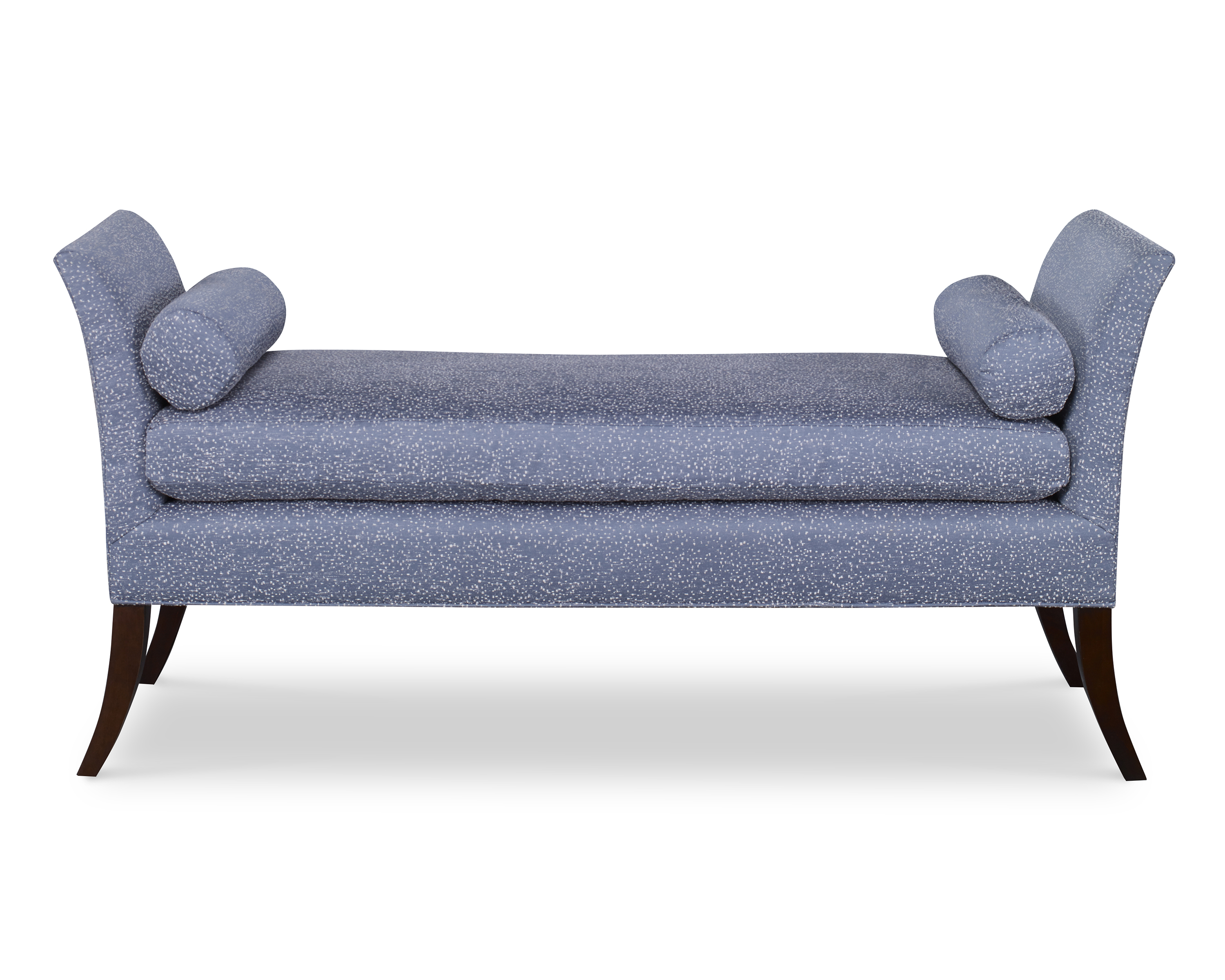 Blaire bench has beautiful lines with a tapered flared arm accented with a pair of round bolster pillows. It has a single seat cushion and is finished off with thin saber wood legs. Perfect at the foot of the bed or placed in a foyer.