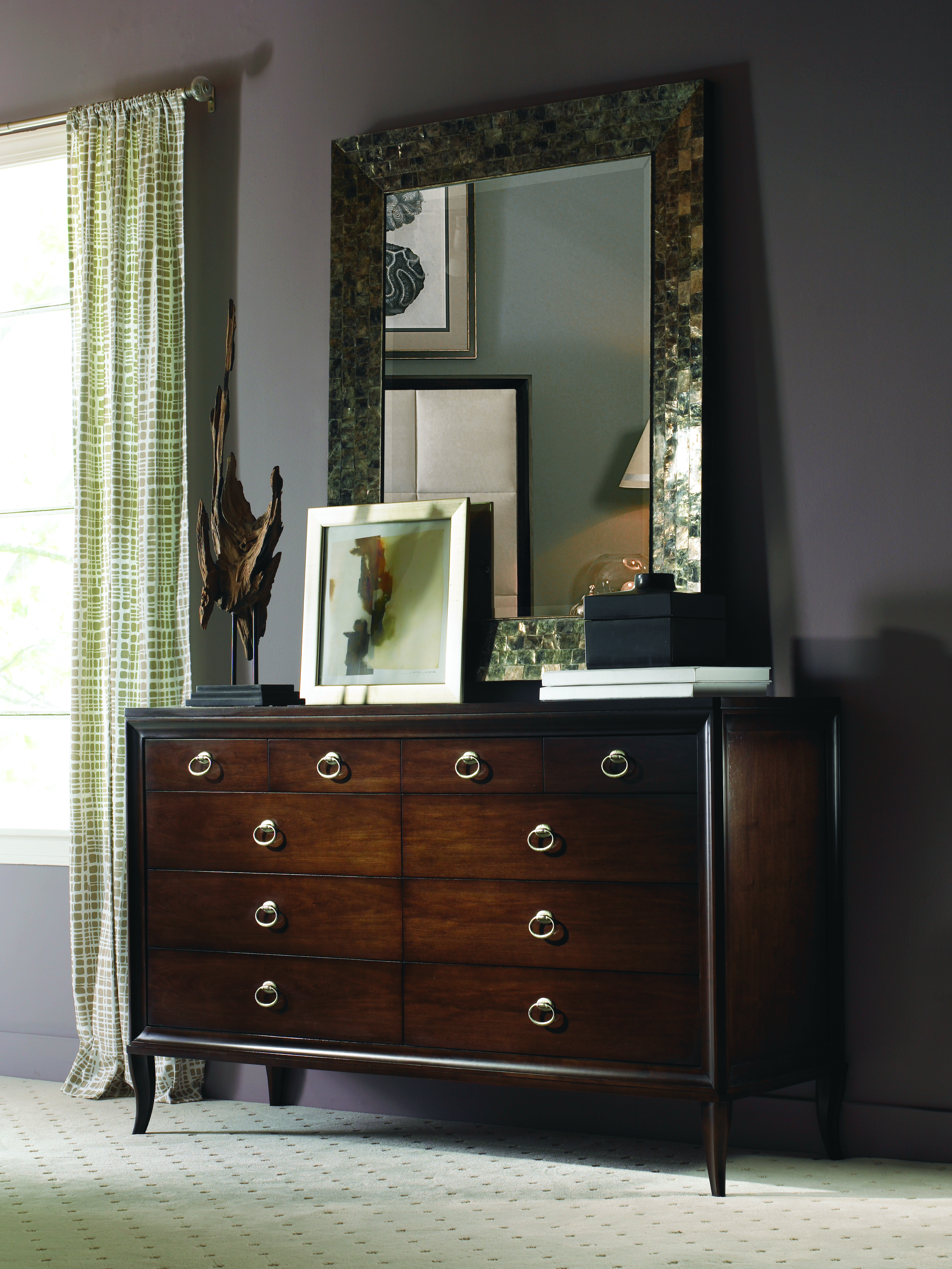 331 Tribeca finish Eight drawers with His jewelry tray in top right drawer and Her jewelry tray in top left drawer. Aged Nickel hardware Tip restraint included |
