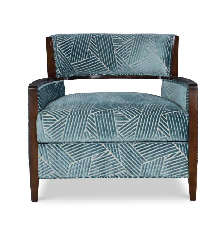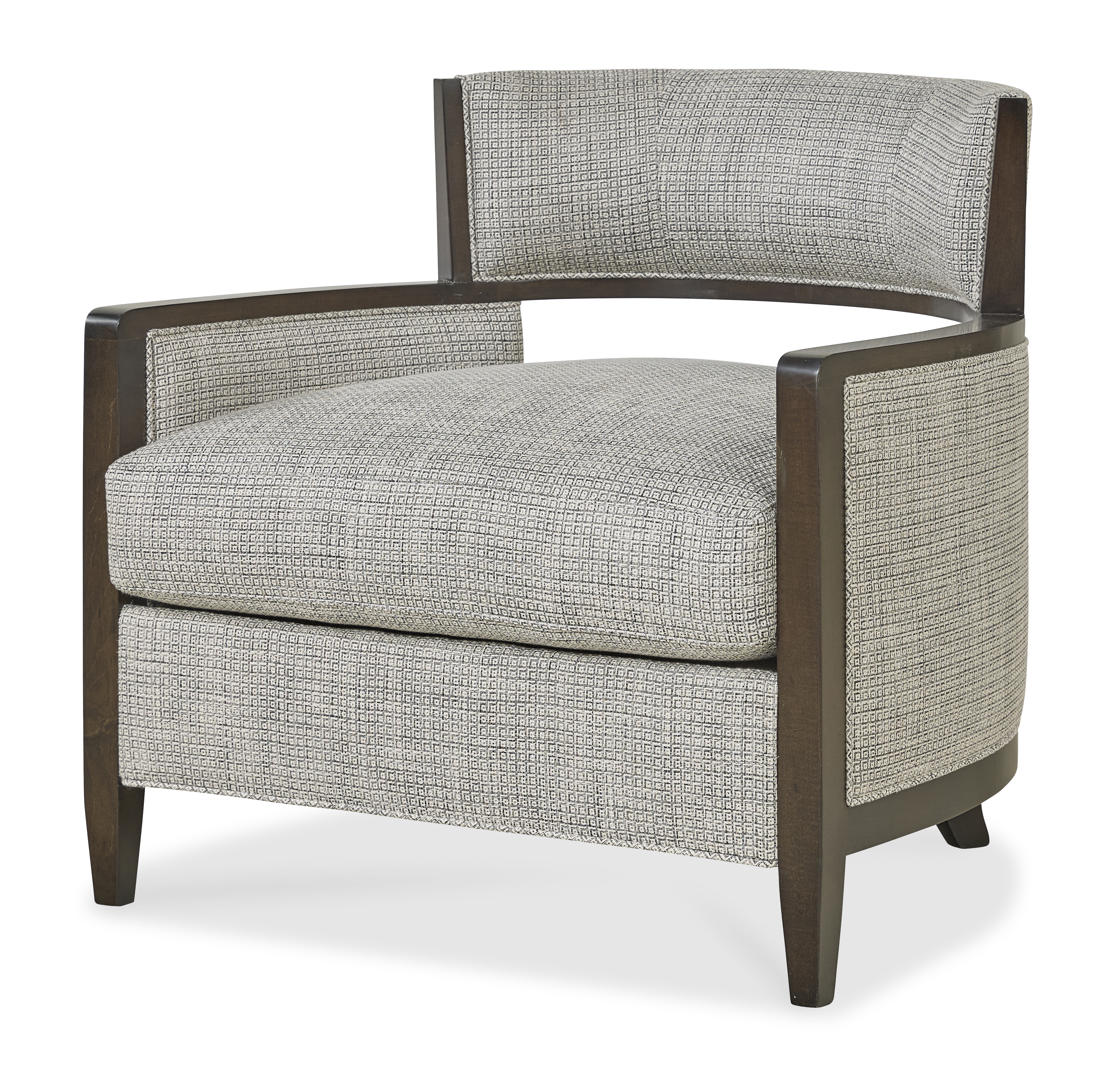 The Everly is a updated twist on a barrel chair featuring sleek exposed wood trim, open window back and tapered legs. This would be a great chair to contrast the welt.