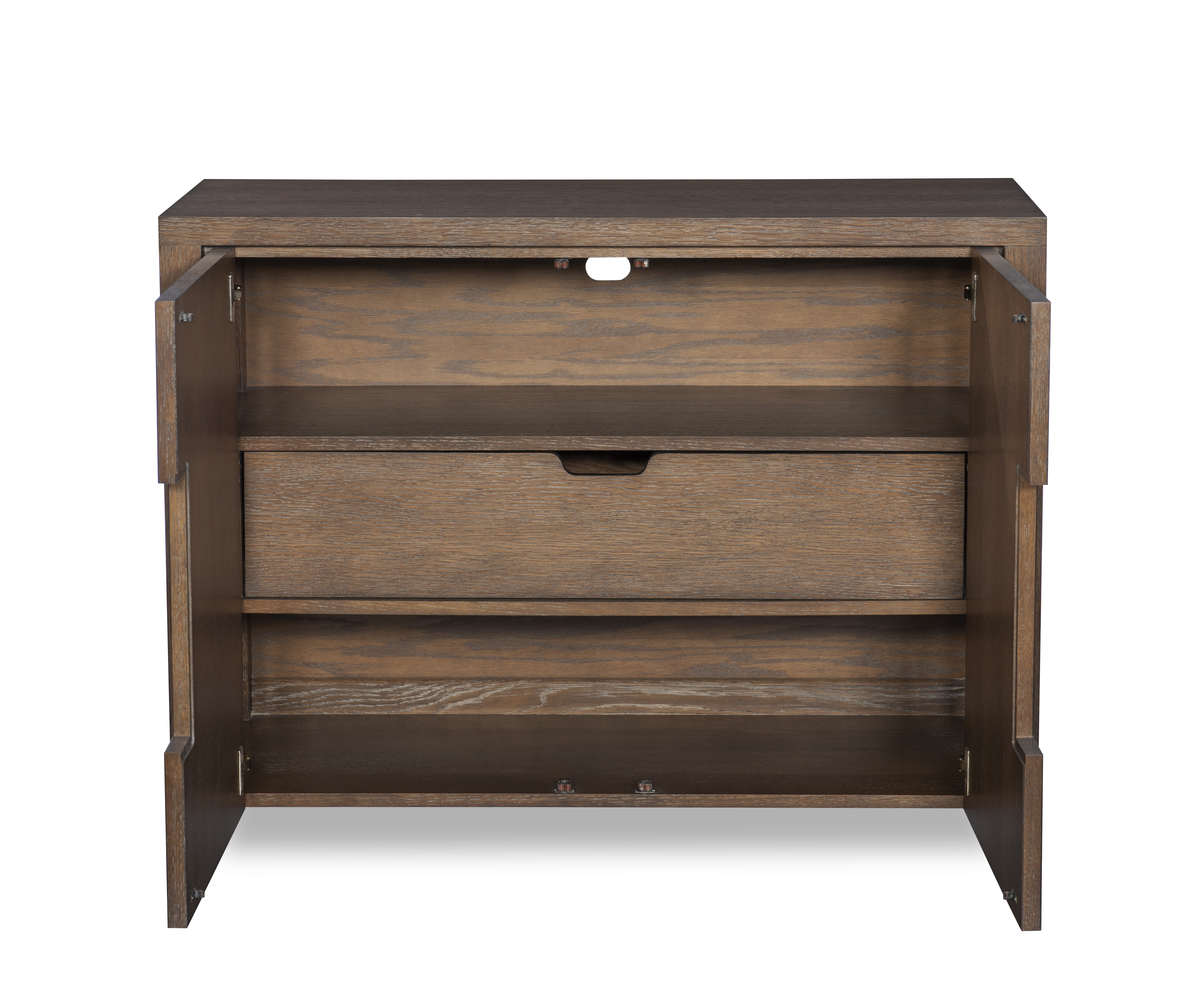 The Chino is a minimalistic two door chest featuring large decorative textured metal door pulls in an oiled bronze finish that contrasts nicely with the straight grained oak solids and veneers. Beautiful as an entry way piece, but also nice as a large scale bedside chest.
