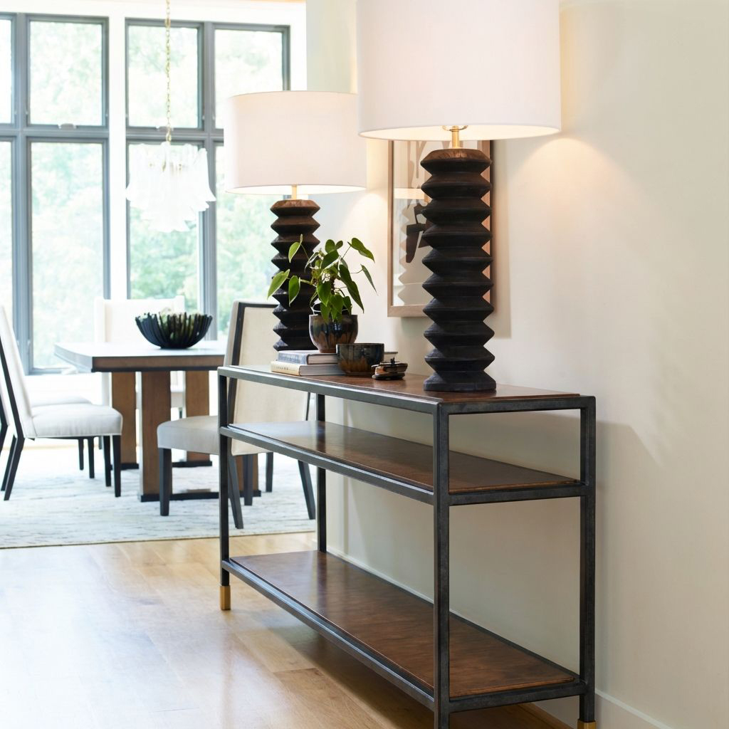 "The new Jennings Table and Console Collection has grown out of the hexagon faceted Danish modern iron frame on my daybed. That base with its elegant brass foot seemed so perfect to make Coffee, Side and Console Tables with a great selection of glass, oak and walnut tops and shelves. As always for the wood veneers, each panel is carefully sized and matched. " -Thomas O'Brien