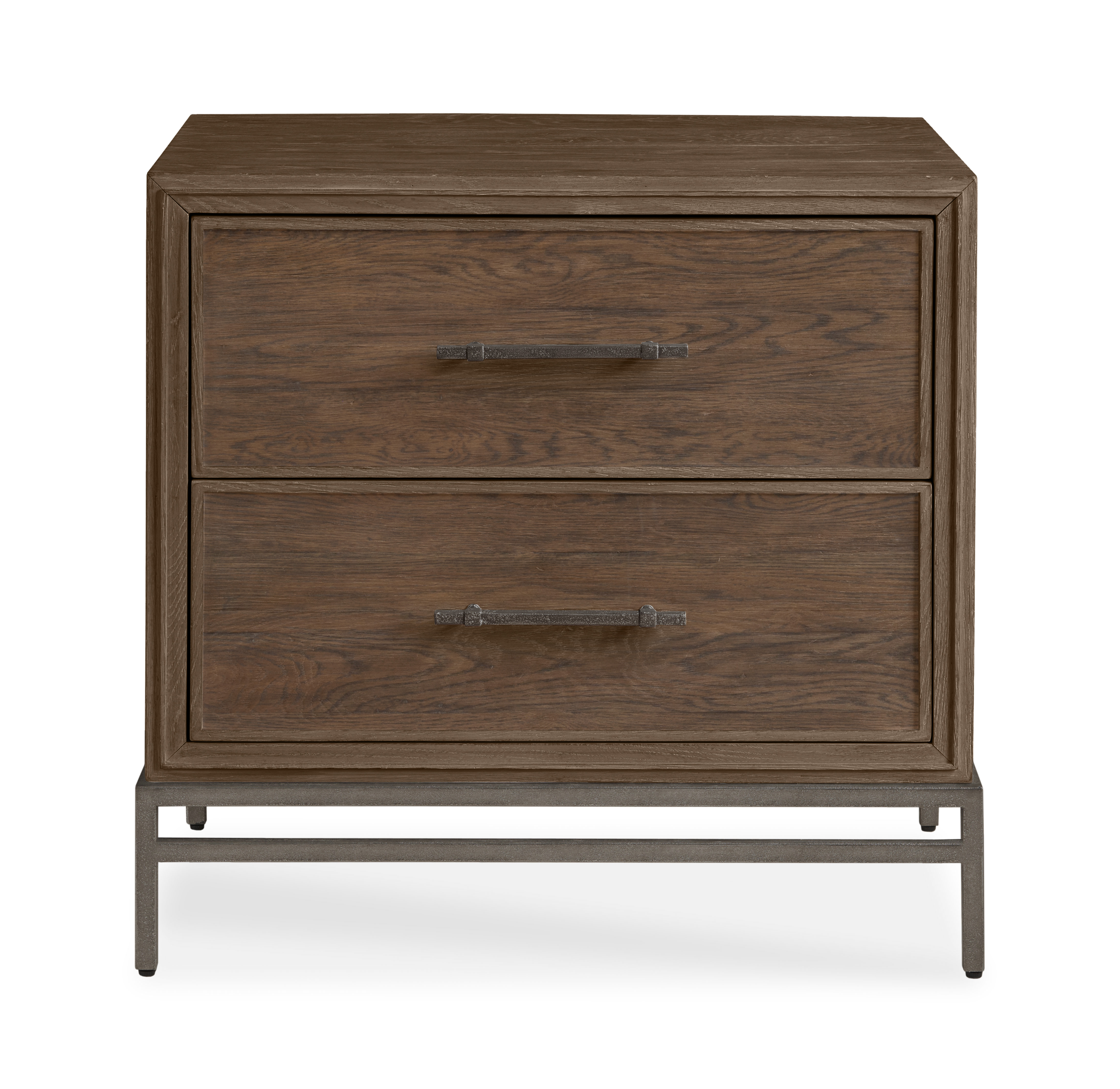 B2H Brown Rustic Two soft-close drawers with textured pewter metal base and hardware Two USB ports and two outlets on back of case Tip restraint included |