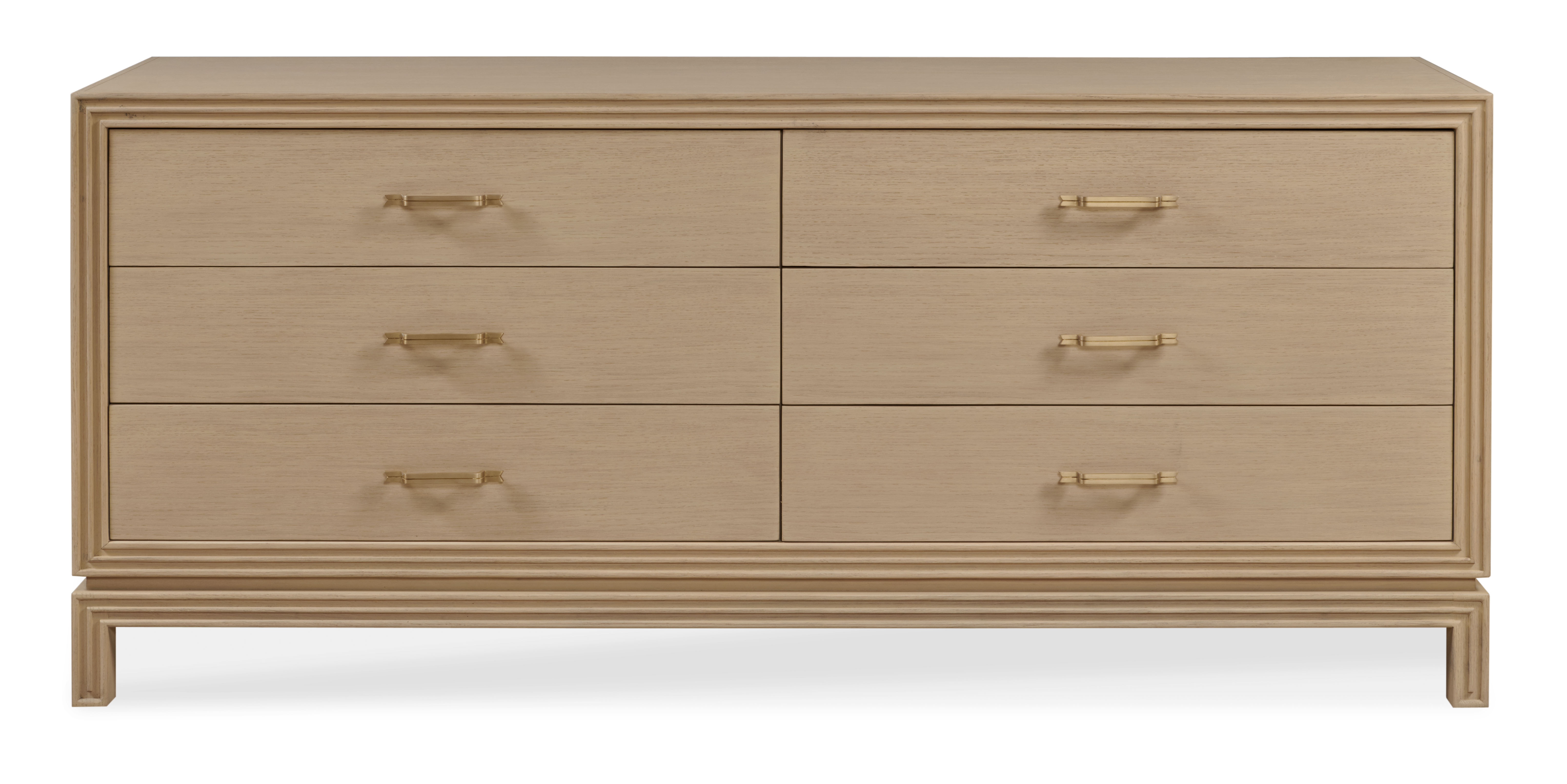 A linear carved border wraps each side of our Deco inspired Lewis Collection, framing every elevation. The same striking carving is replicated in the base, with the case floating above separated by a reveal. The brass hardware with ribbon detail compliments the border design and adds vintage flair. The inset drawers speak to old-world craftsmanship.