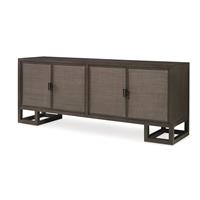 Our Mackinaw credenza is crafted from Mahogany solids and veneers with natural woven cane on the door faces lending the piece a soft casual feel. Designed with solid brass pewter finished hardware. Two sets of doors open to reveal ample storage. Behind the two right facing doors are three tray drawers on either side of a center partition and behind the left doors is a wine rack and one adjustable shelf with center partition between them.
