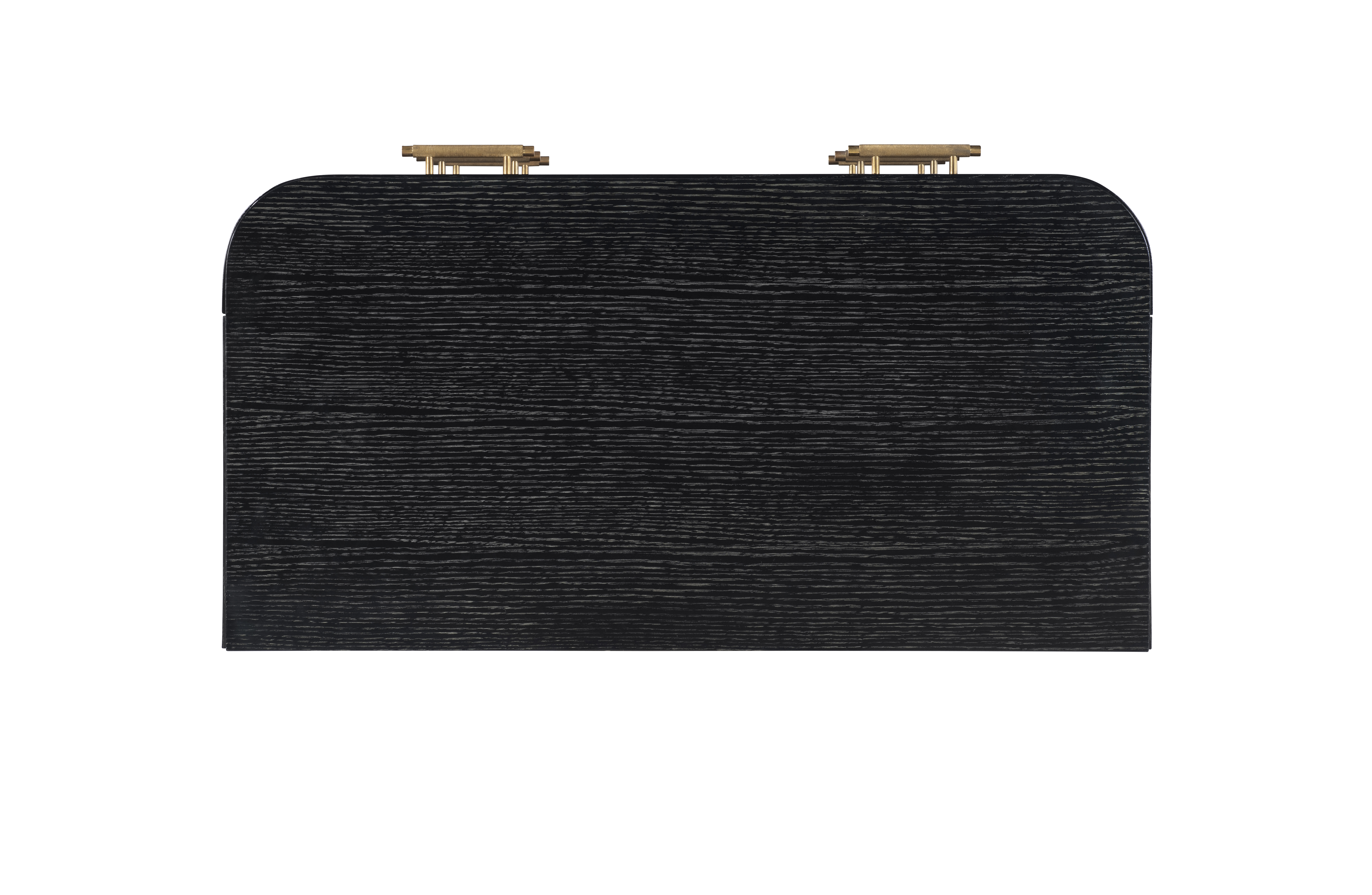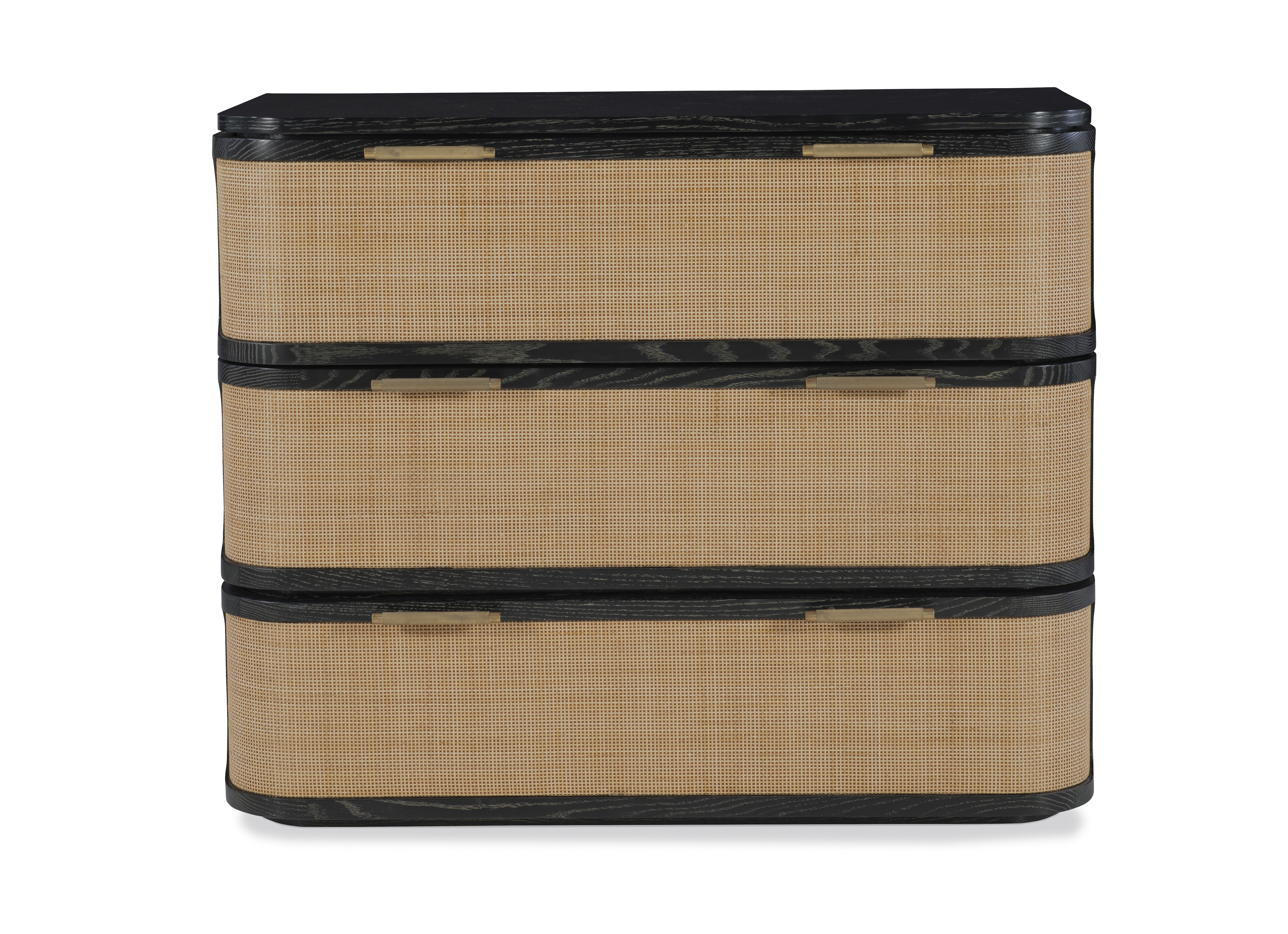 Black finished case with natural colored cane drawer fronts and brass hardware |