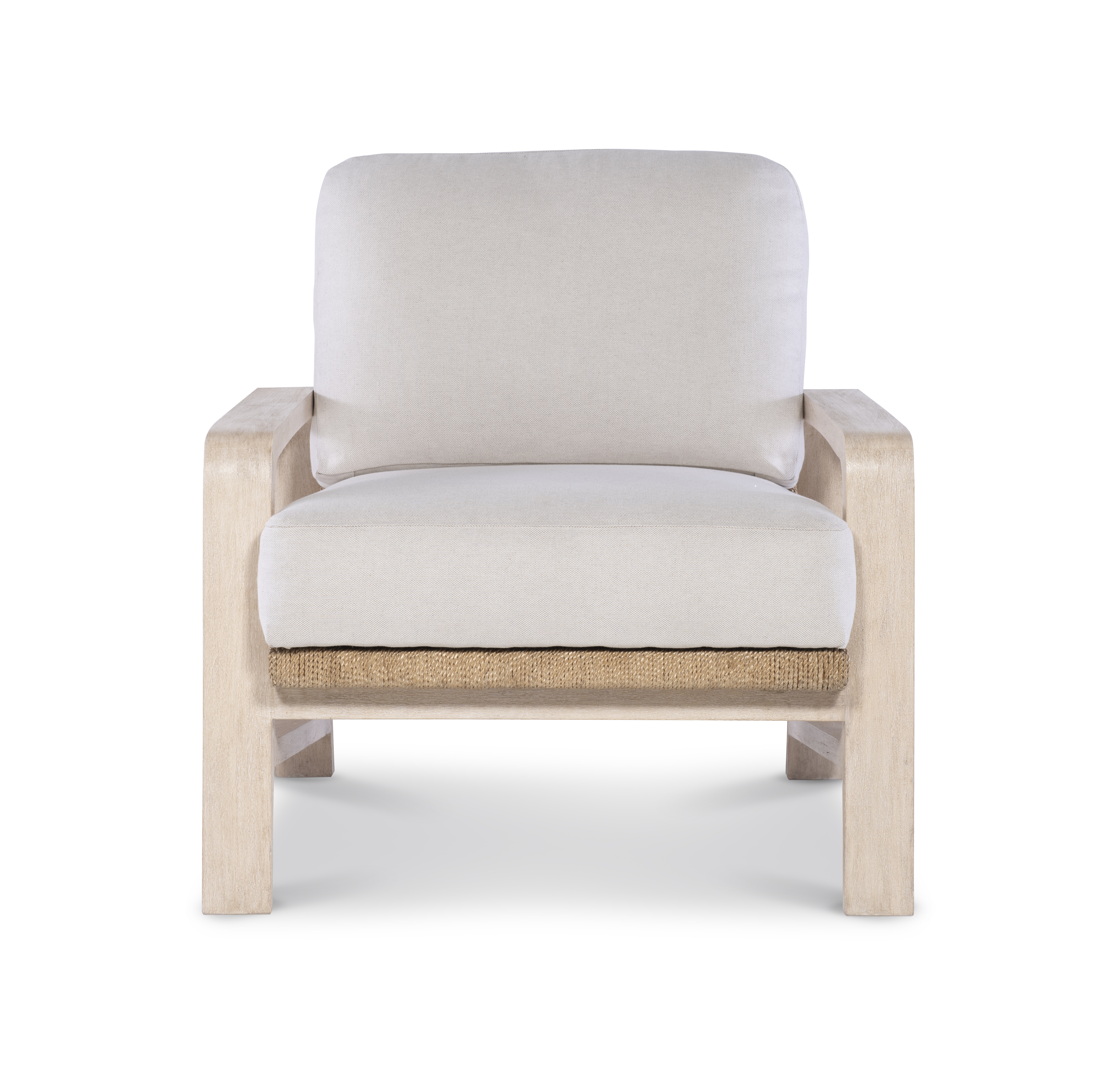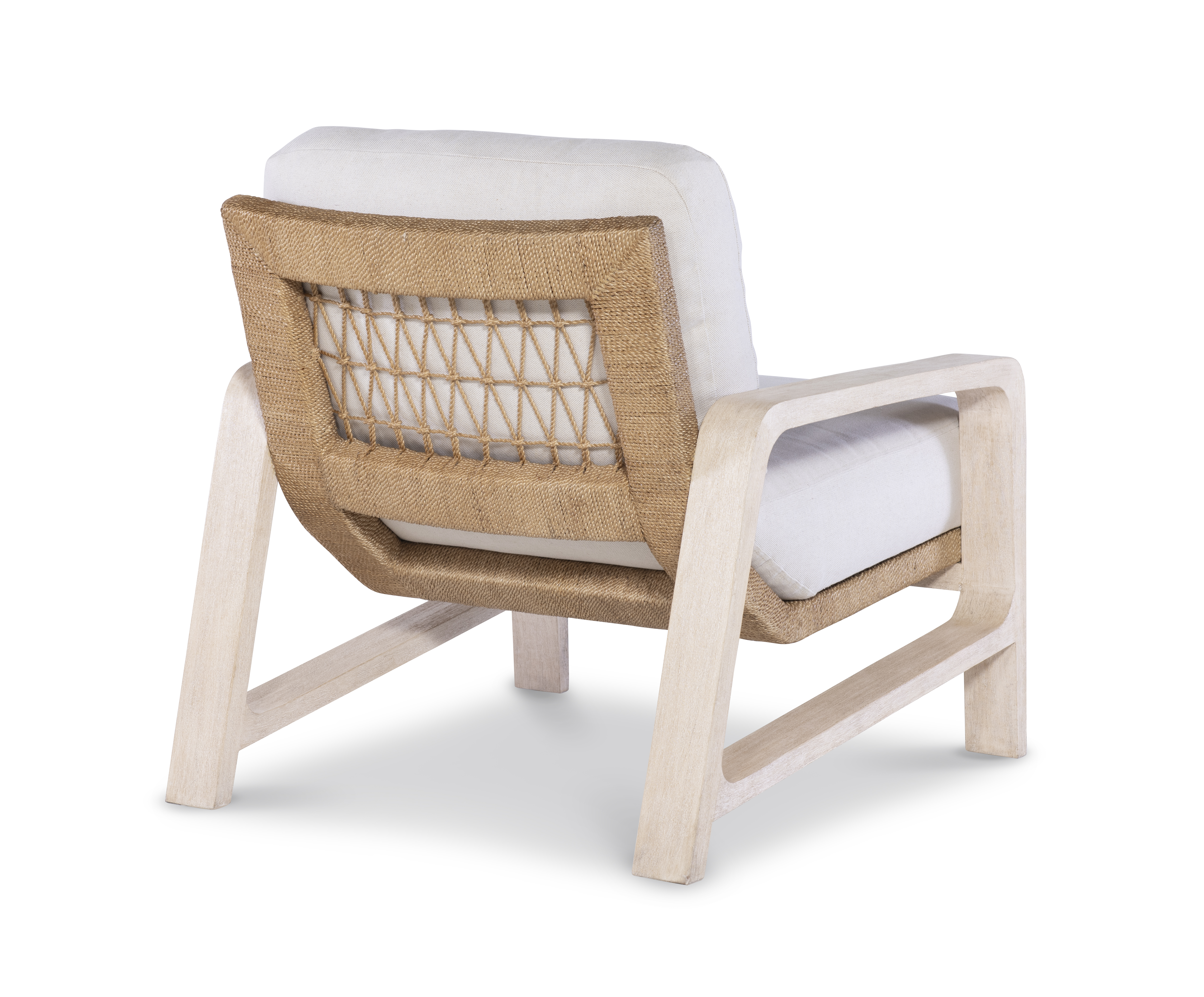 A sandblasted, eggshell finish with the seat and back wrapped in a natural abaca rope. Flax colored fabric |