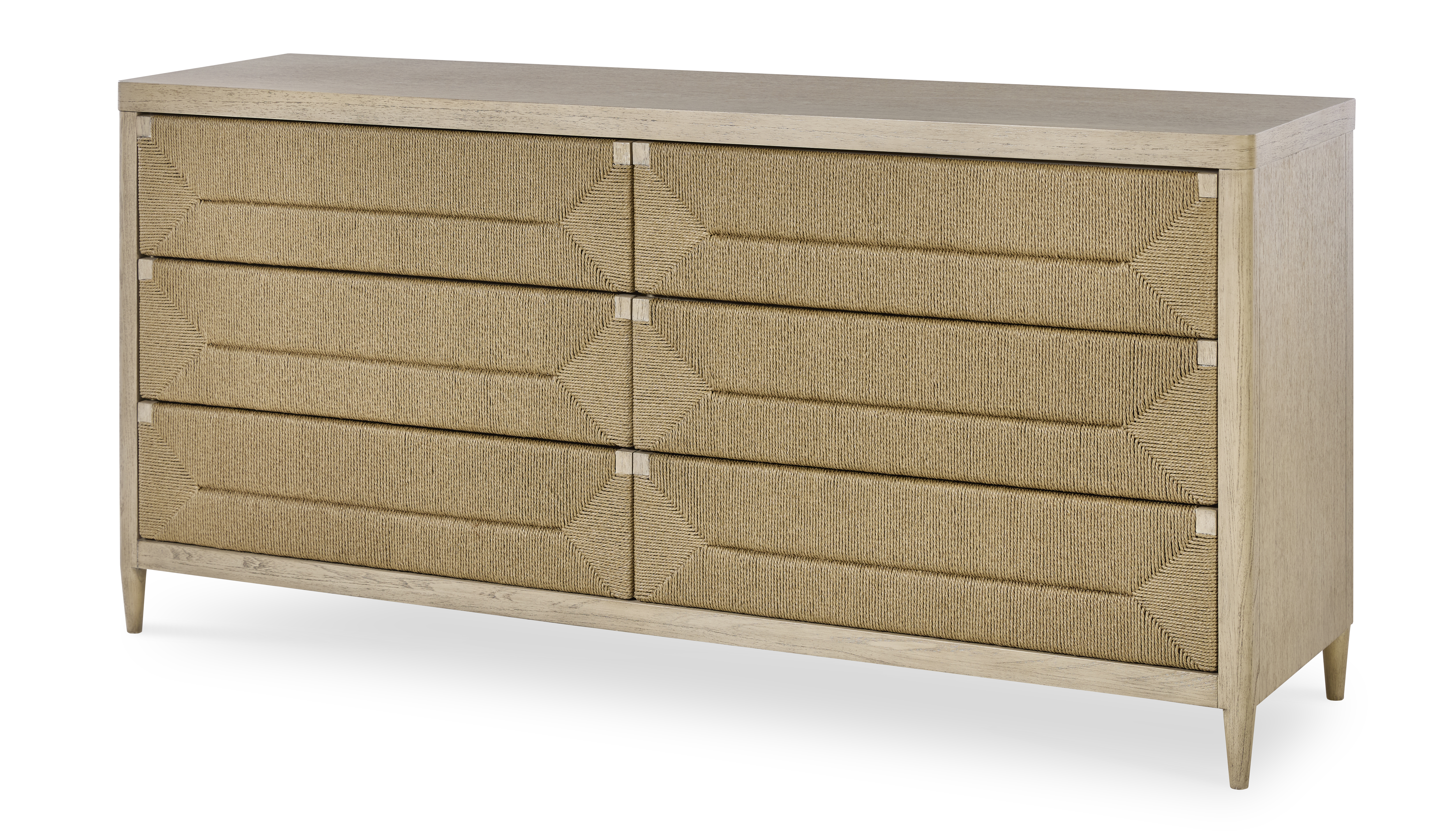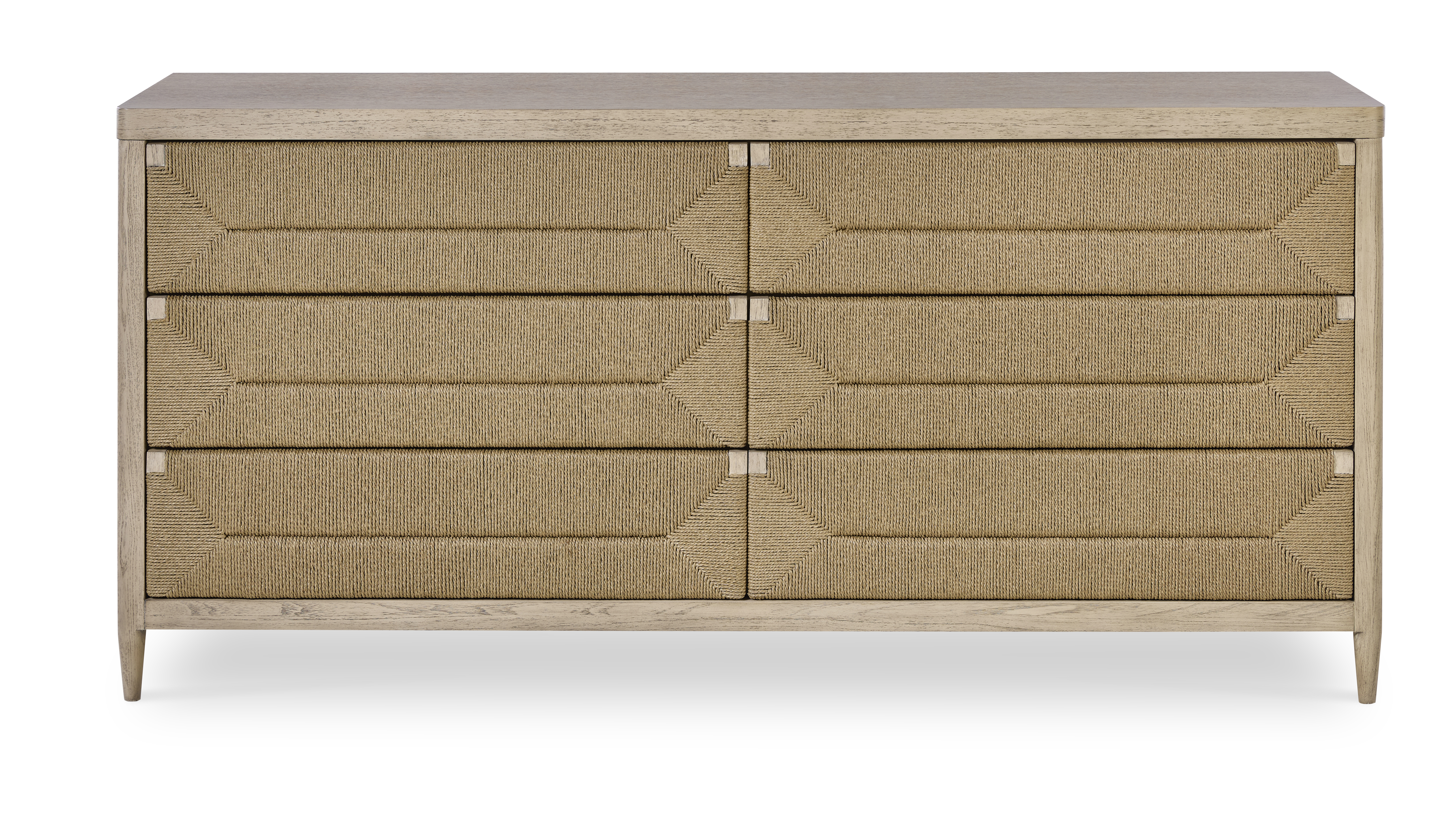 A light, grey wash wood frame featuring geometric drawer front panels woven out of abaca rope with touch latch |