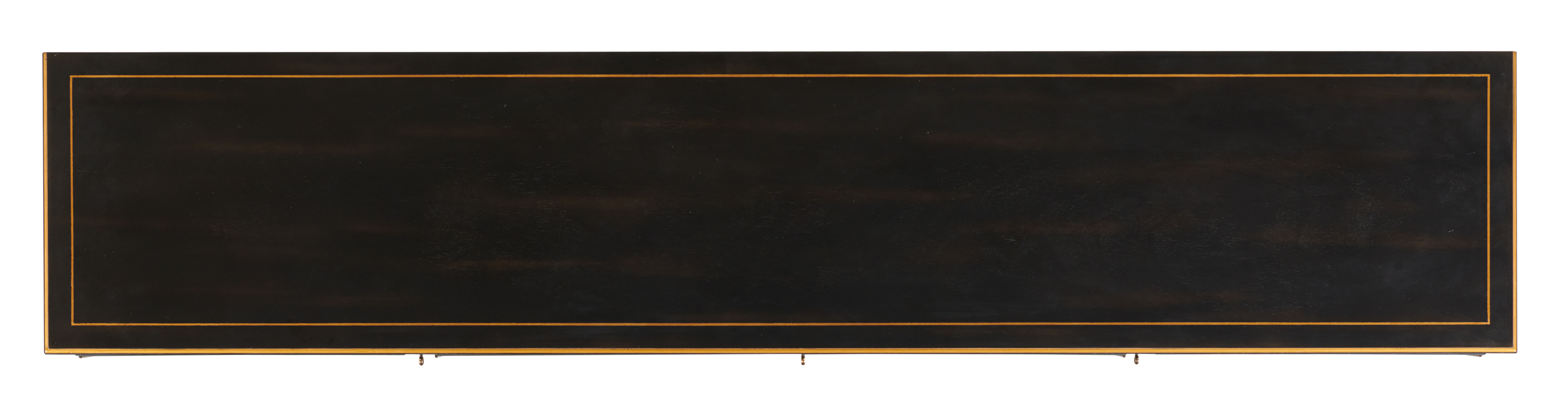 Black and gold finish Acacia solids and Eglomise mirror with gold striping door fronts. Behind single left and right facing door with functional lock is one adjustable shelf. Behind two center doors with functional lock is one adjustable shelf Tip restraint included |