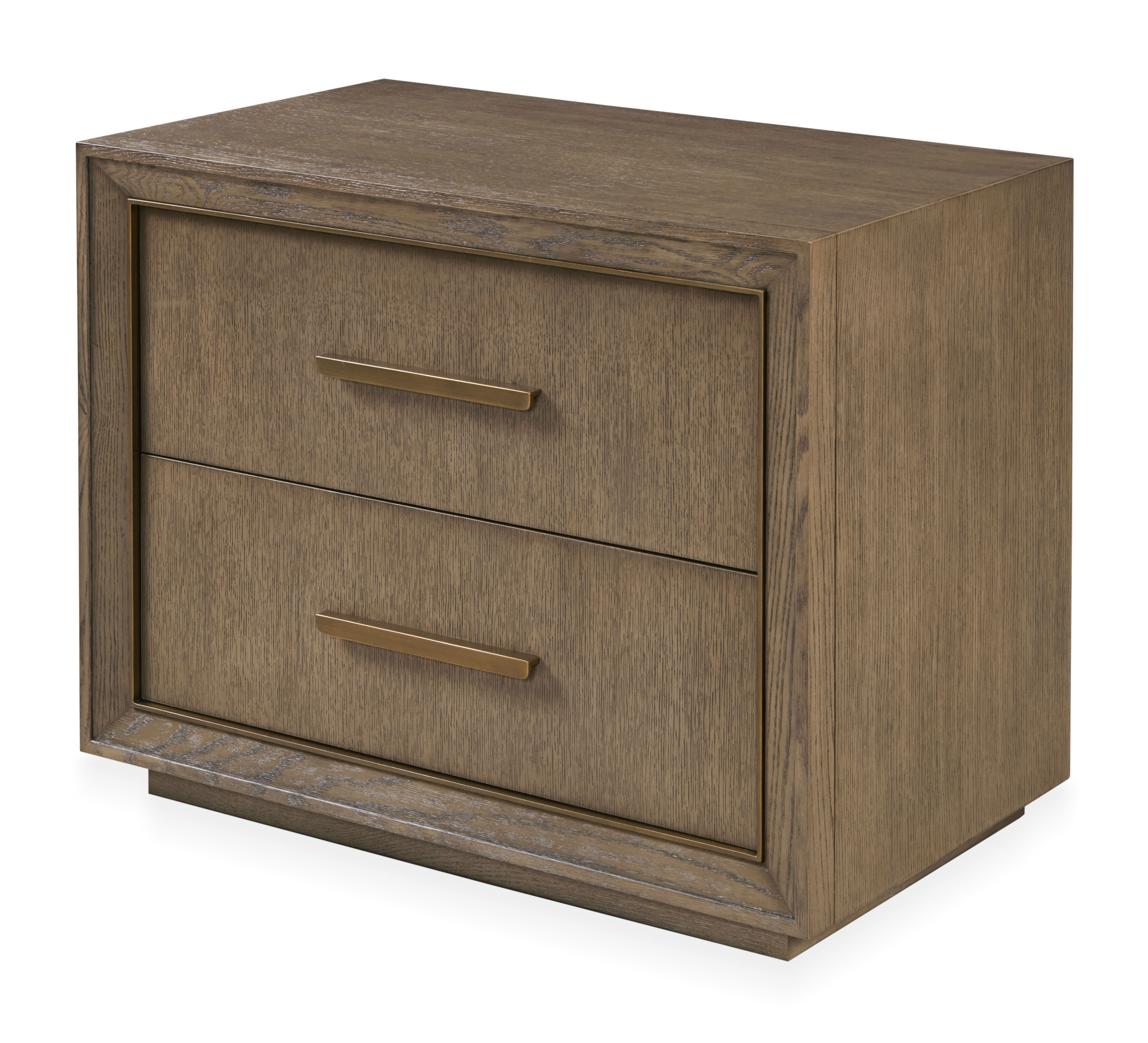 Our Kendall series reflects today’s casual contemporary lifestyle. Its understated, clean line forms, linear oak grain and soft gray finish offer a calming and welcoming vibe. Design features include straight grain oak doors and drawers, satin brass finished metal trim and decorative hardware and a plinth base. Each item is crafted of lightly wire brushed oak solids and veneers finished in a warm Camino gray stain. This nightstand features two drawers, perfect for bedside storage.