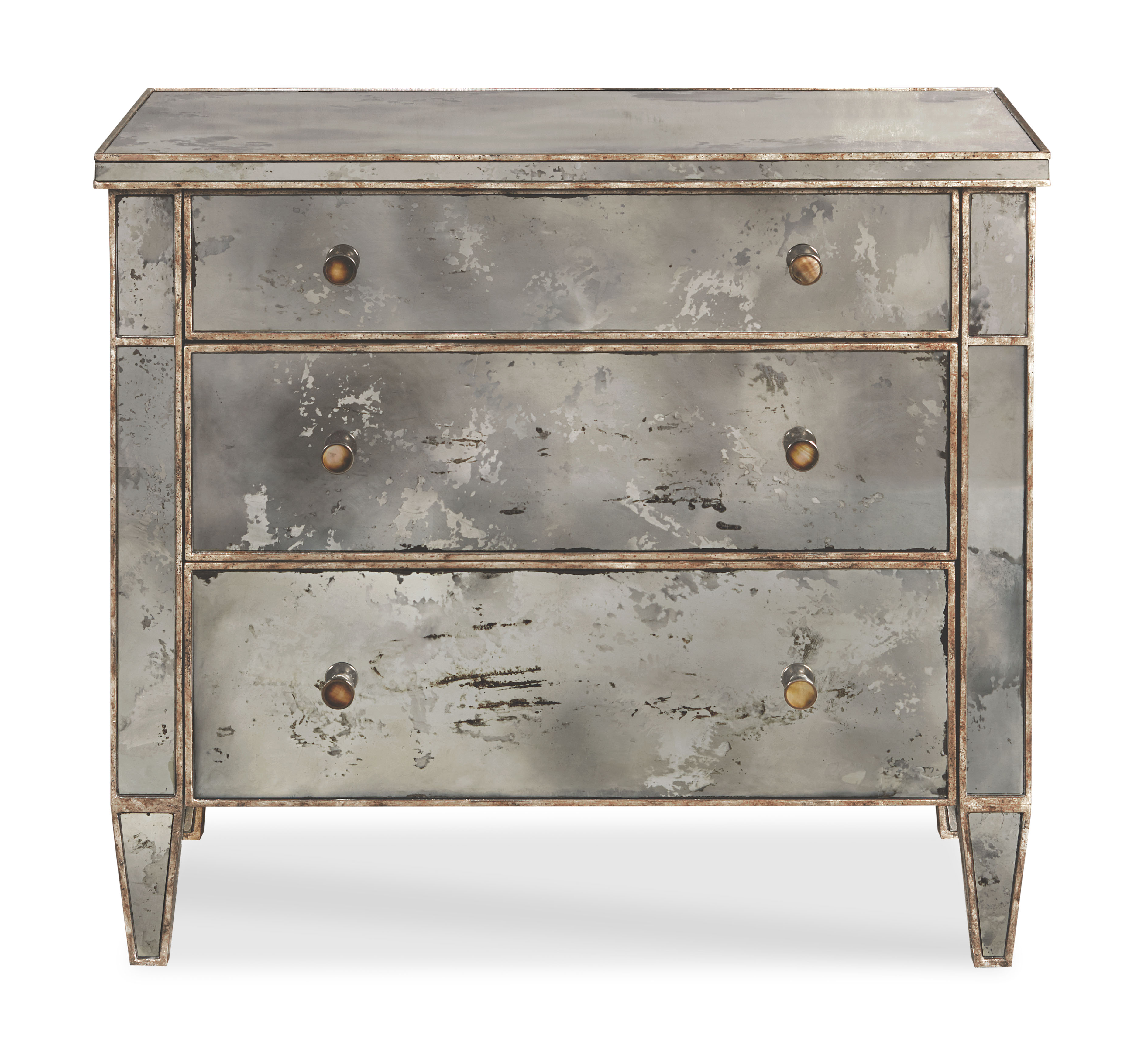 NOTE: AVAILABLE ONLY AS SHOWN Silver leaf and inlaid antiqued mirror on select Asian hardwood solids with brass hardware. Three drawers, Designed by Pride Sasser |