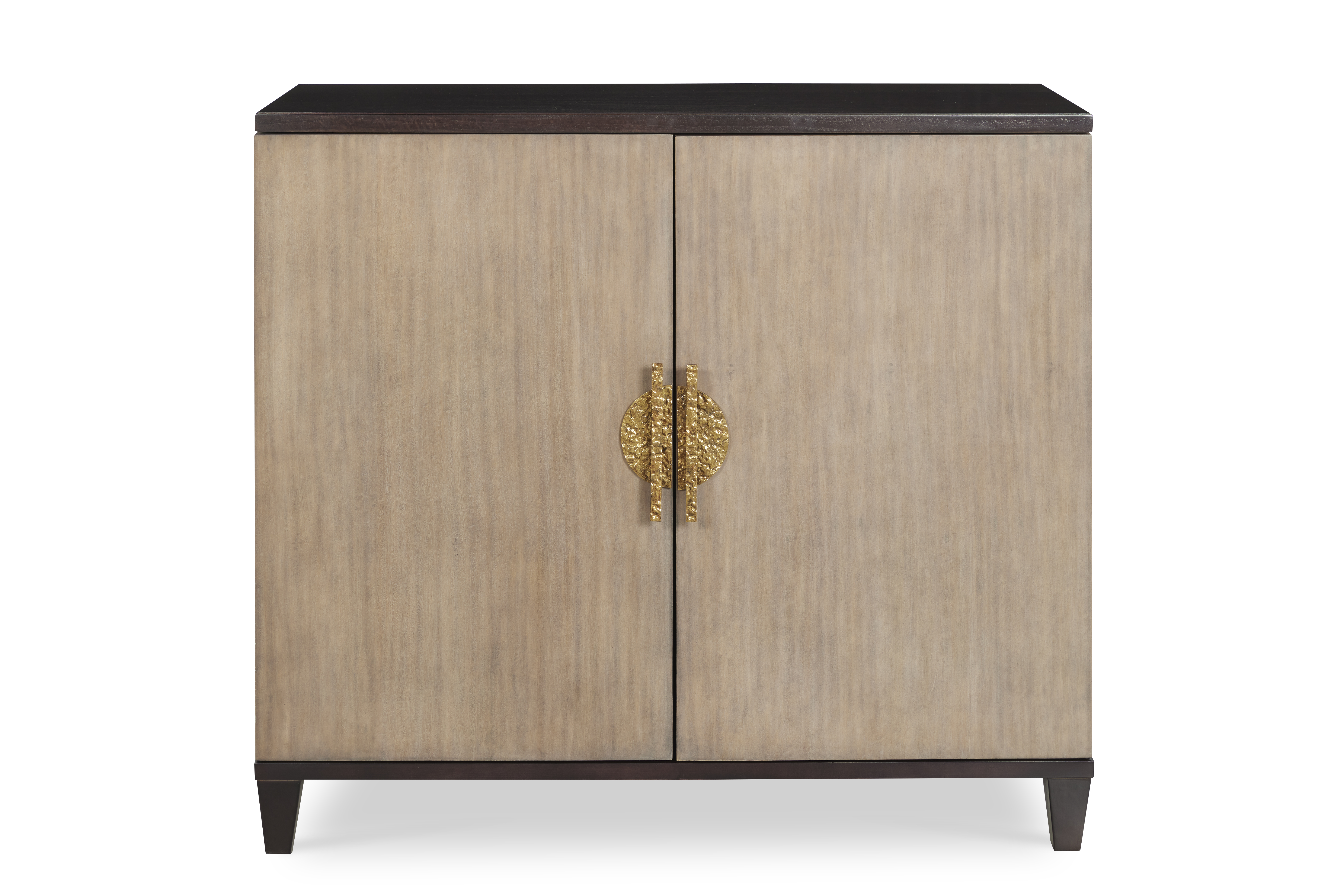 The Damon Two Door Chest is crafted from mahogany solids and Eucalyptus veneer finished in a grey wash finish on the body that is contrasted with a dark stained top and base. The hardware is cast in antique brass with a heavily textured back plate and rectangular bar pulls. Exposed hinges on the sides are also antique brass. Behind both doors are three deep storage shelves. On the left side are an open shelf above two drawers with an open space underneath, while on the right side a fixed upper shelf sits above two adjustable shelves.