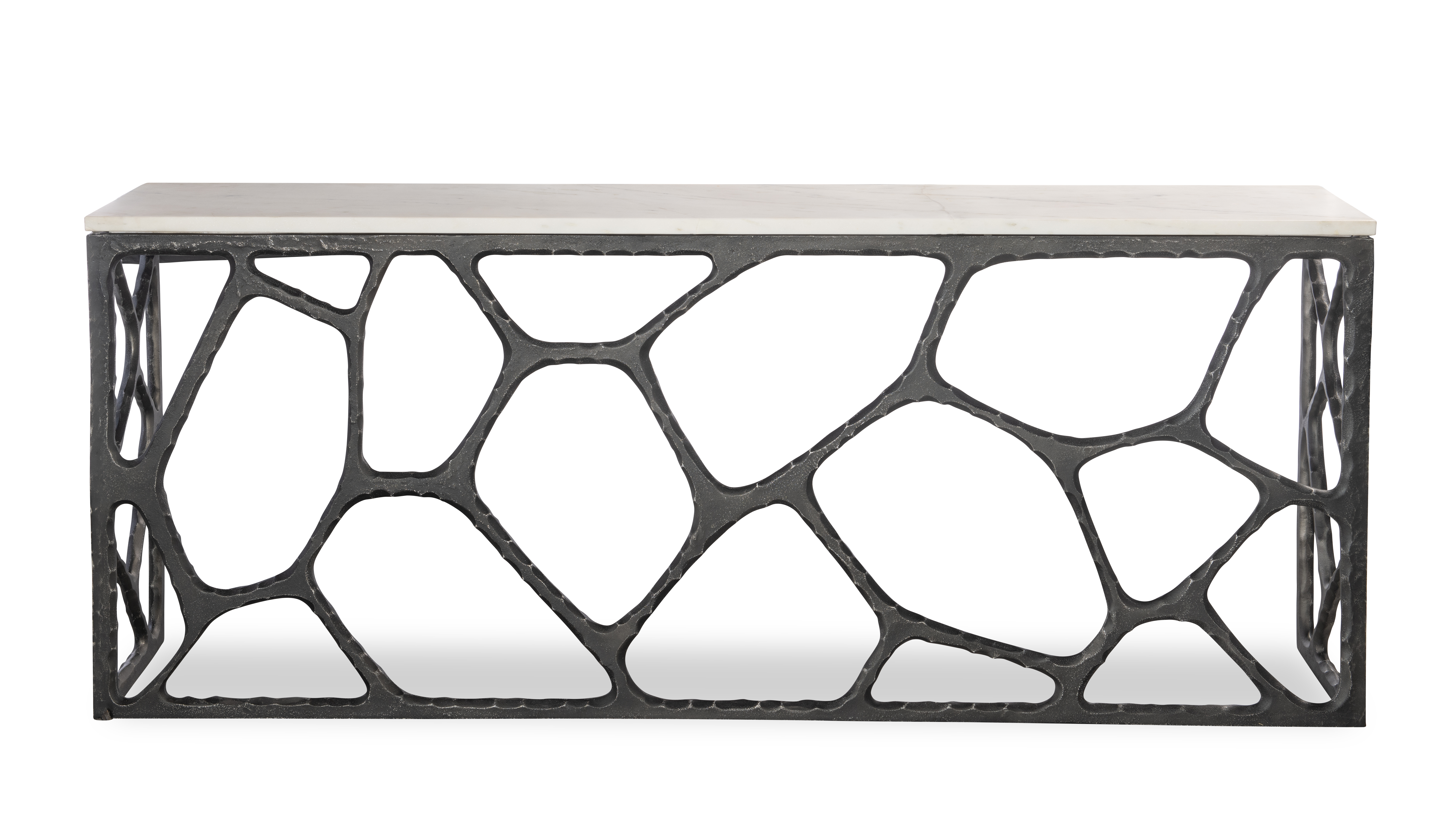 The Zane Console features a textured oil rubbed bronze metal base designed in an organic and asymmetrical webbed pattern. The top is white marble creating a beautiful contrast.