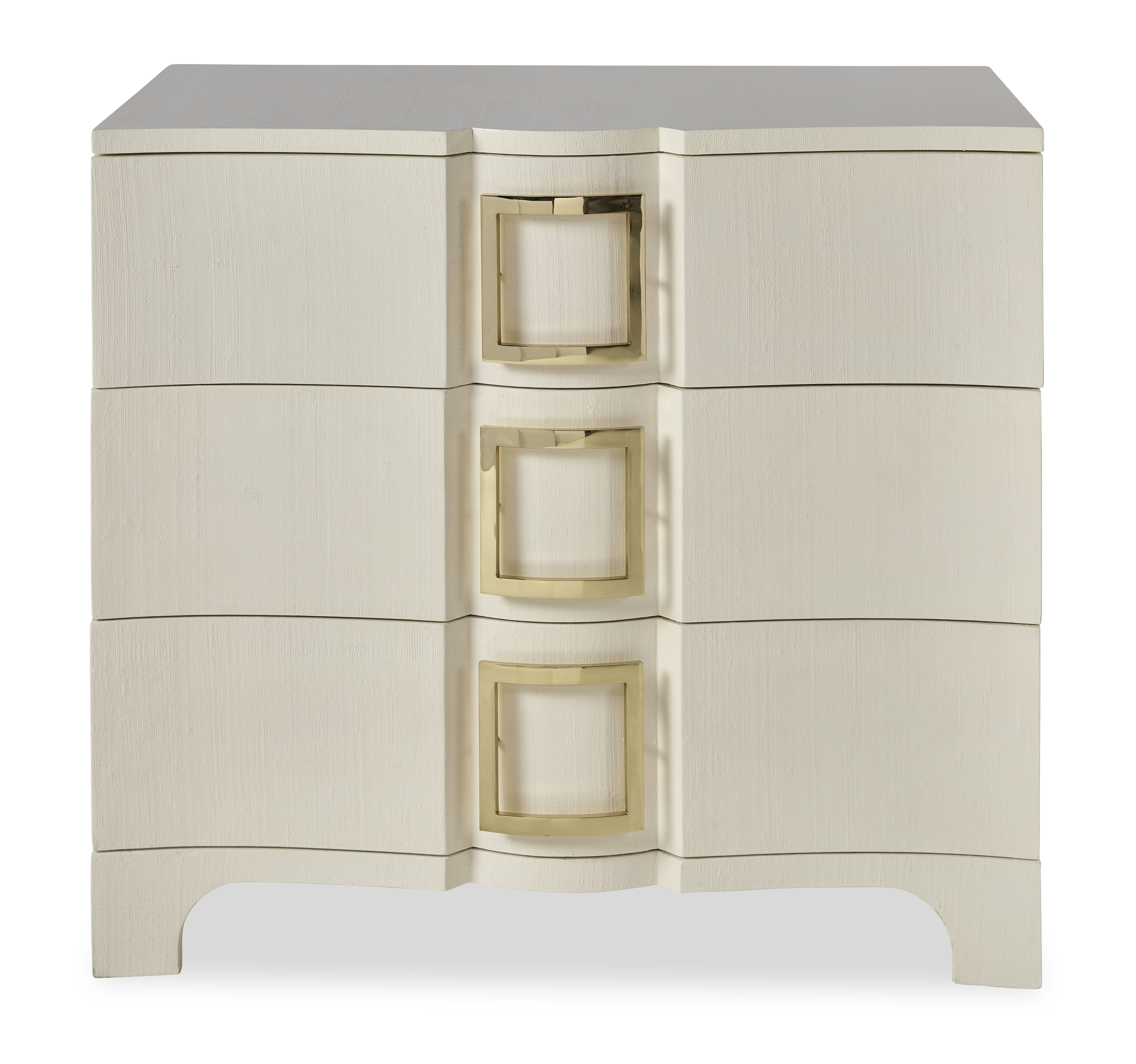 Fully wrapped in tightly woven, highly lacquered white raffia with polished brass pulls. Three drawers |