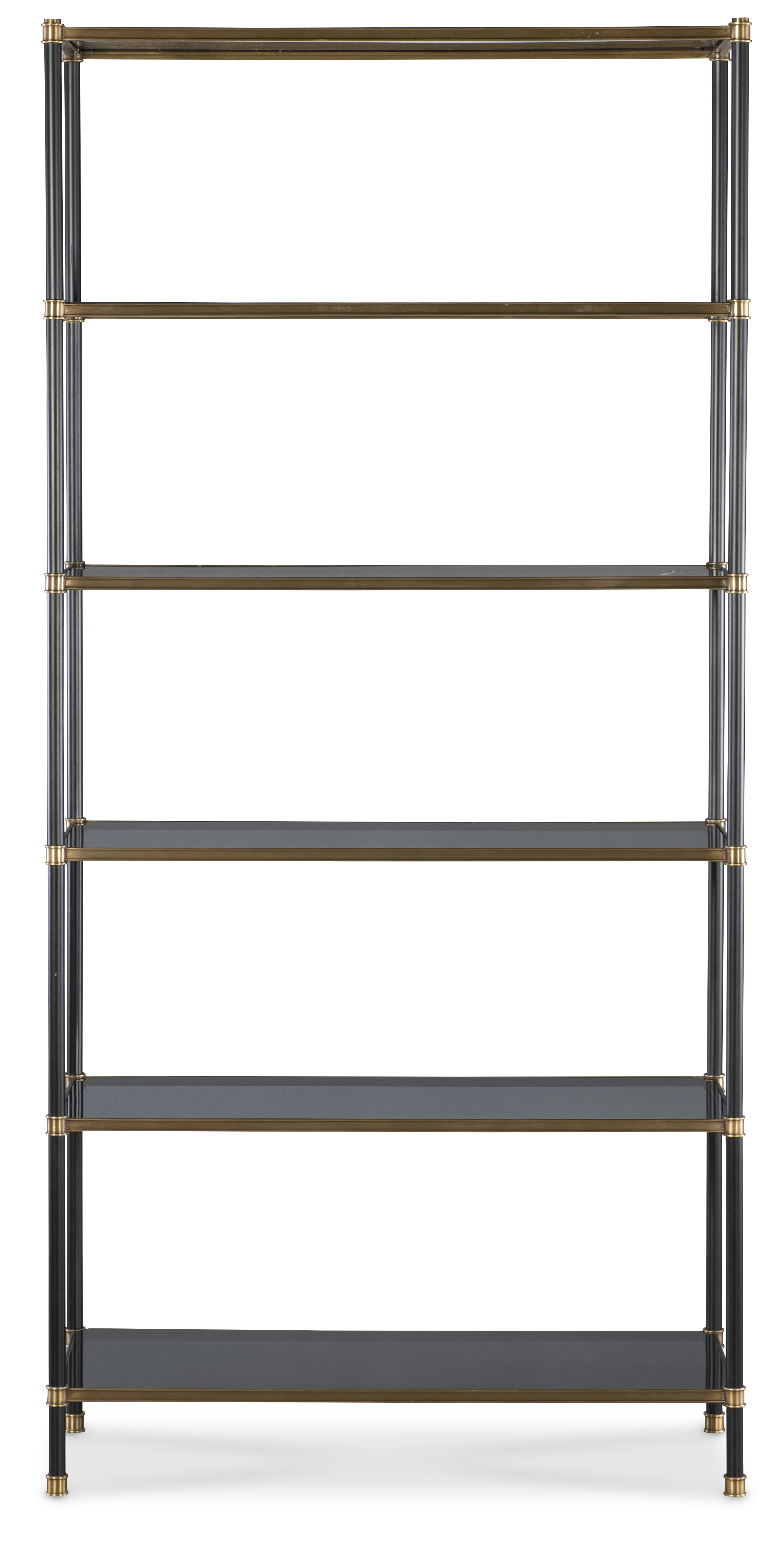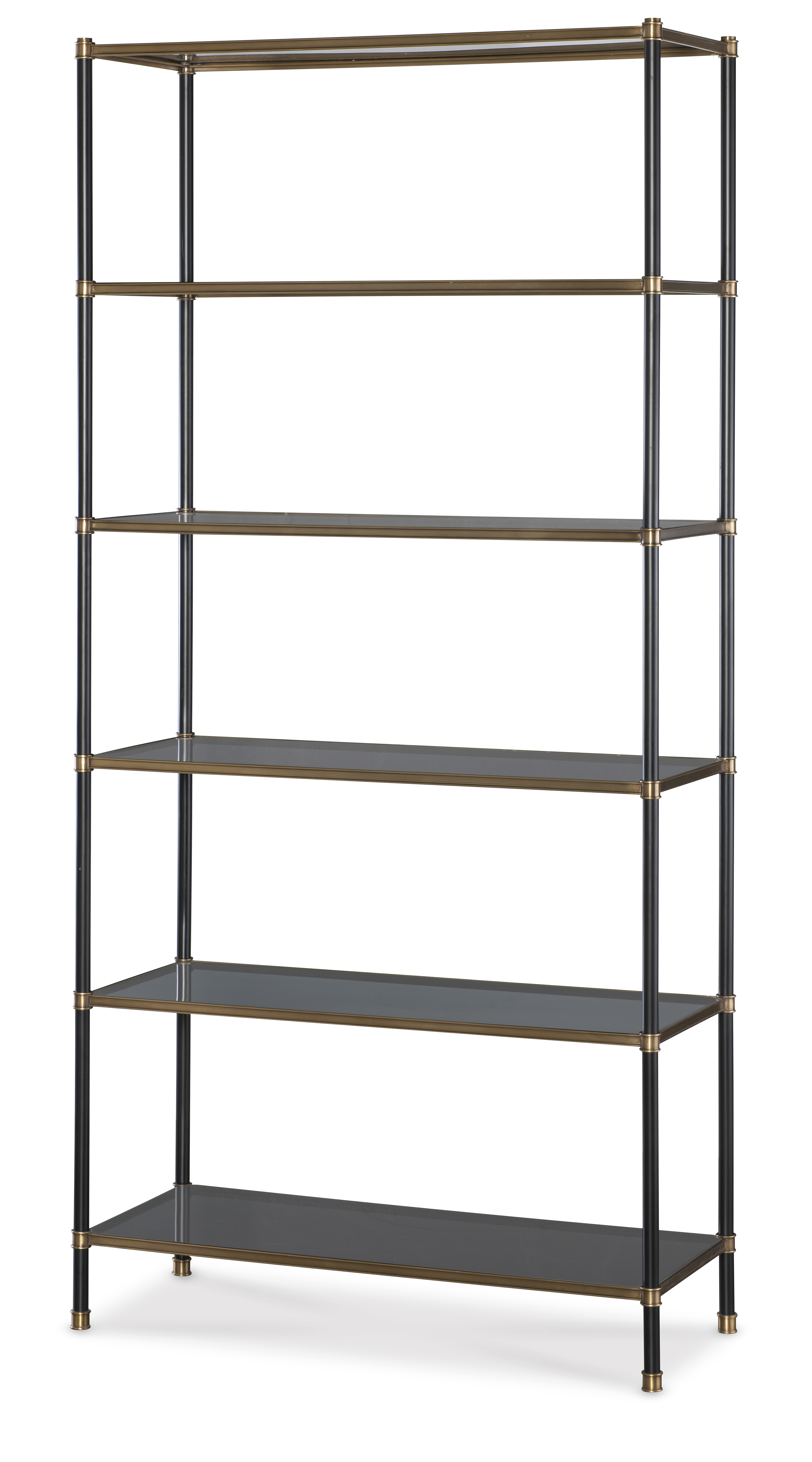 Smoke grey glass top and shelves supported by Bronze metal uprights with Brass surround and ferrules |