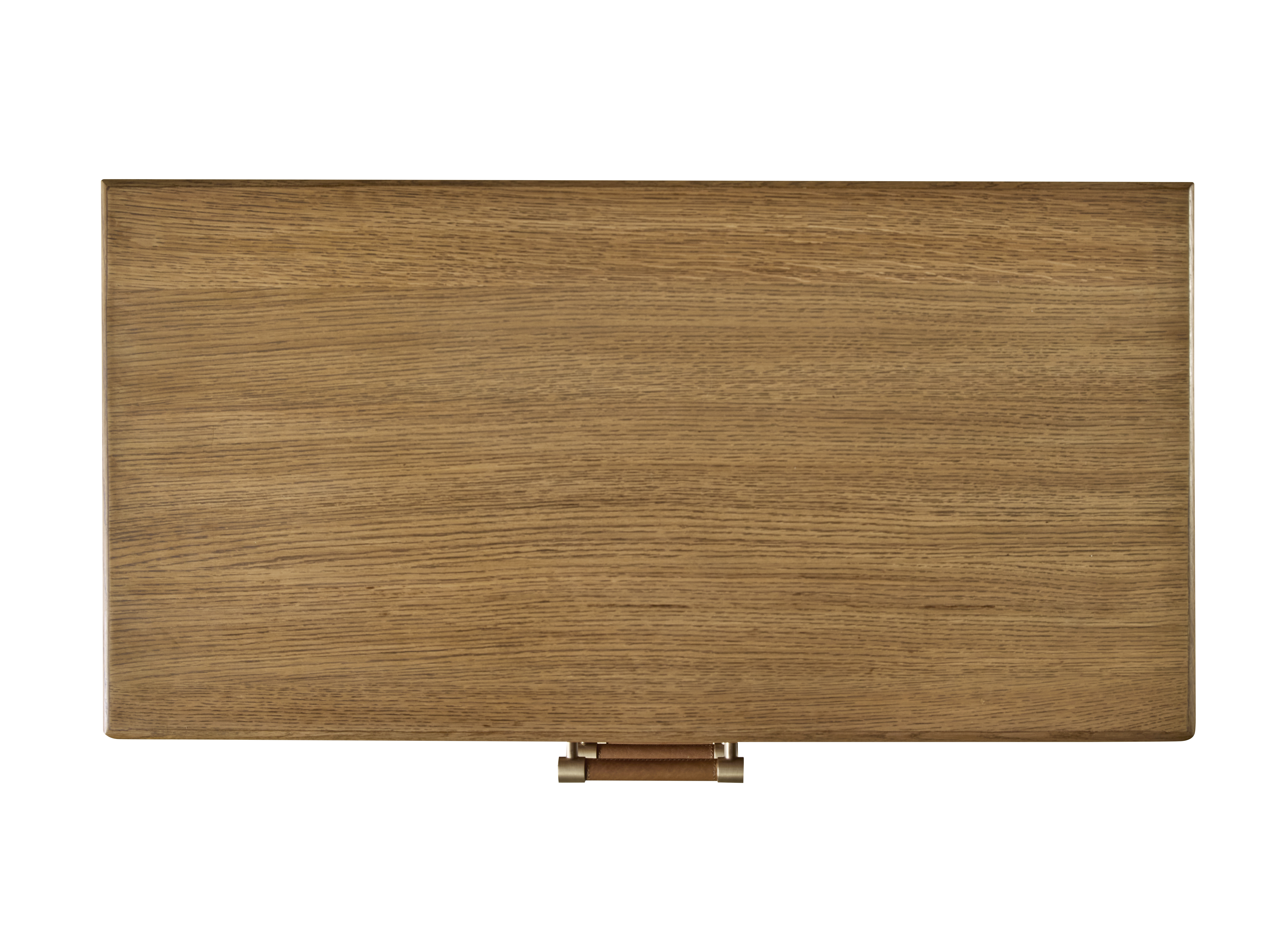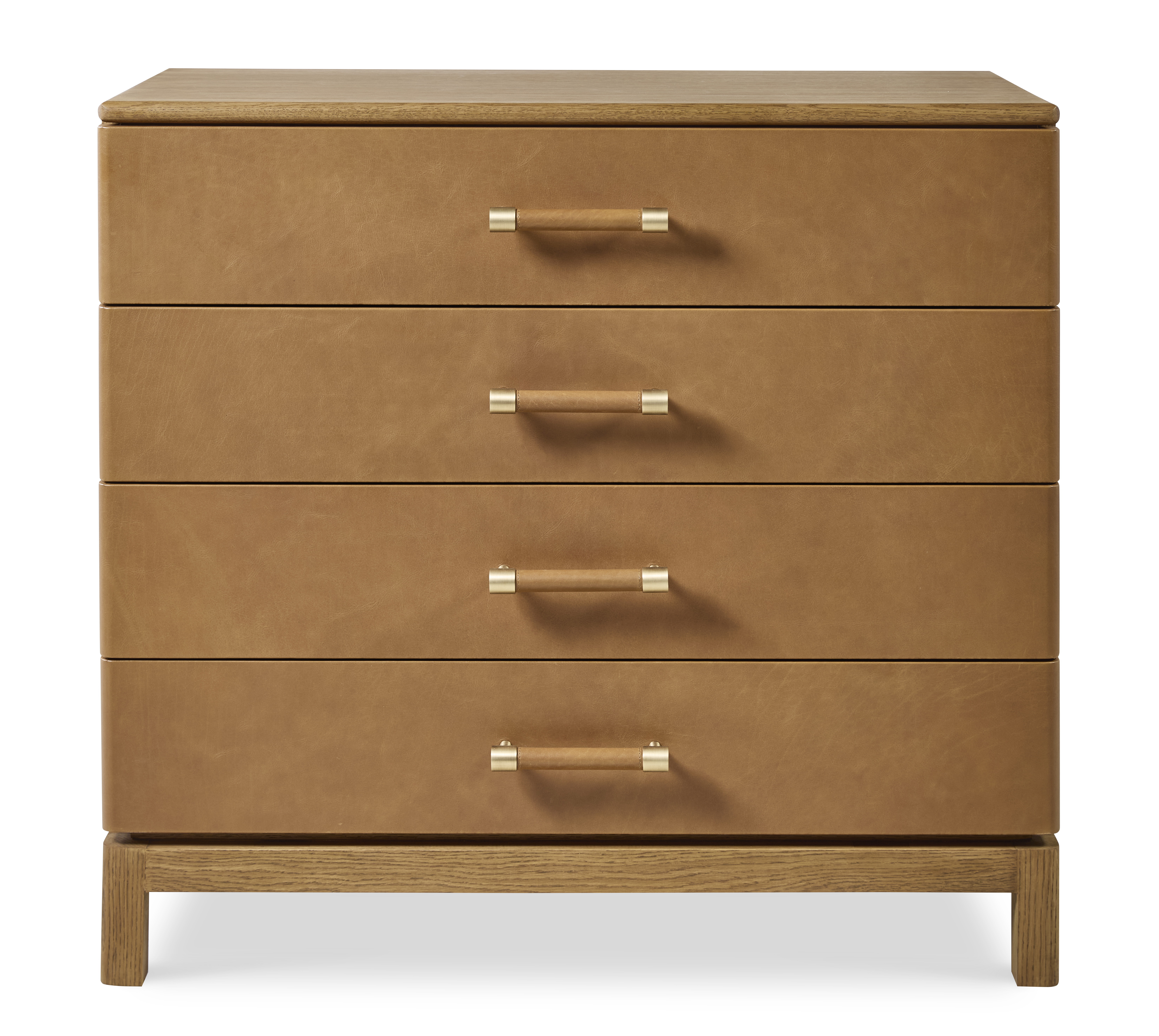 Four soft-close drawers wrapped in tan leather and leather covered hardware with Brass accents. A natural, wood-stained Oak case Tip restraint included |