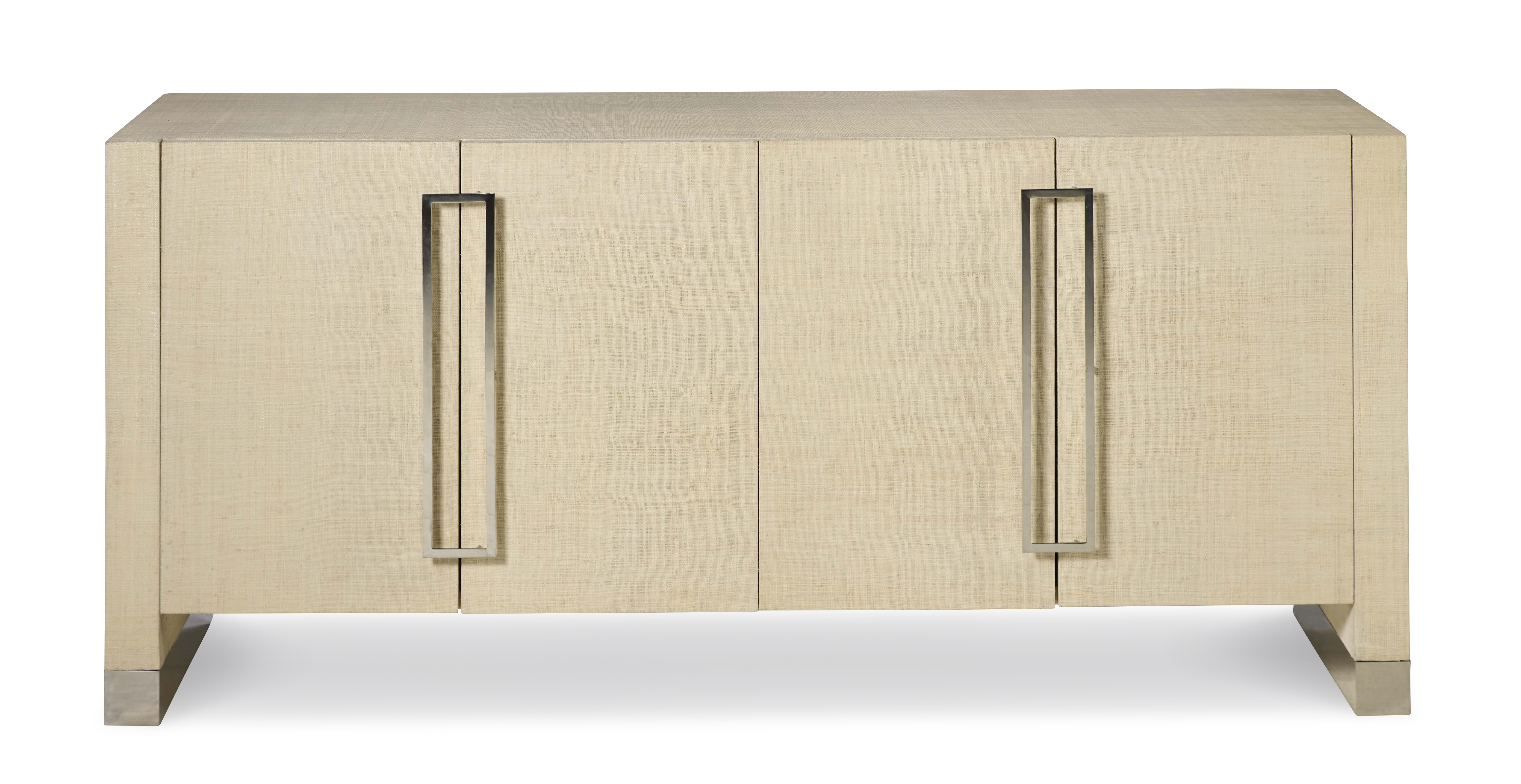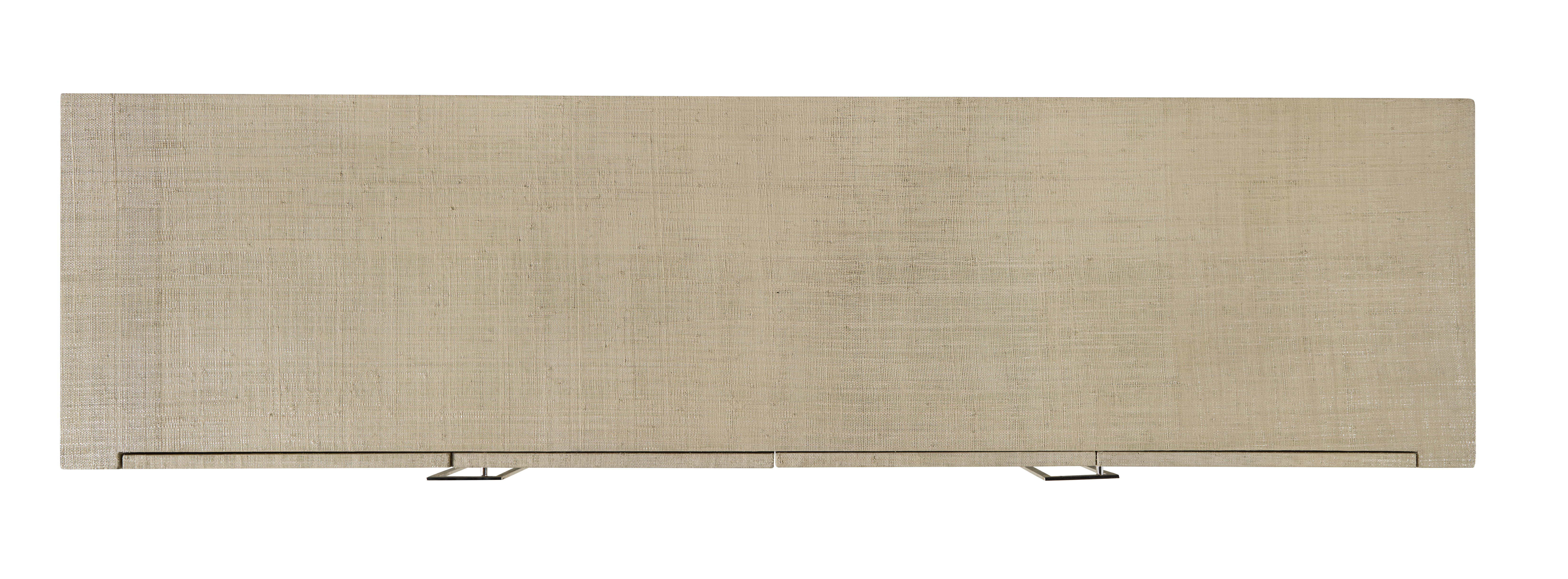 Fully wrapped in a cream raffia with polished nickel hardware and base accents. Behind each set of two doors is one adjustable shelf |