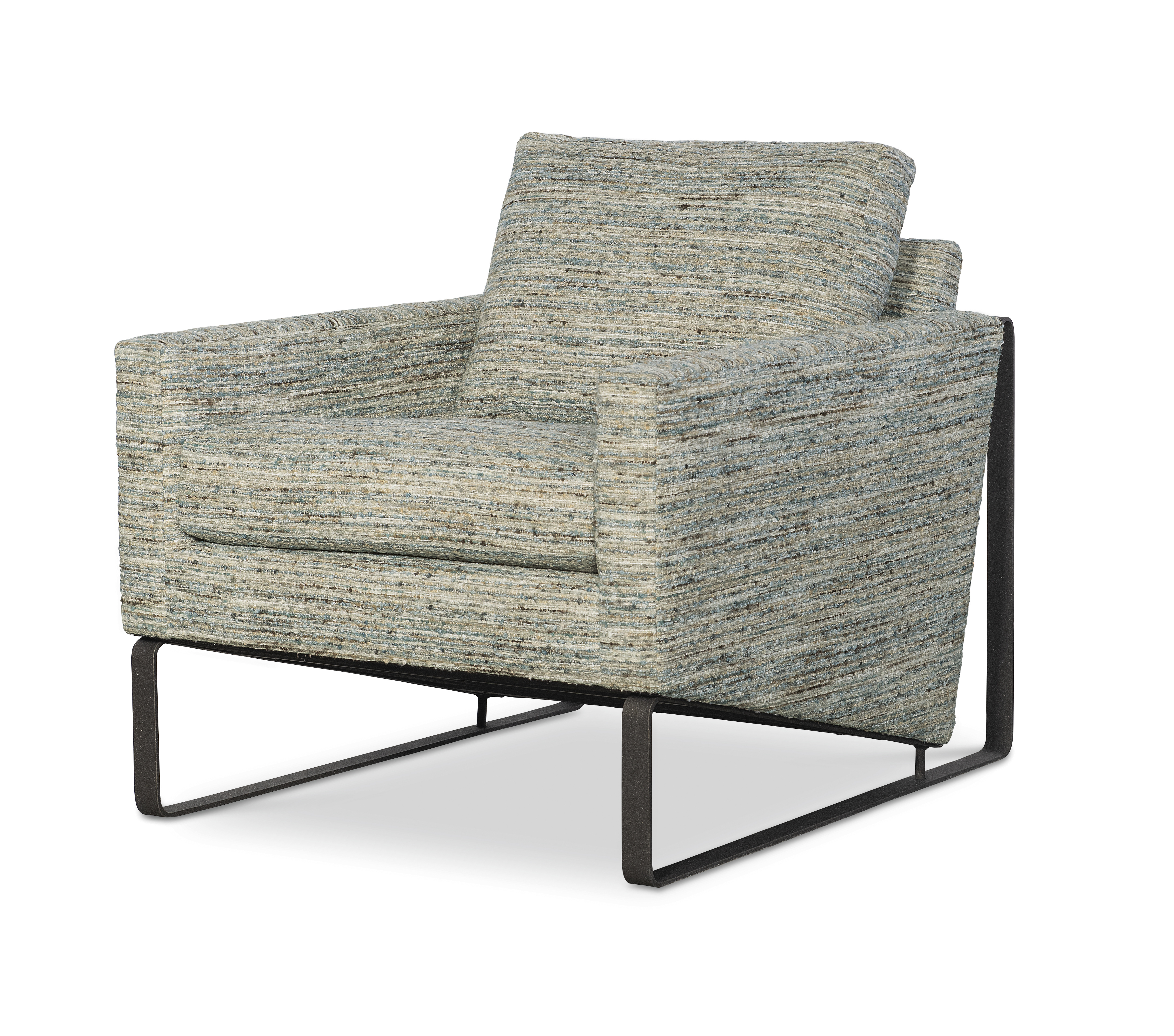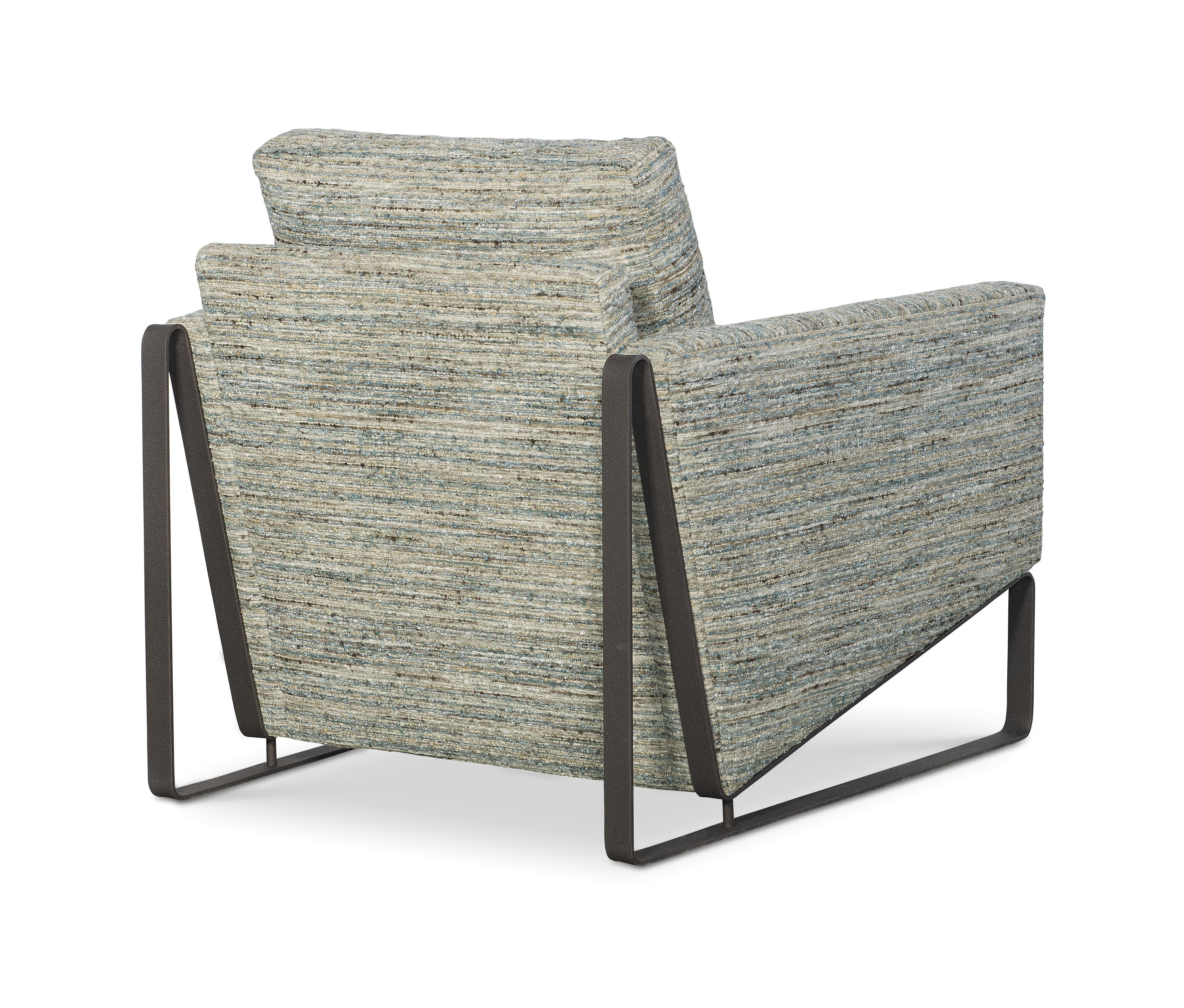 The Dobie is a transitional design. It features a bronze “hair pin turn” iron base that races down the back and rises with the pitch of the seat, narrow track arms flank the loose weltless box seat and back cushion. No finish options on the metal base.