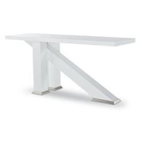 This elegant "cantilever" of a table is a marvel of engineering. Three "legs" originate at the same end of the table: two shorter vertical supports flanking a longer diagonal one that reaches almost to the opposite end. Beautifully figured Eucalyptus veneers envelop the piece and it rests on nickel toned metal feet. Stocked in Sable, a warm brown stain shown here. Also available in other finishes.