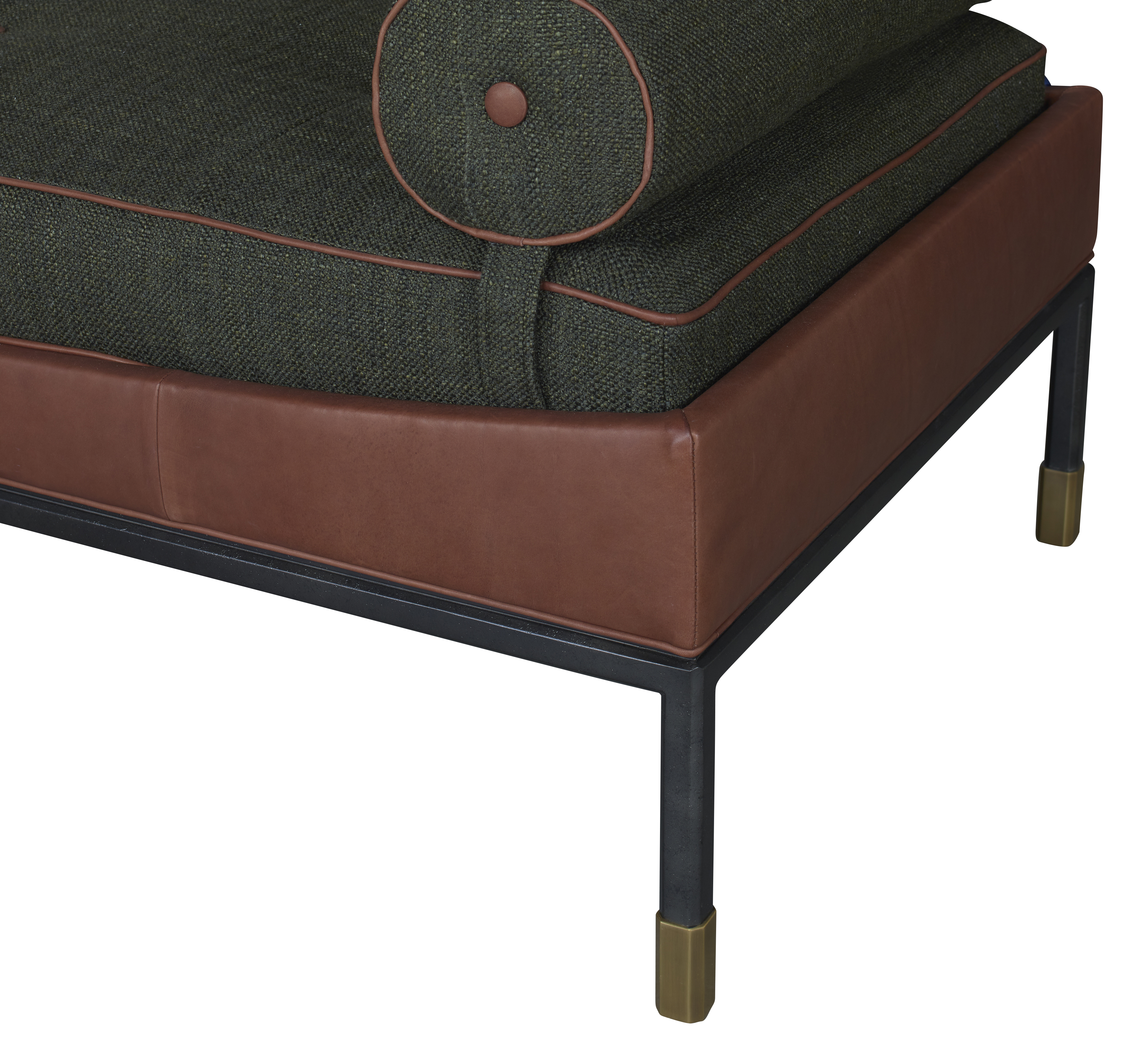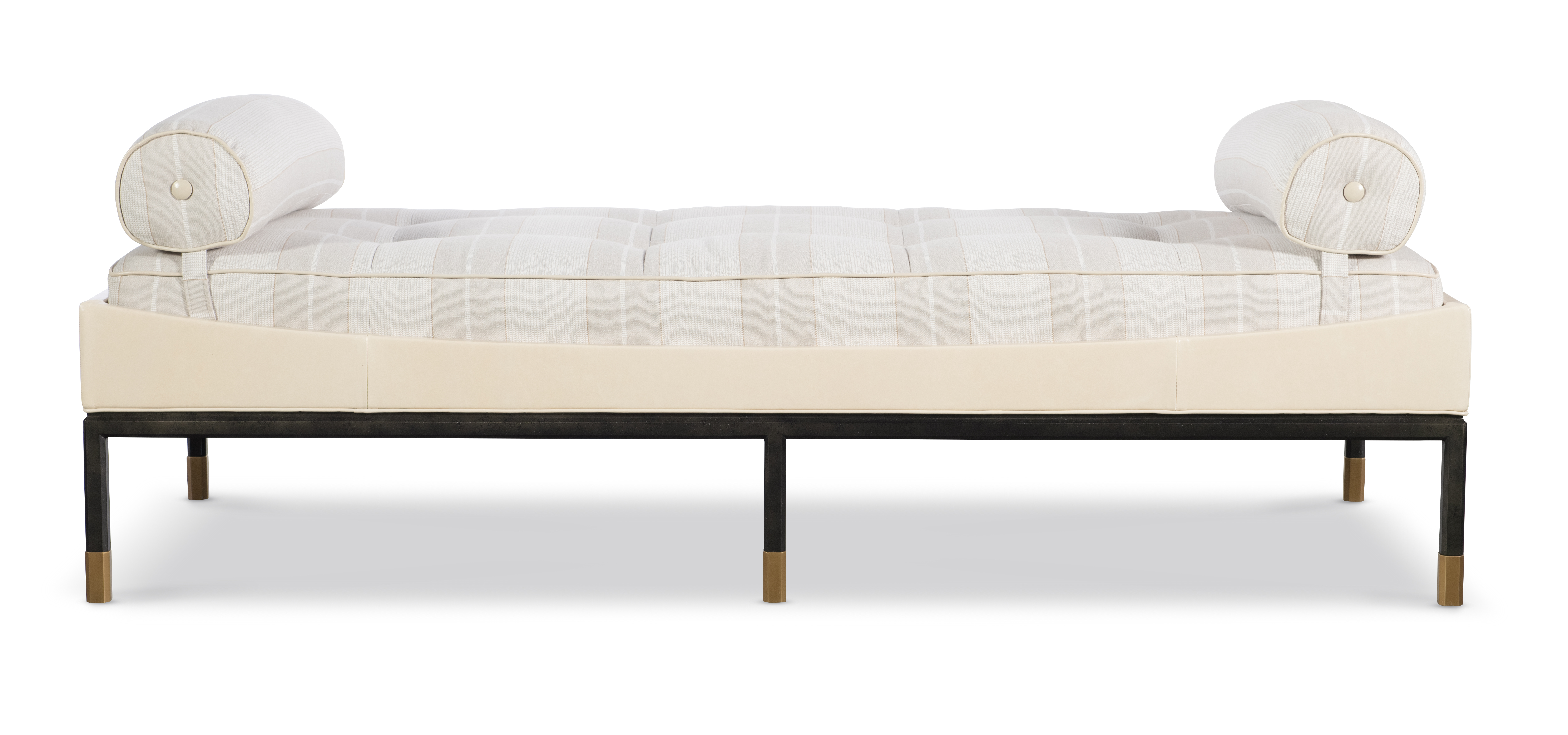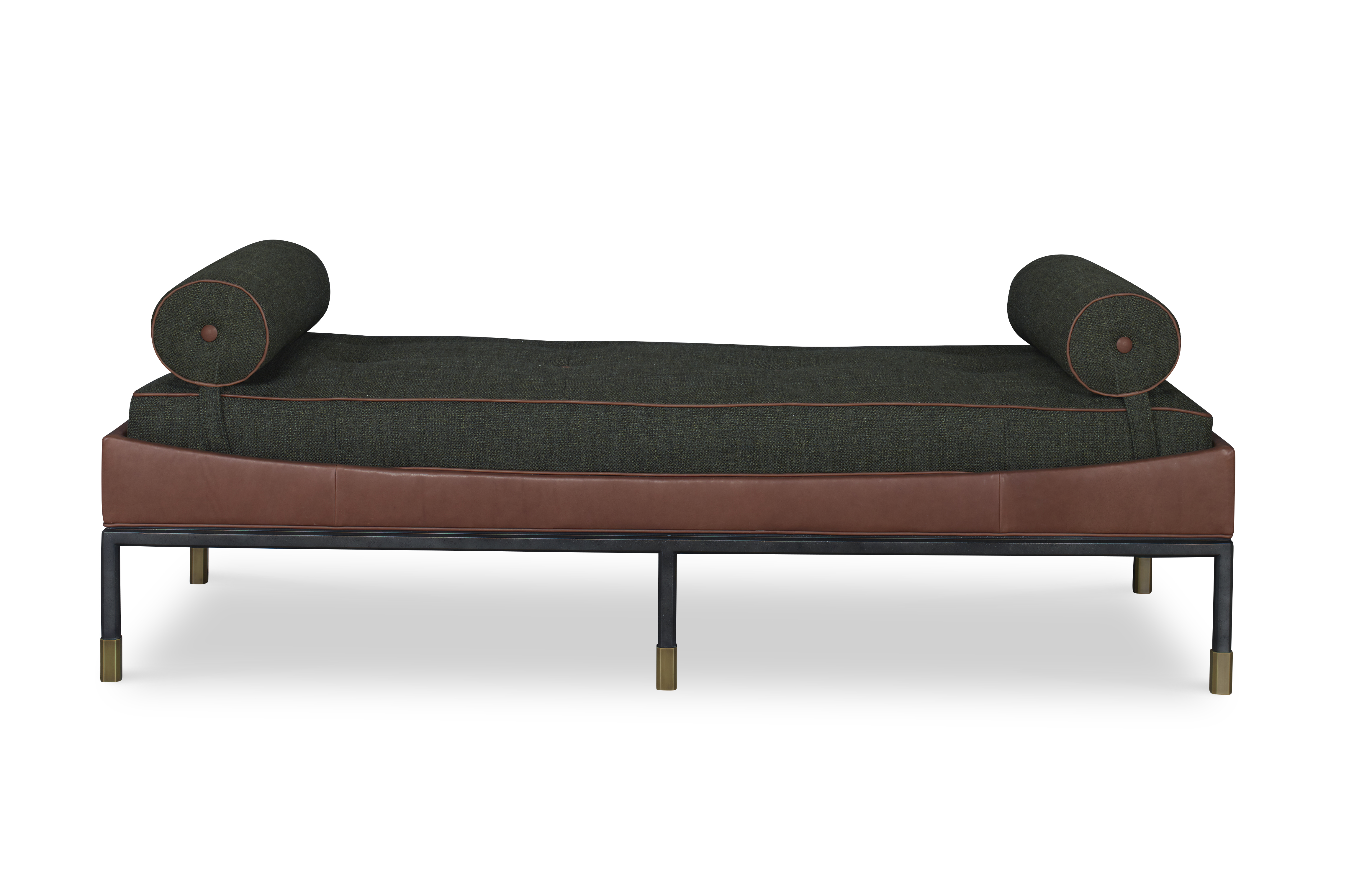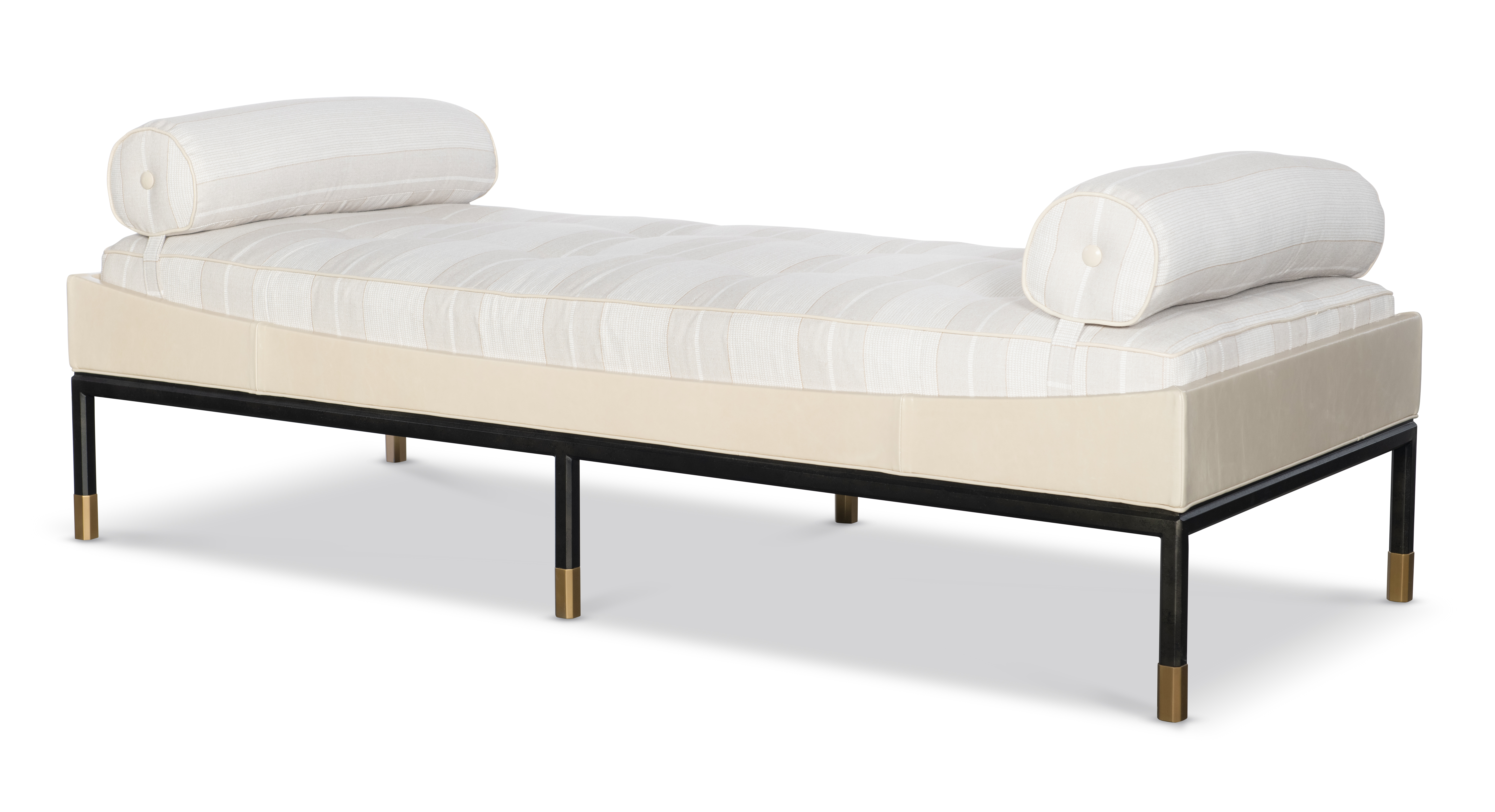 The Jennings Daybed is a very unique new upholstery shape on a hexagon faceted iron base with elegant base foot details. This upholstered box tufted seat sits within a slender upholstered box with a gently curved detail. It was inspired by a Danish modern form from the 1960’s that is embellished with these special metal details and unique upholstery ideas. Two bolster options exist –round and boxed. The opportunities for two tone upholstered combinations are endless.