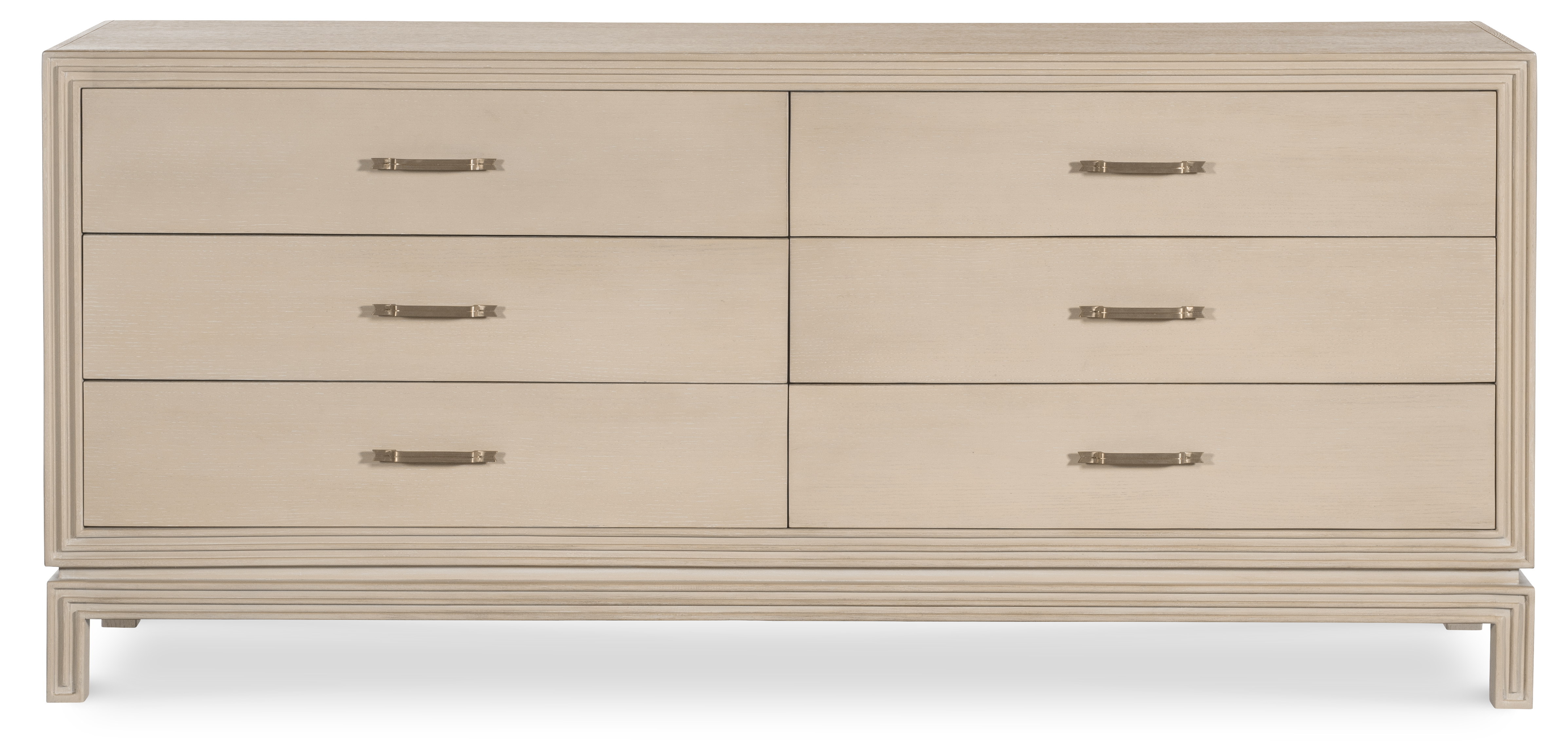 A linear carved border wraps each side of our Deco inspired Lewis Collection, framing every elevation. The same striking carving is replicated in the base, with the case floating above separated by a reveal. The brass hardware with ribbon detail compliments the border design and adds vintage flair. The inset drawers speak to old-world craftsmanship.