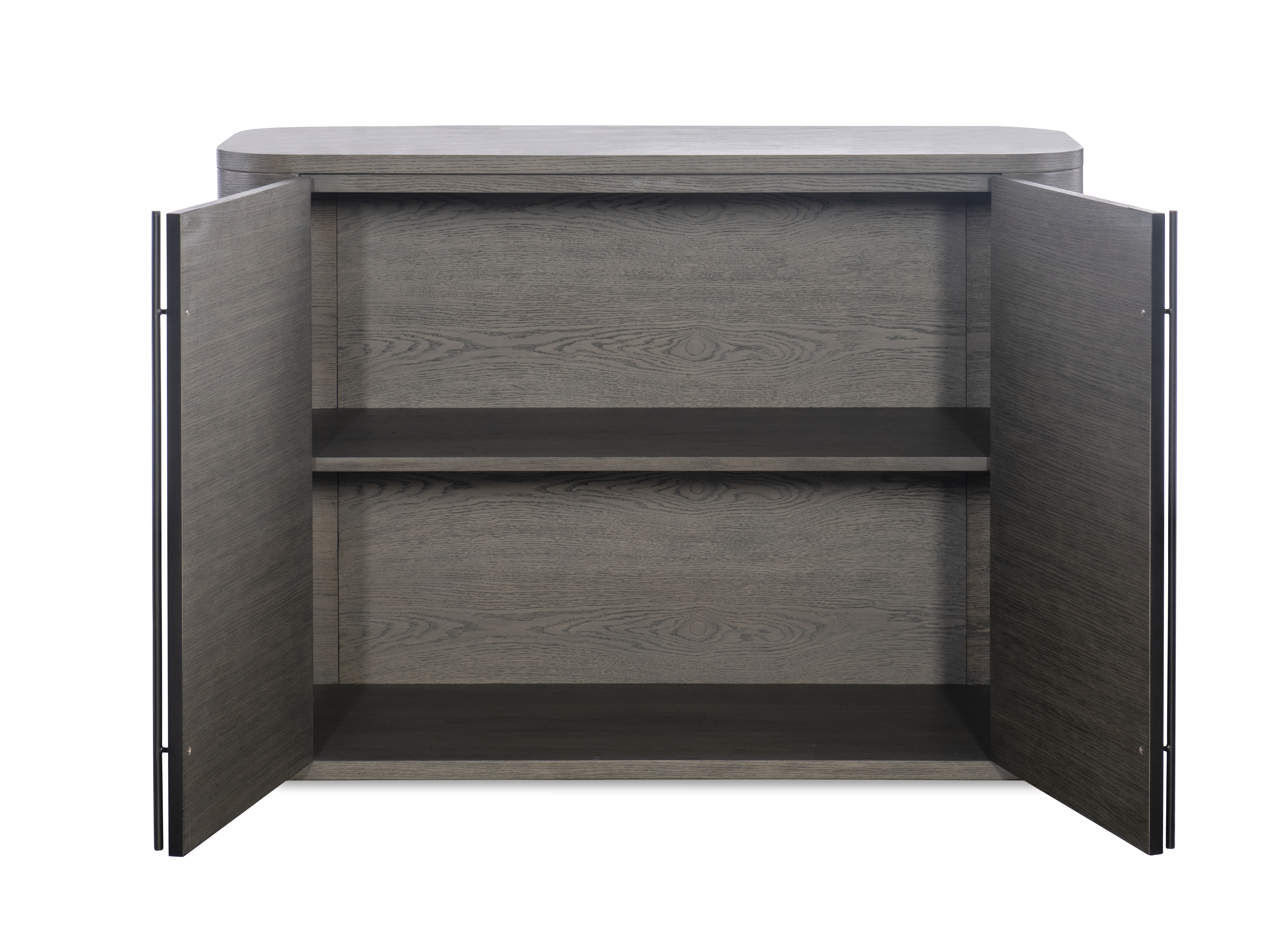 Behind two doors featuring dark bronze hardware, is an adjustable shelf |