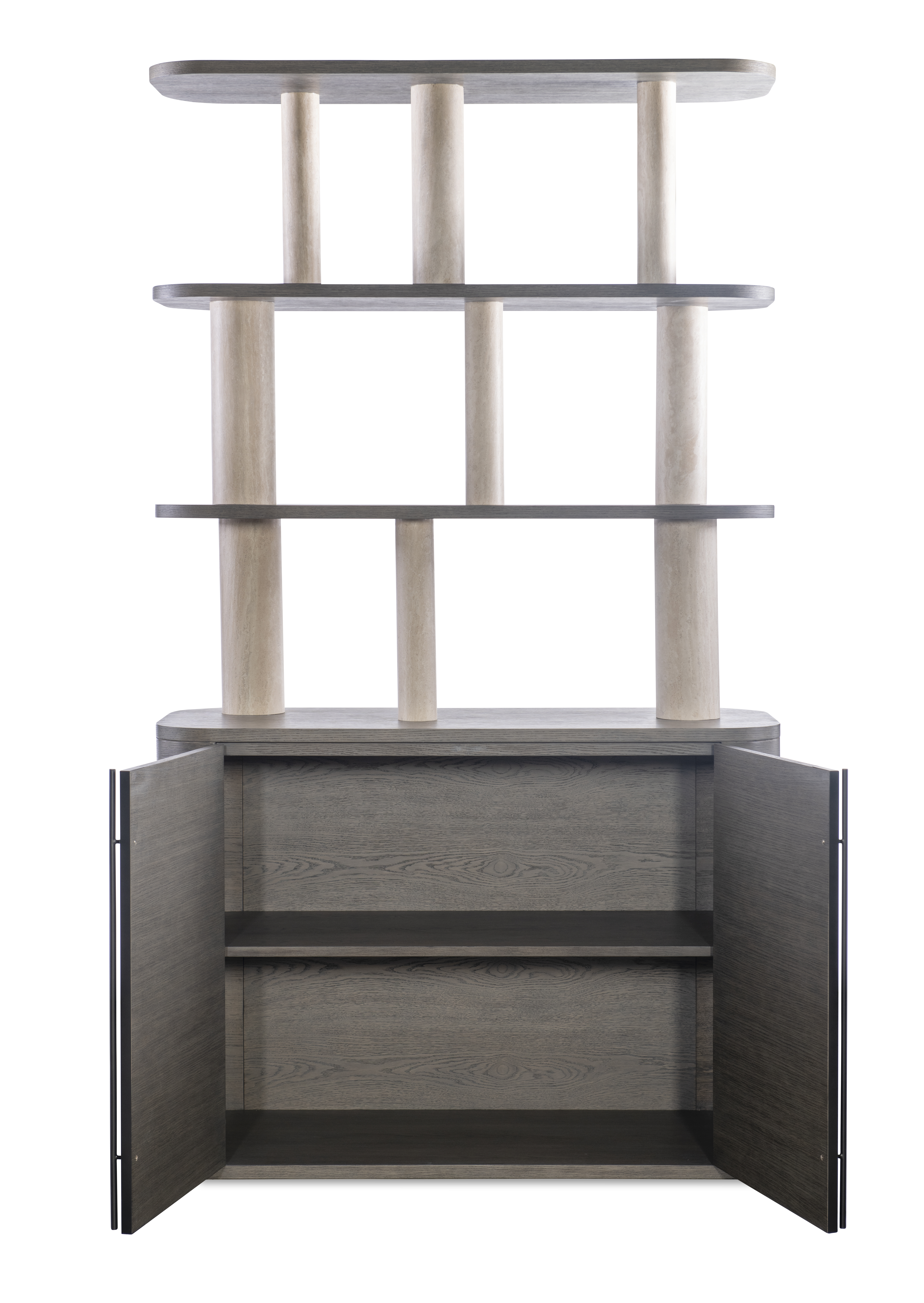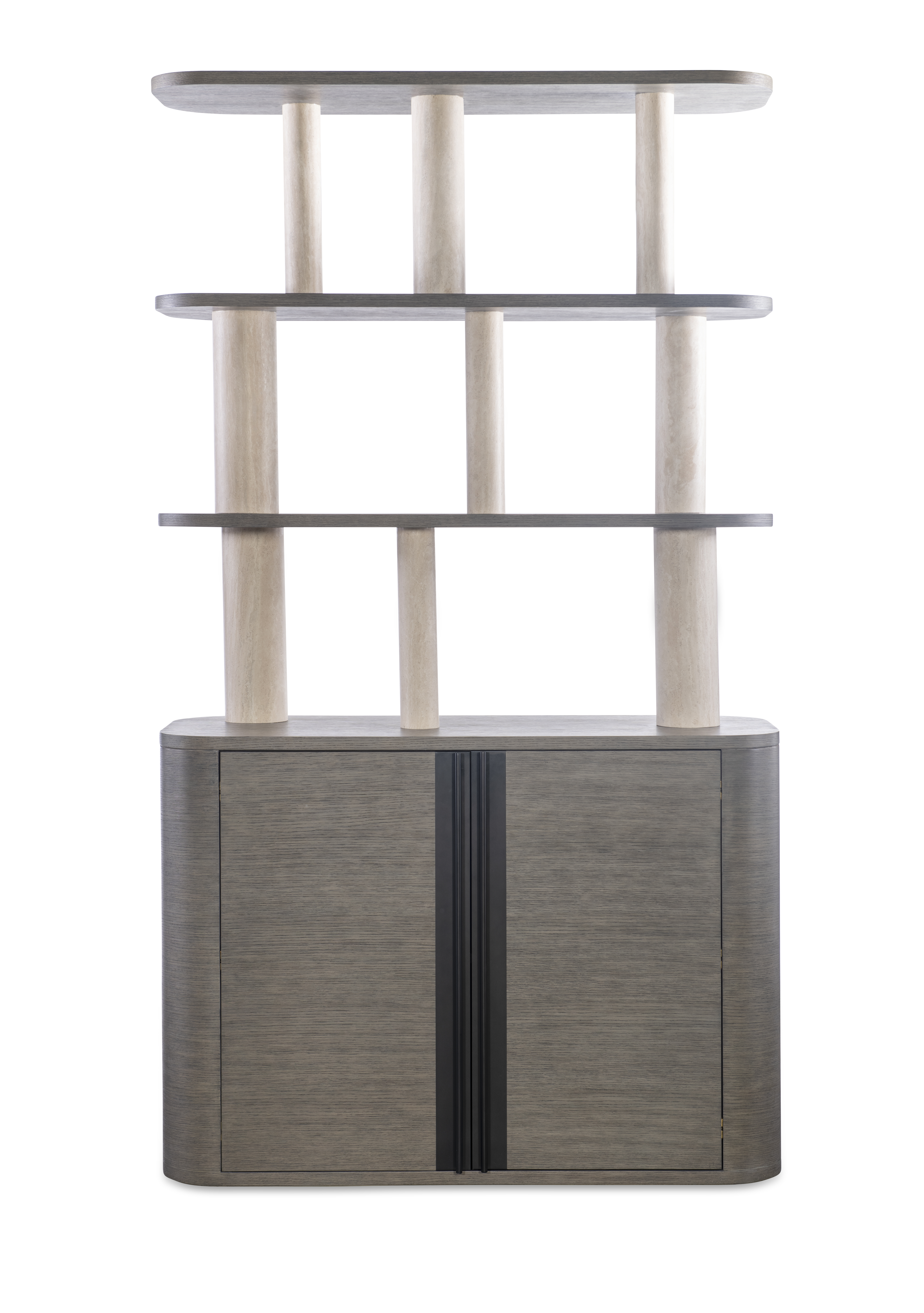 Three fixed shelves accented with travertine columns. Below with dark bronze hardware is two doors with a single fixed shelf |