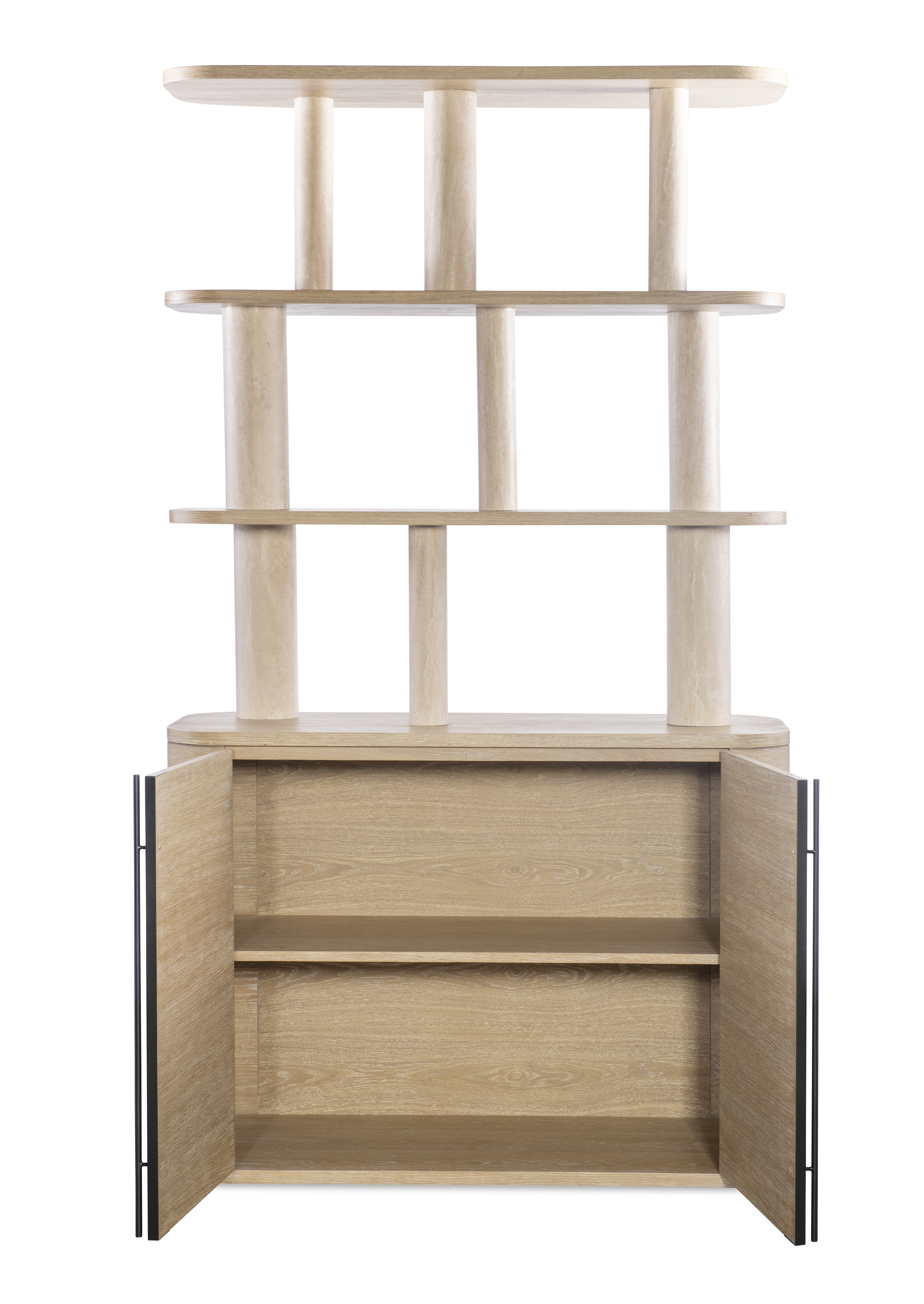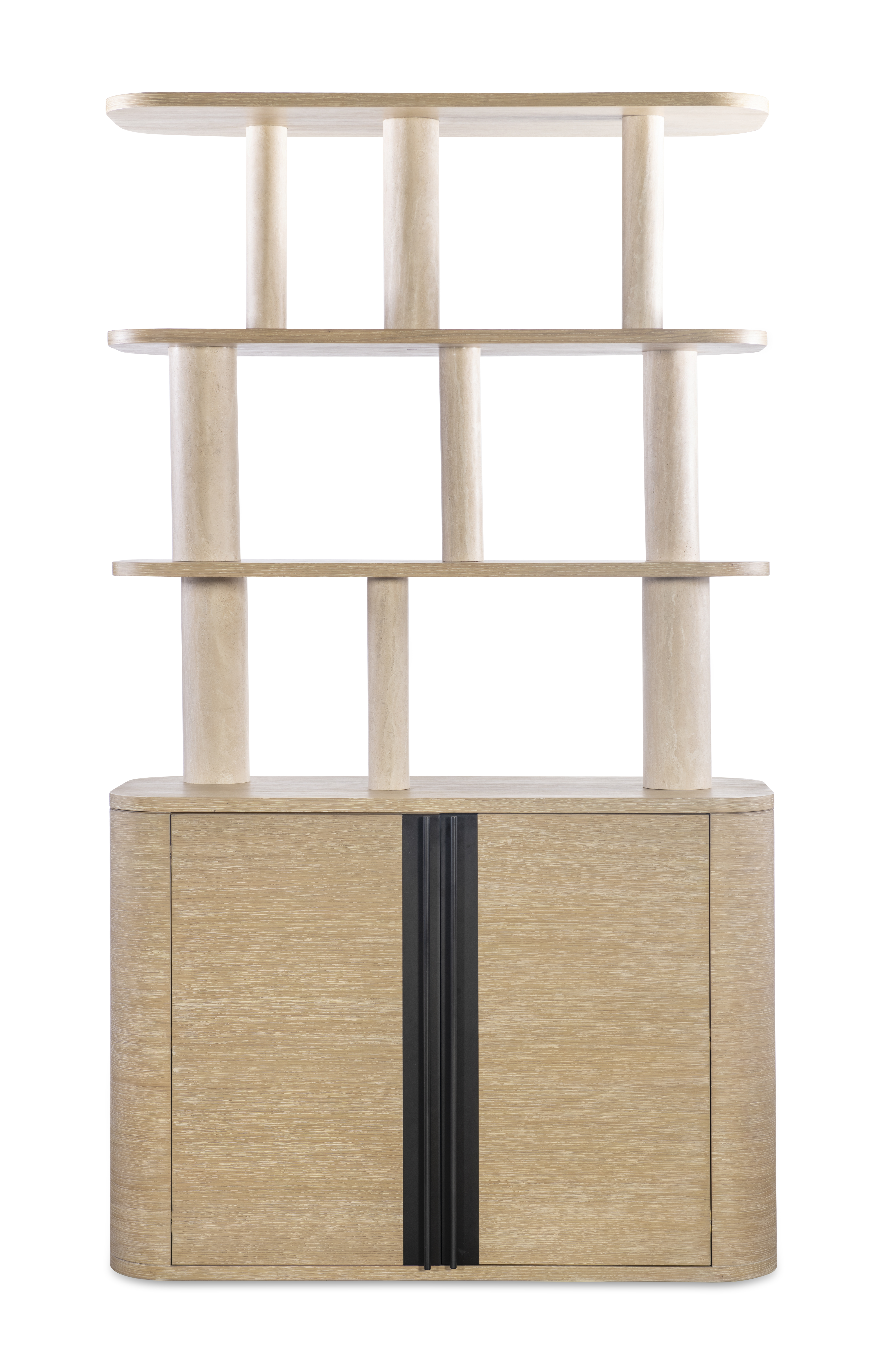 Three fixed shelves accented with travertine columns. Below with dark bronze hardware is two doors with a single fixed shelf |