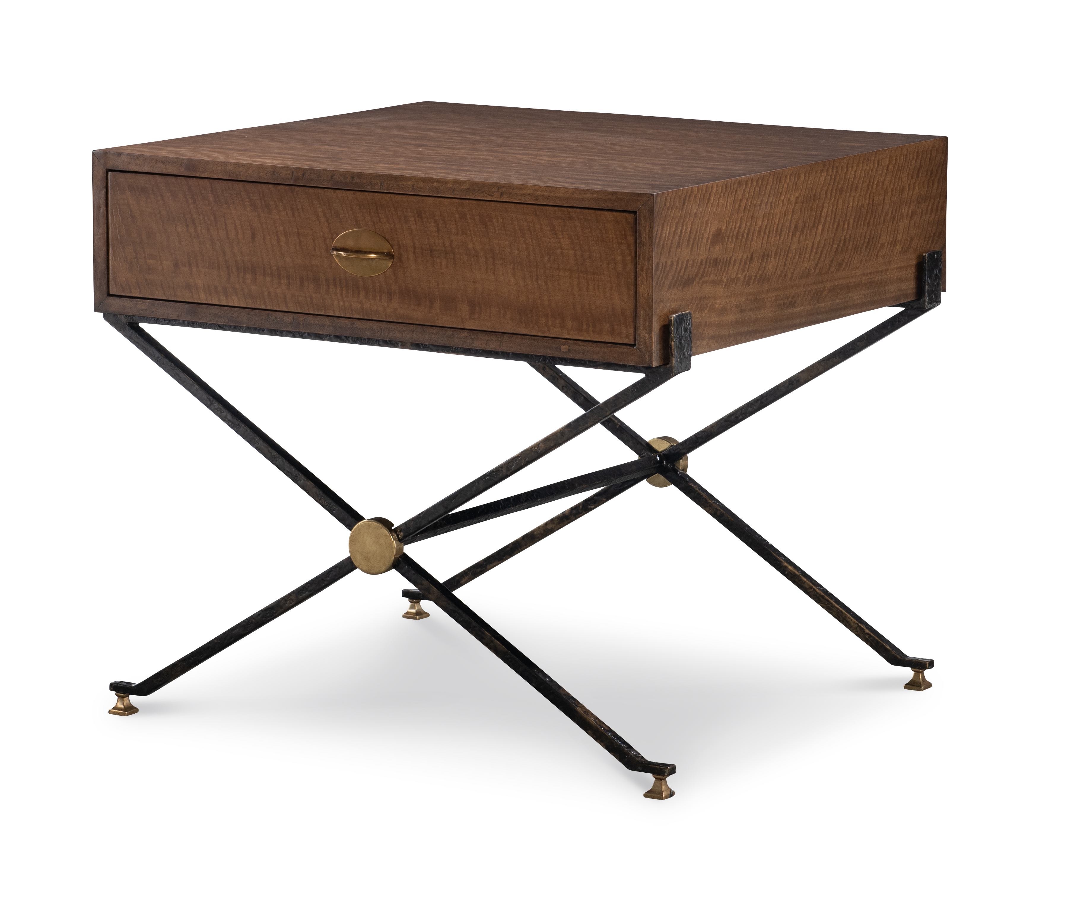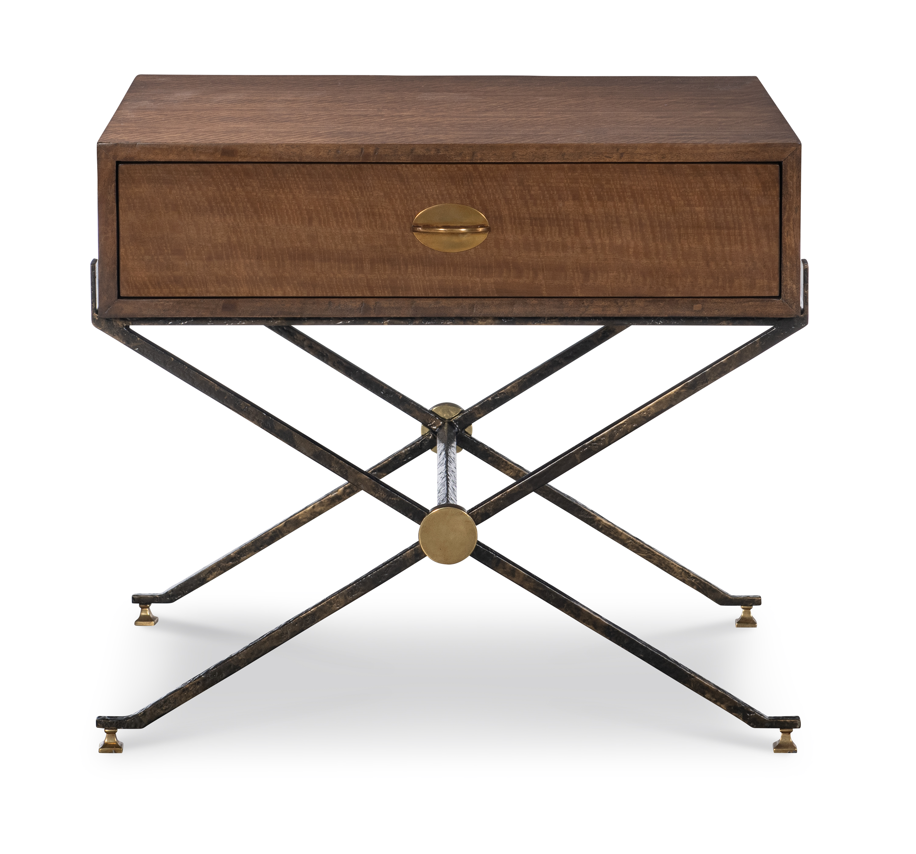 Single soft-close drawer with antique brass finish hardware on a textured bronze metal base |