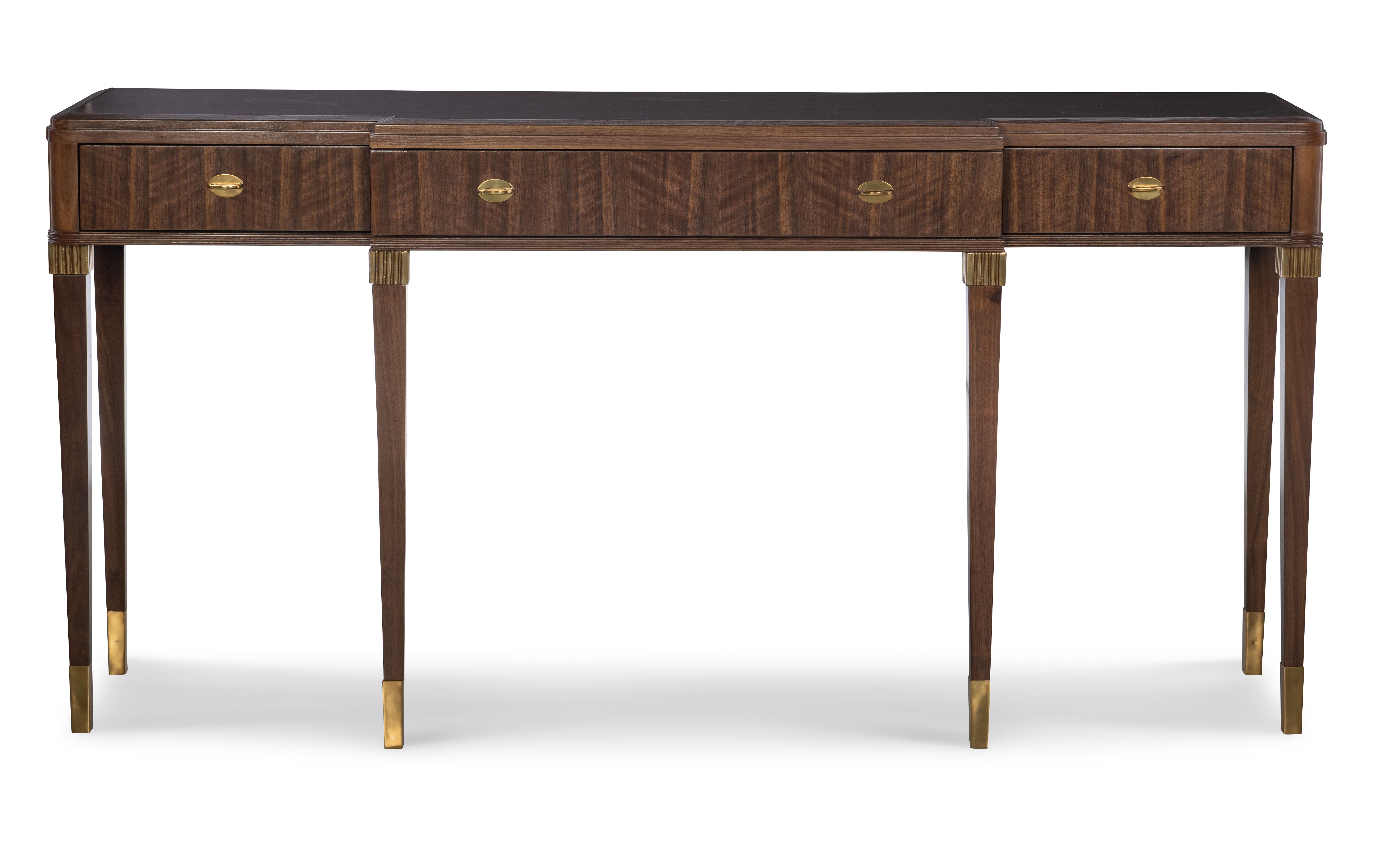 Three soft-close drawers with antique brass finish hardware, accents and ferrules |