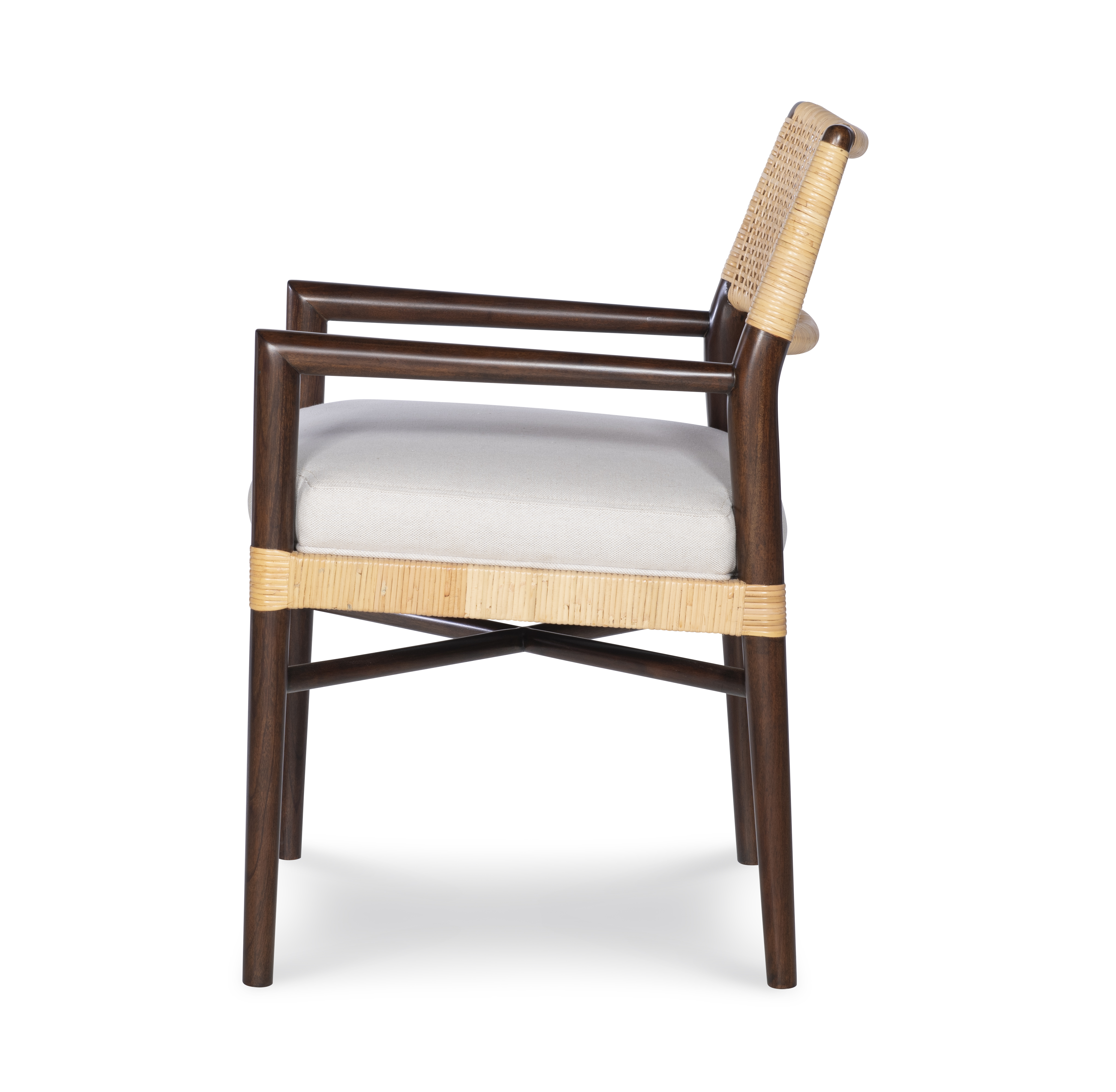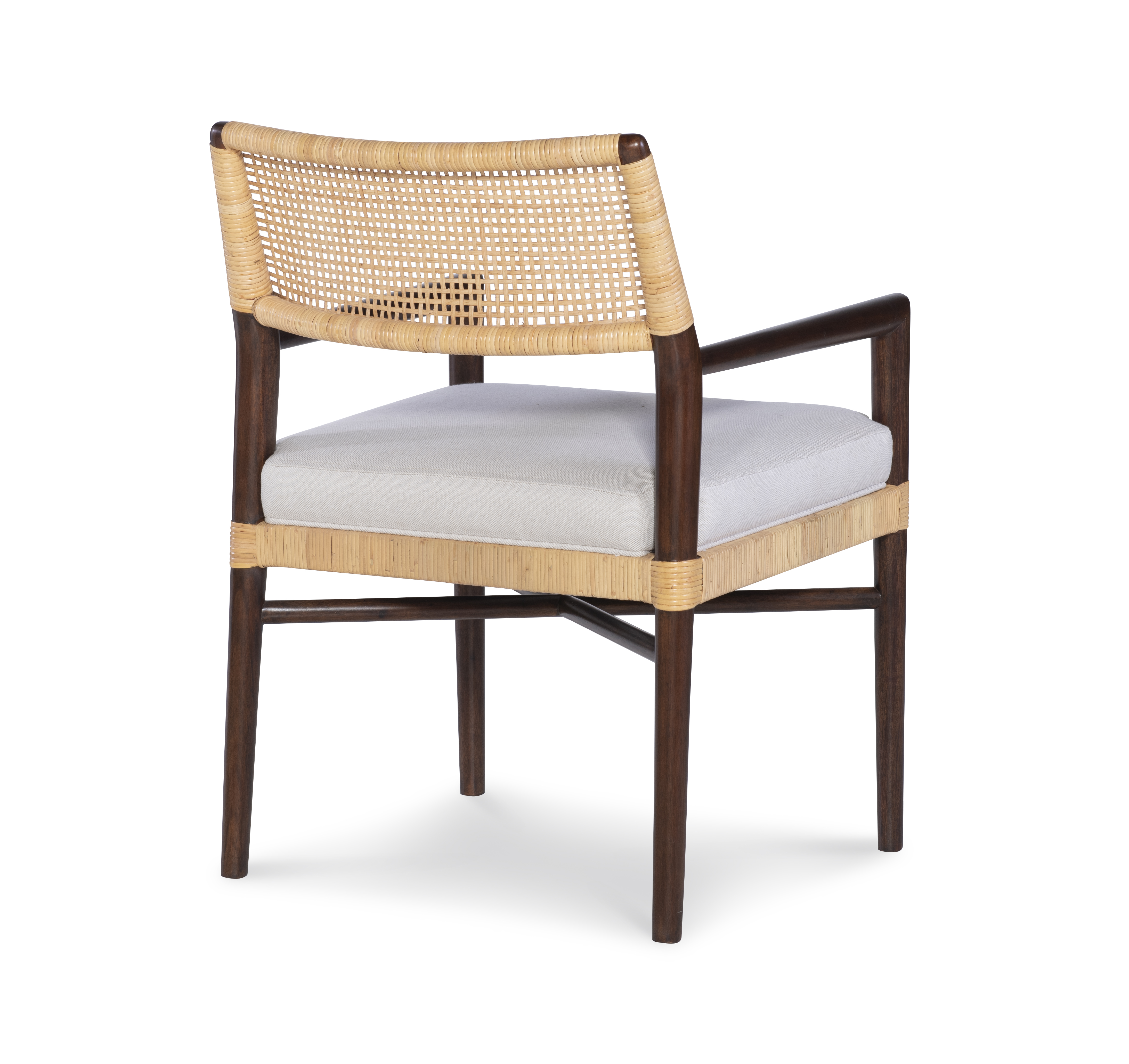 **Limited Quantities Available** Dark stain finish Mahogany frame with natural colored rattan split weave on back rest and underneath seat cushion with flax upholstery |
