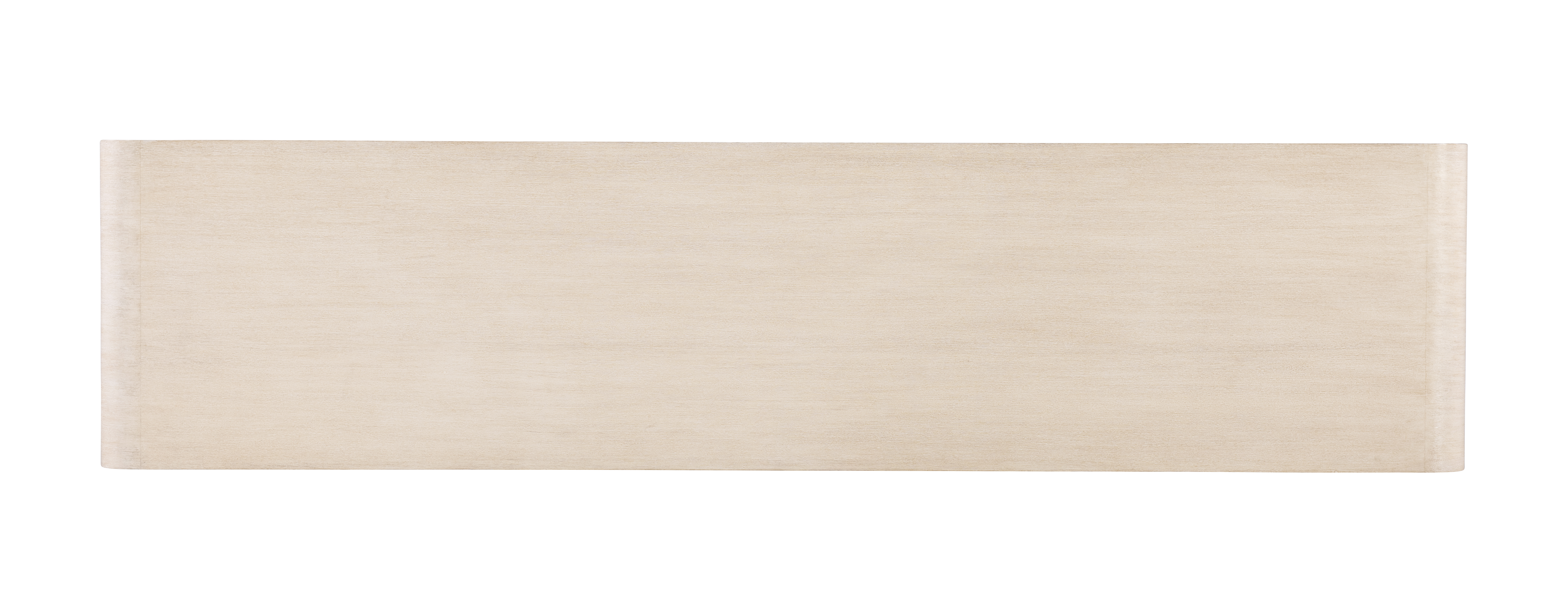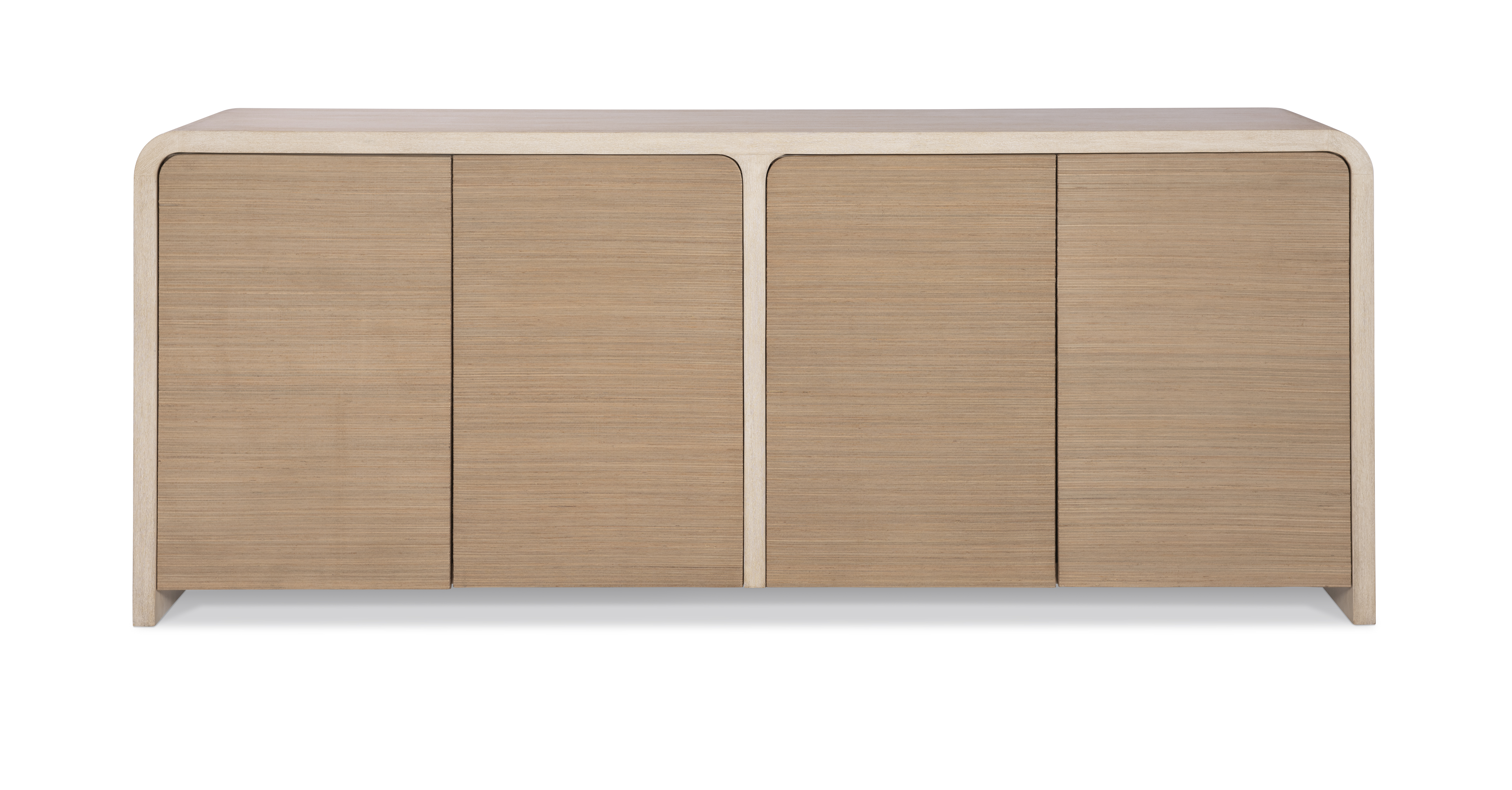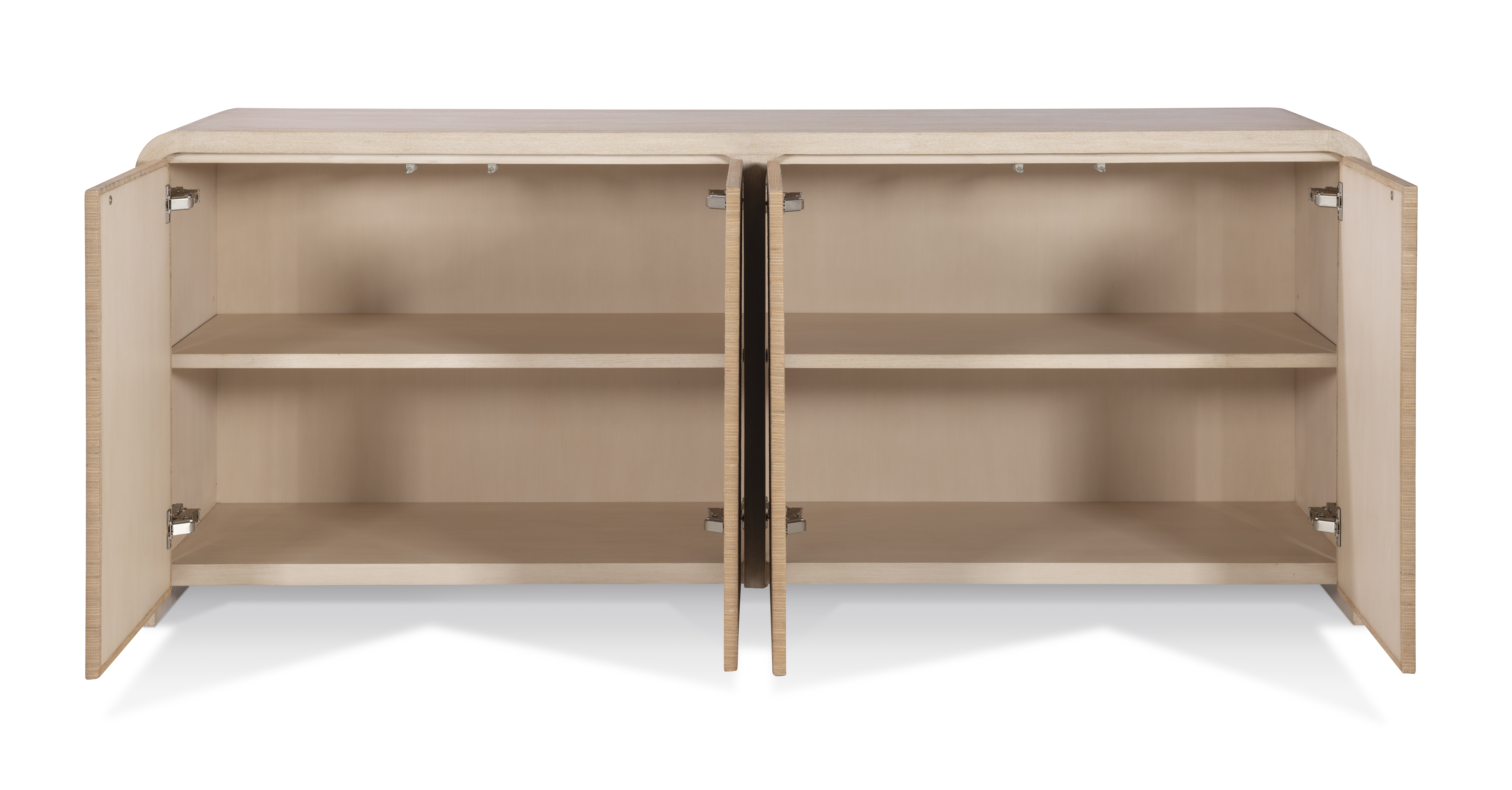 A sand-blasted light toned case with natural cane wrapped touch-latch doors |