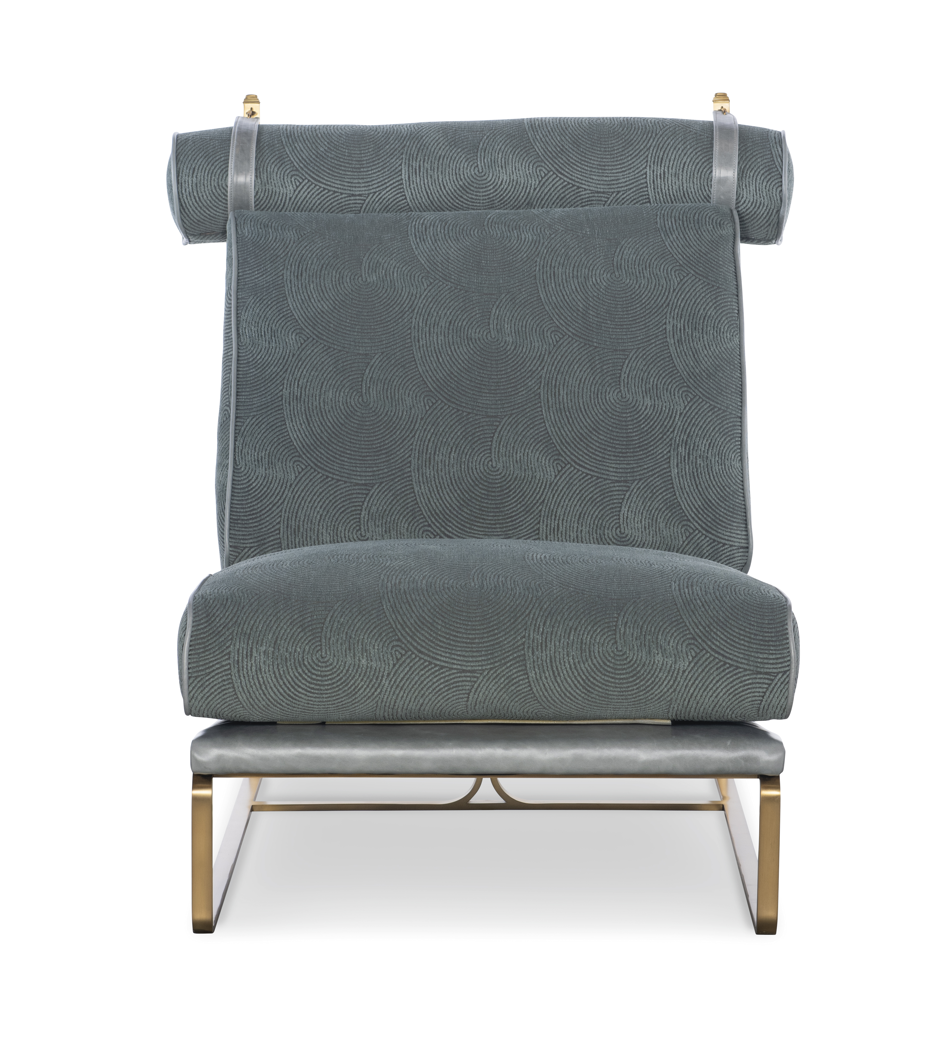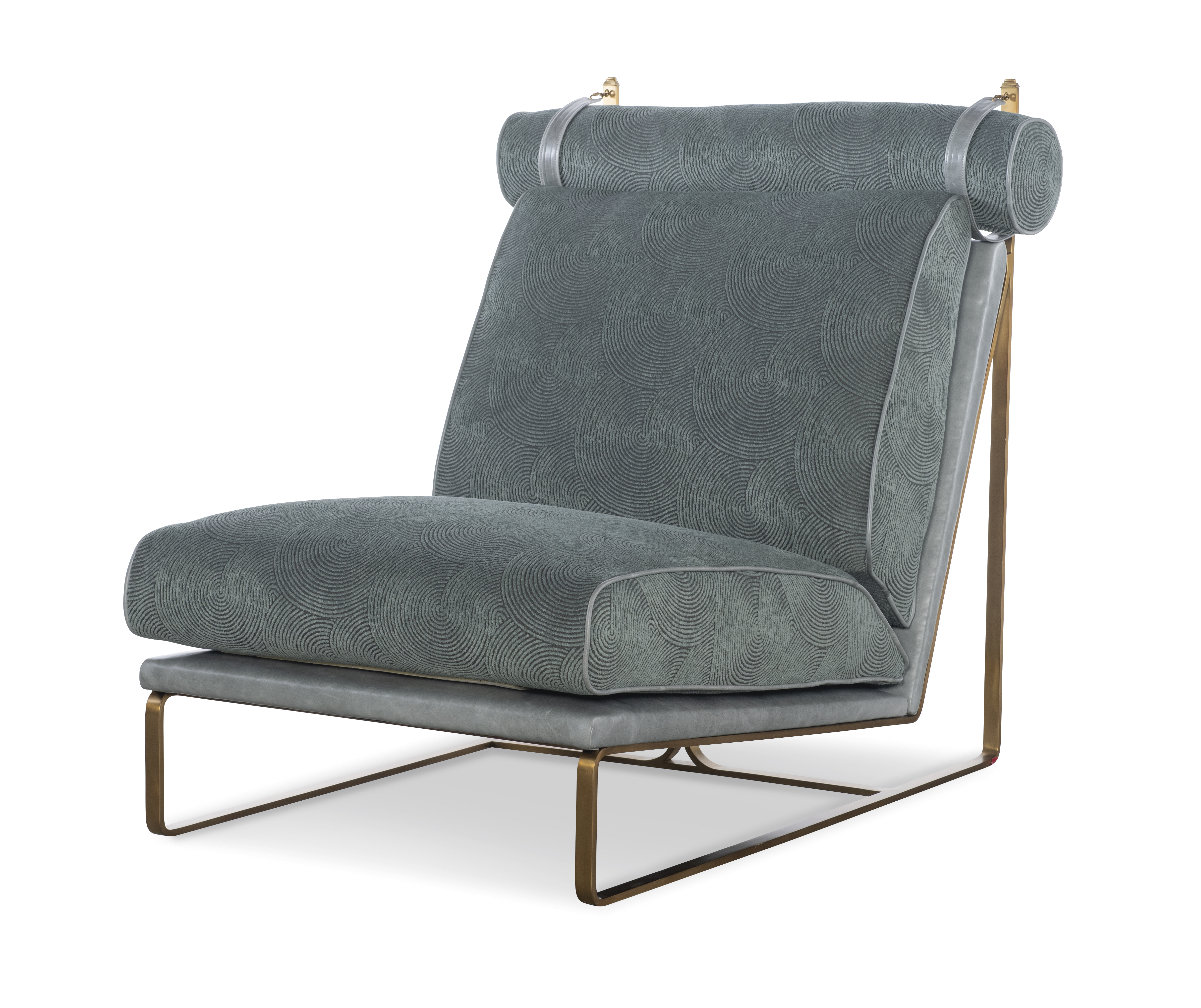 This deftly upholstered lounge chair is simply strapping with leather loops supporting its bolster head pillow and a matte gold plated steel frame. Available with ottoman, your favorite book invited.