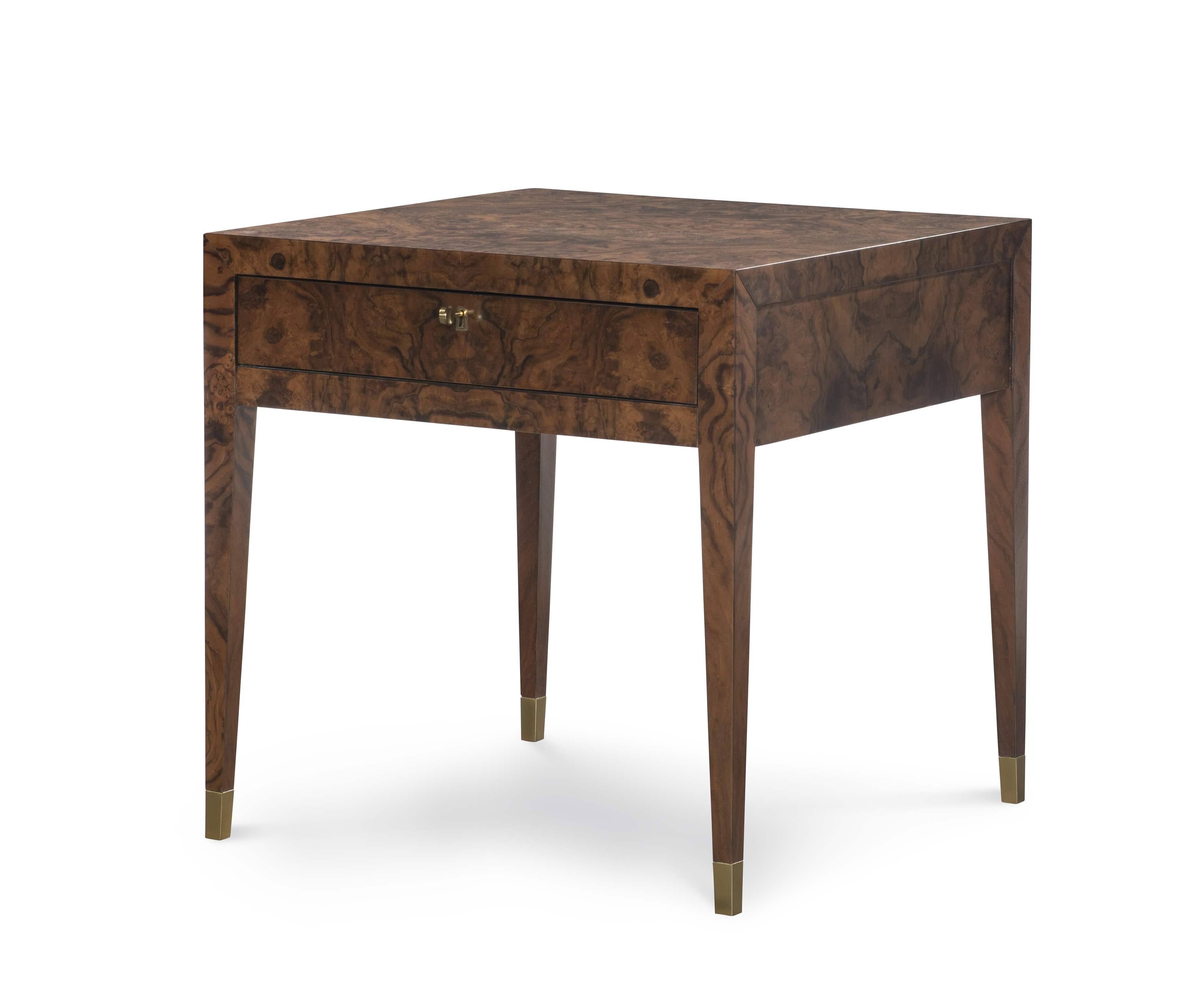 warm brown. One soft close drawer with brass trim key and keyhole hardware. Brass finish ferrules. |