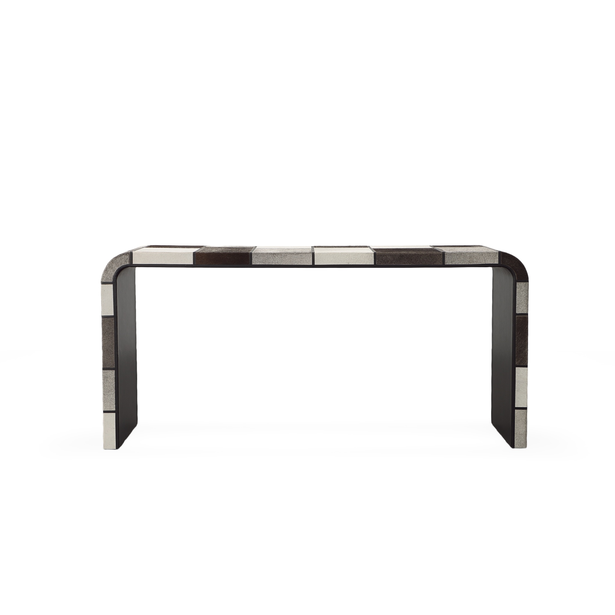 The Ferris console table features a combination of three different hair-on-hide colors combined in a random geometric block formation and waterfall shape.