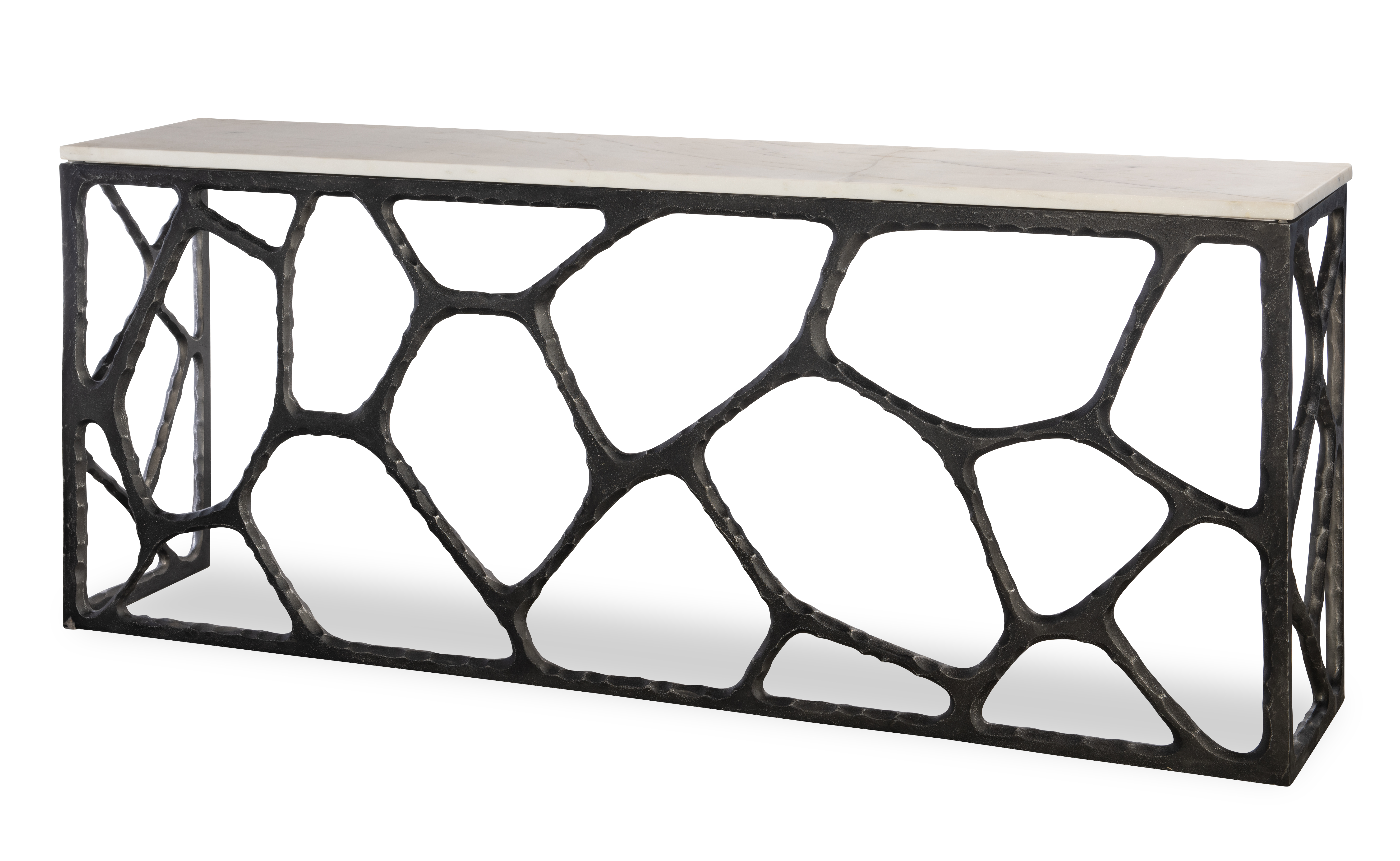The Zane Console features a textured oil rubbed bronze metal base designed in an organic and asymmetrical webbed pattern. The top is white marble creating a beautiful contrast.