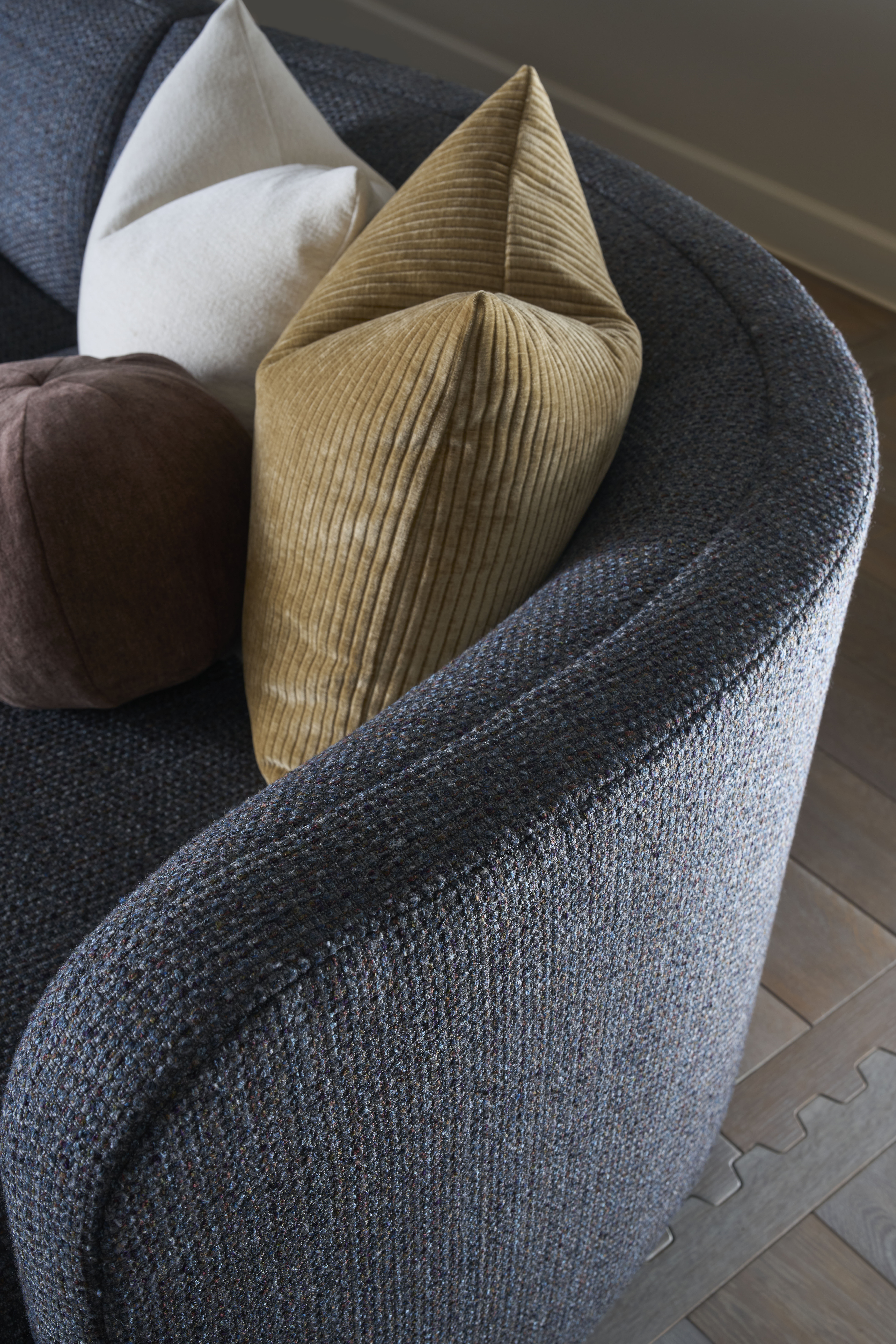Bella Sectional series is an organic modern form featuring curvaceous shapes making it truly unique. Bella has a tight back and seat, seats are enhanced with memory foam cushioning and Pirelli type webbing technology for increased comfort. Currently Bella consist of seven pieces including a pod, a chaise and armless loveseats. This sectional would be stunning floated in the center of the room.