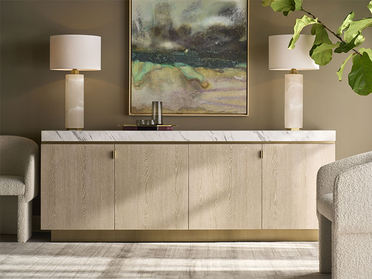 The essence of the Cadence collection lies in its meticulous selection of materials like polished oak, brushed light bronze metal, pristine white marble and lustrous lacquers. Textural contrasts are emphasized with boucle fabrics, textured metals, glass embellishments, and Carrara marble, enriching the tactile and visual experience of each piece.