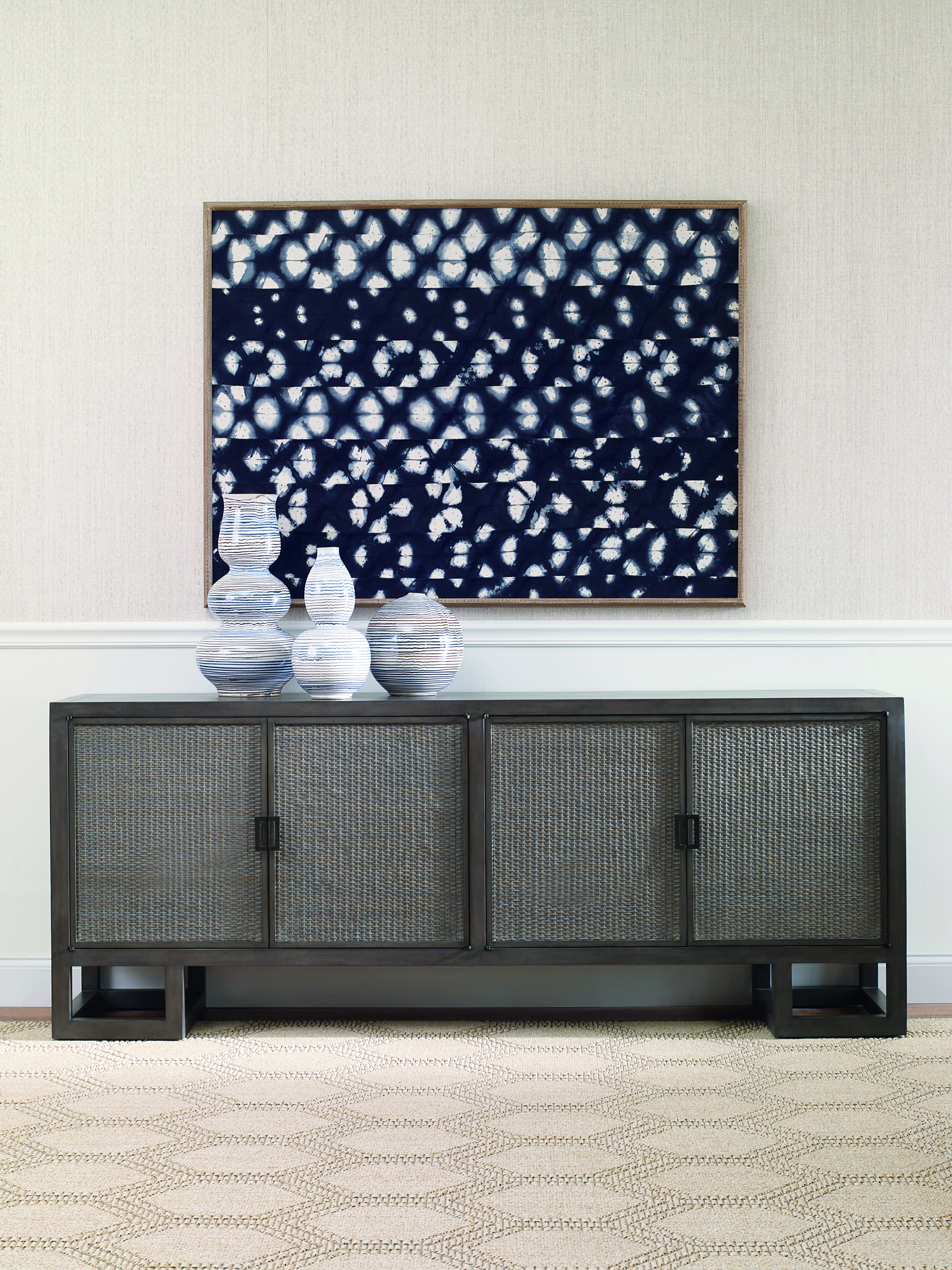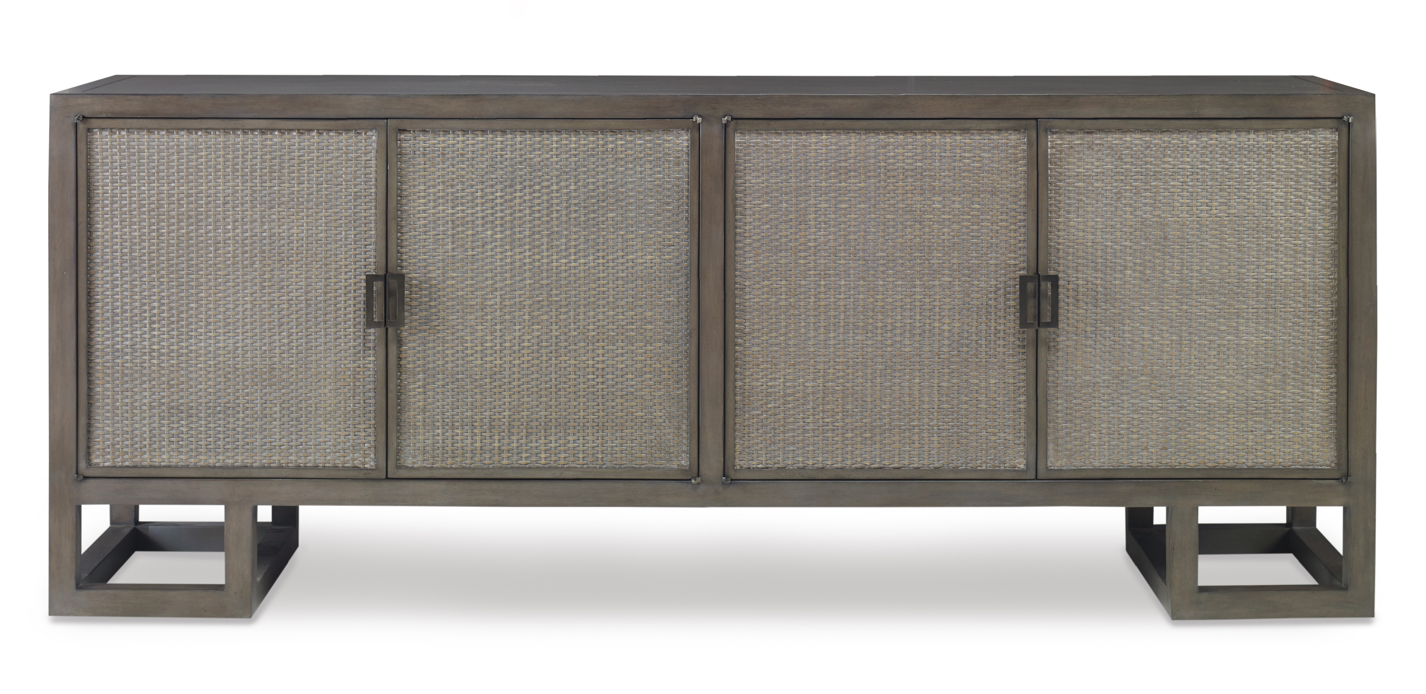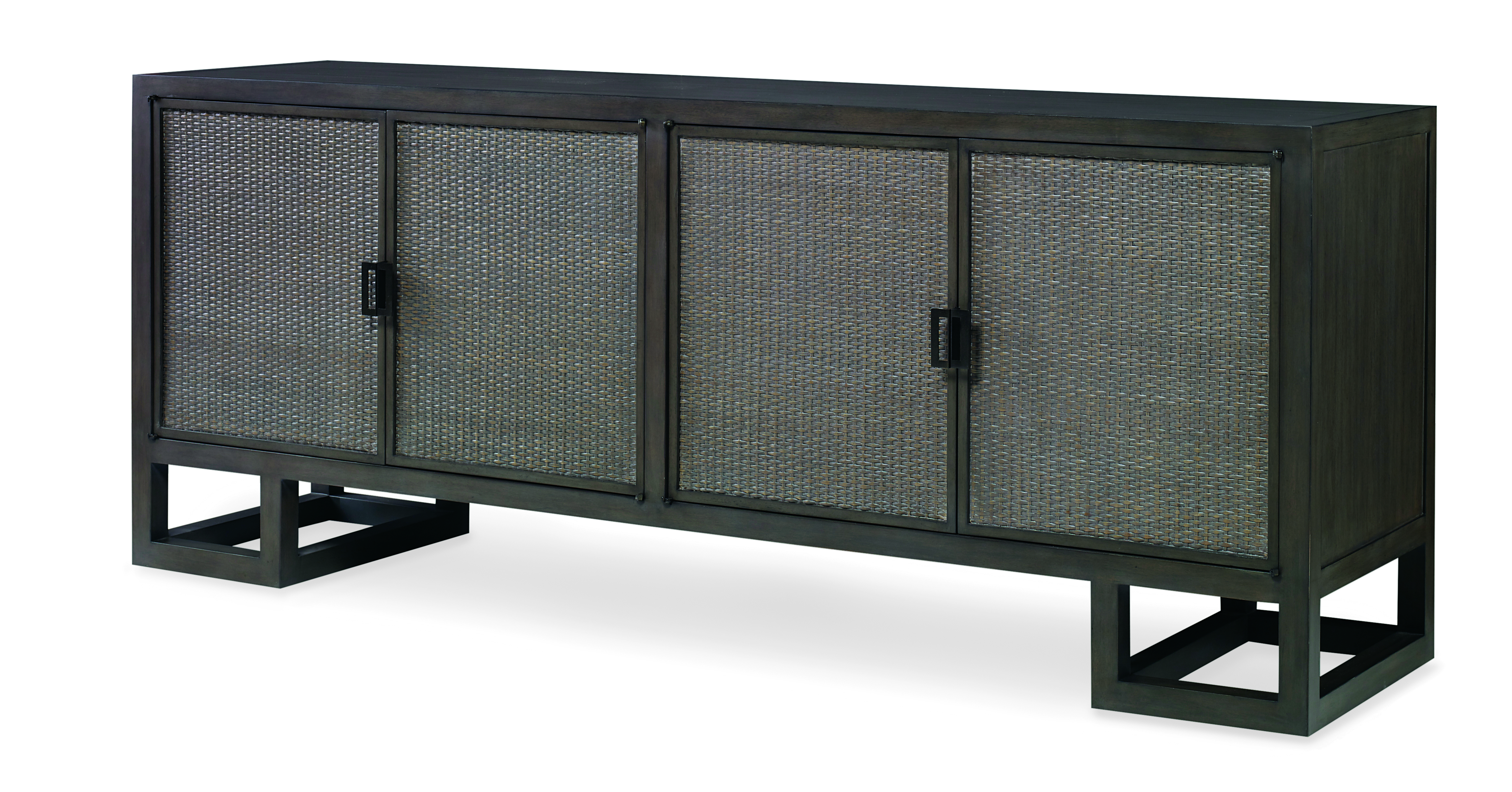 Our Mackinaw credenza is crafted from Mahogany solids and veneers with natural woven cane on the door faces lending the piece a soft casual feel. Designed with solid brass pewter finished hardware. Two sets of doors open to reveal ample storage. Behind the two right facing doors are three tray drawers on either side of a center partition and behind the left doors is a wine rack and one adjustable shelf with center partition between them.