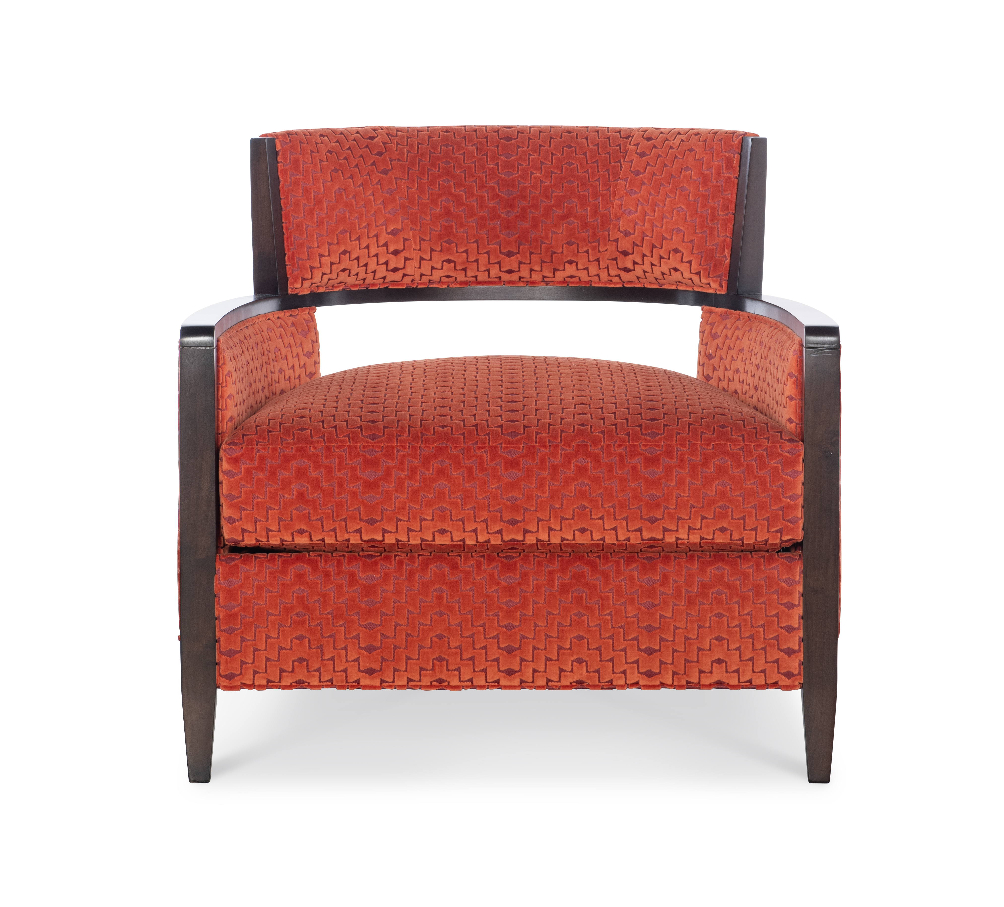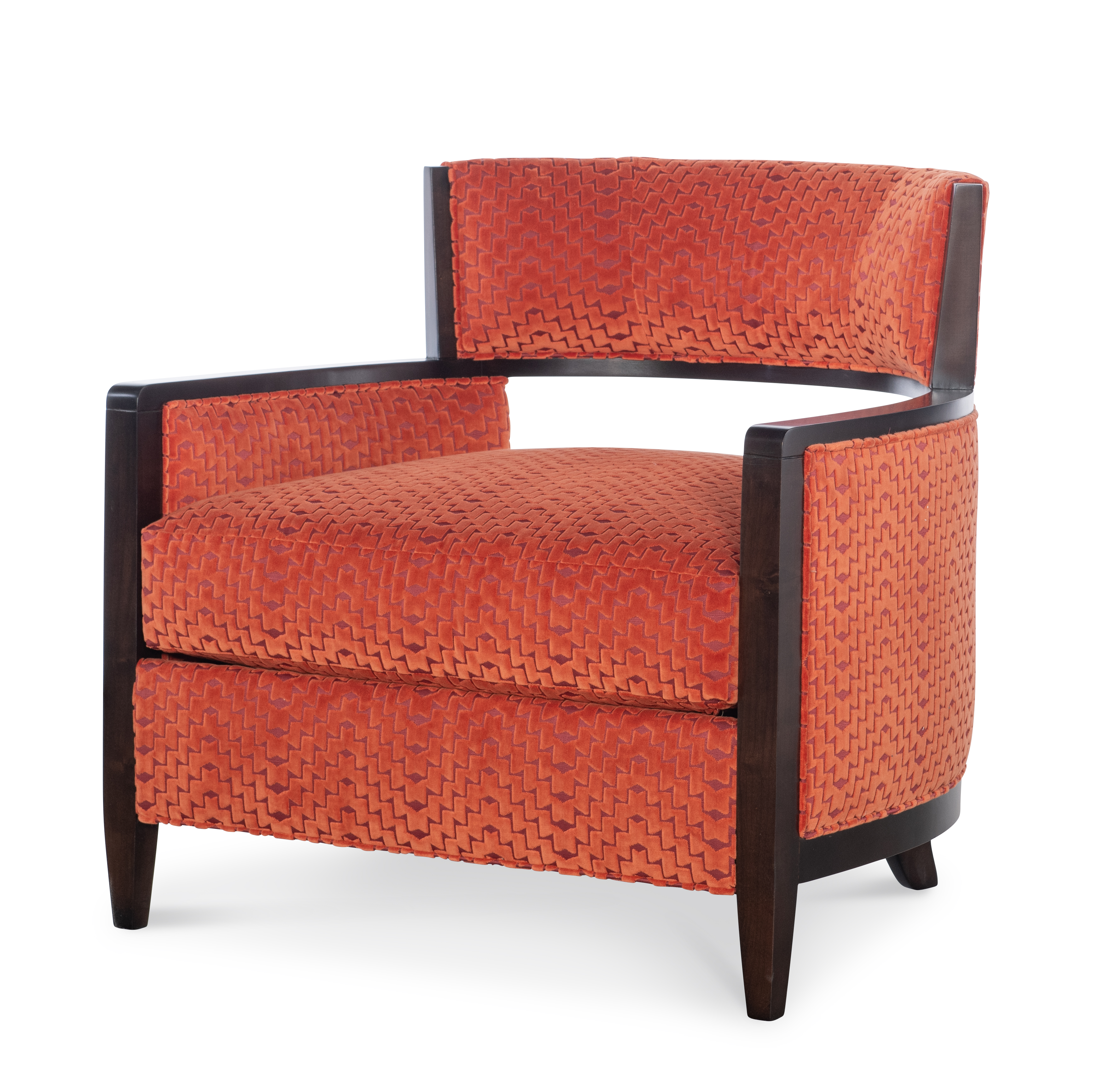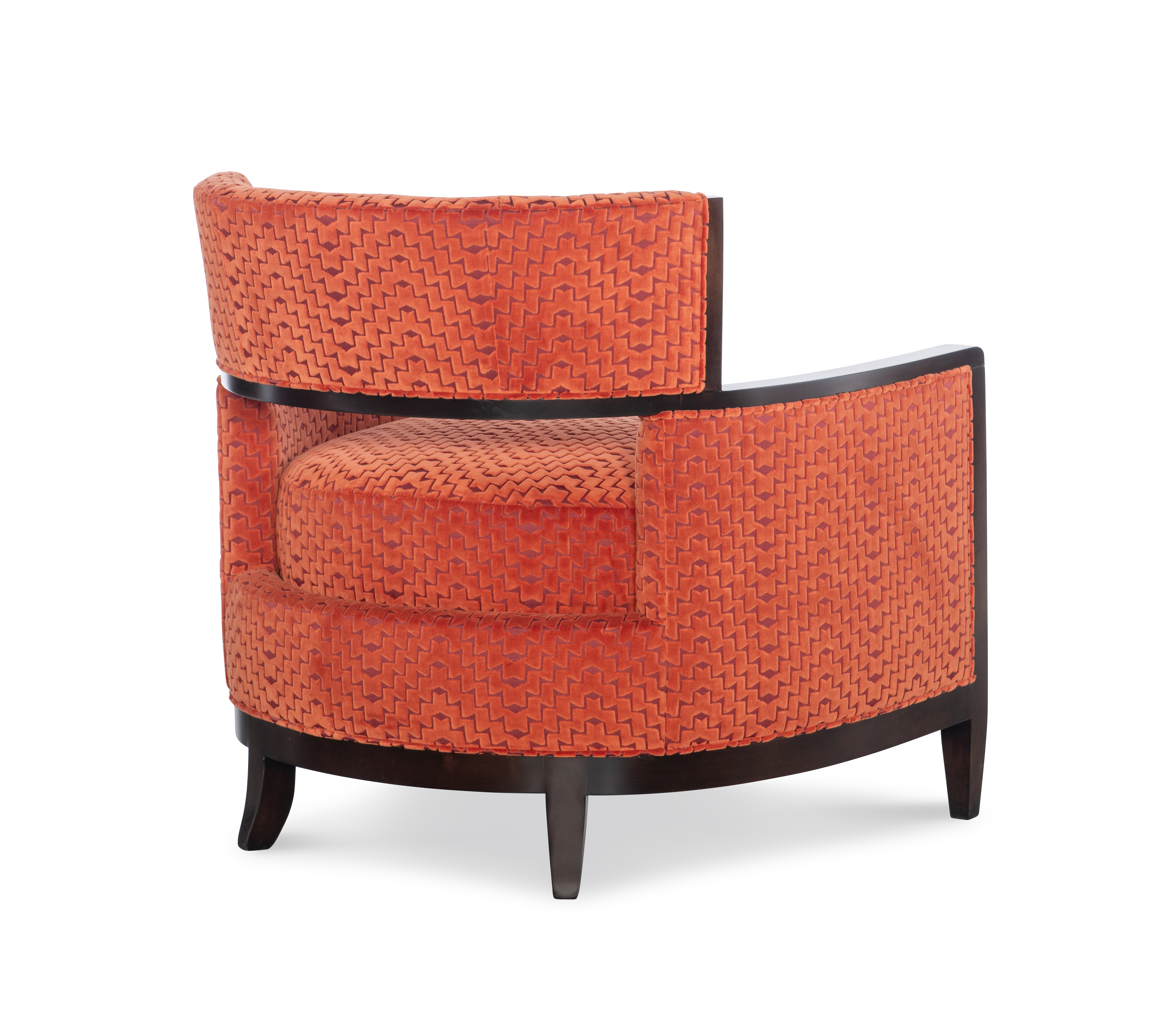 The Everly is a updated twist on a barrel chair featuring sleek exposed wood trim, open window back and tapered legs. This would be a great chair to contrast the welt.