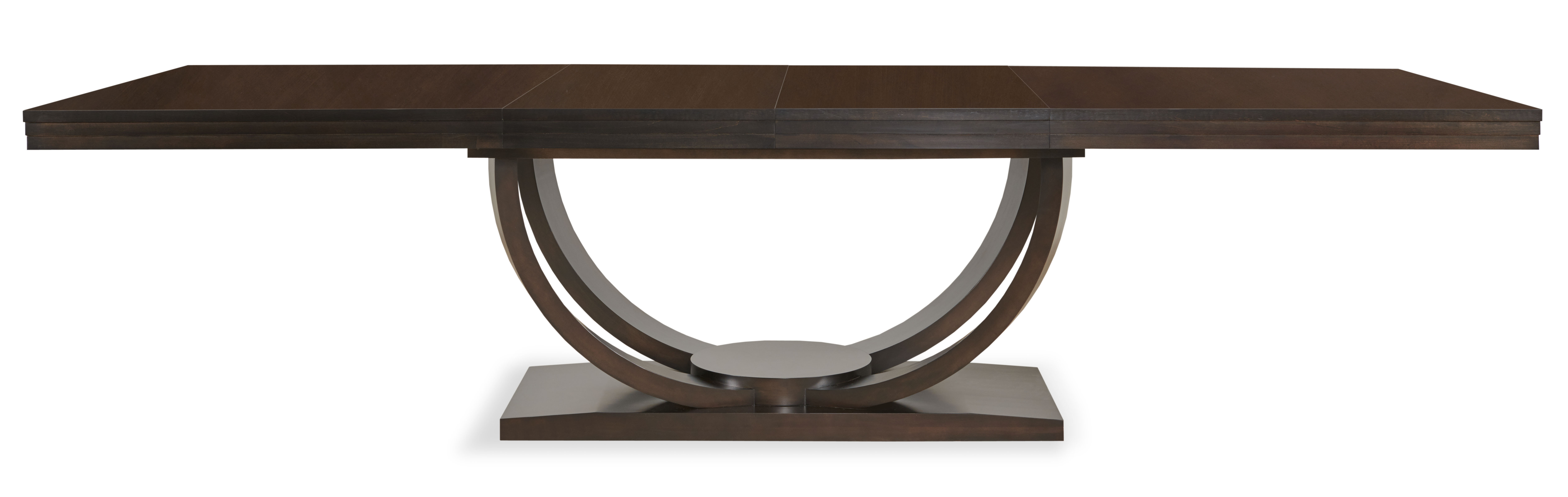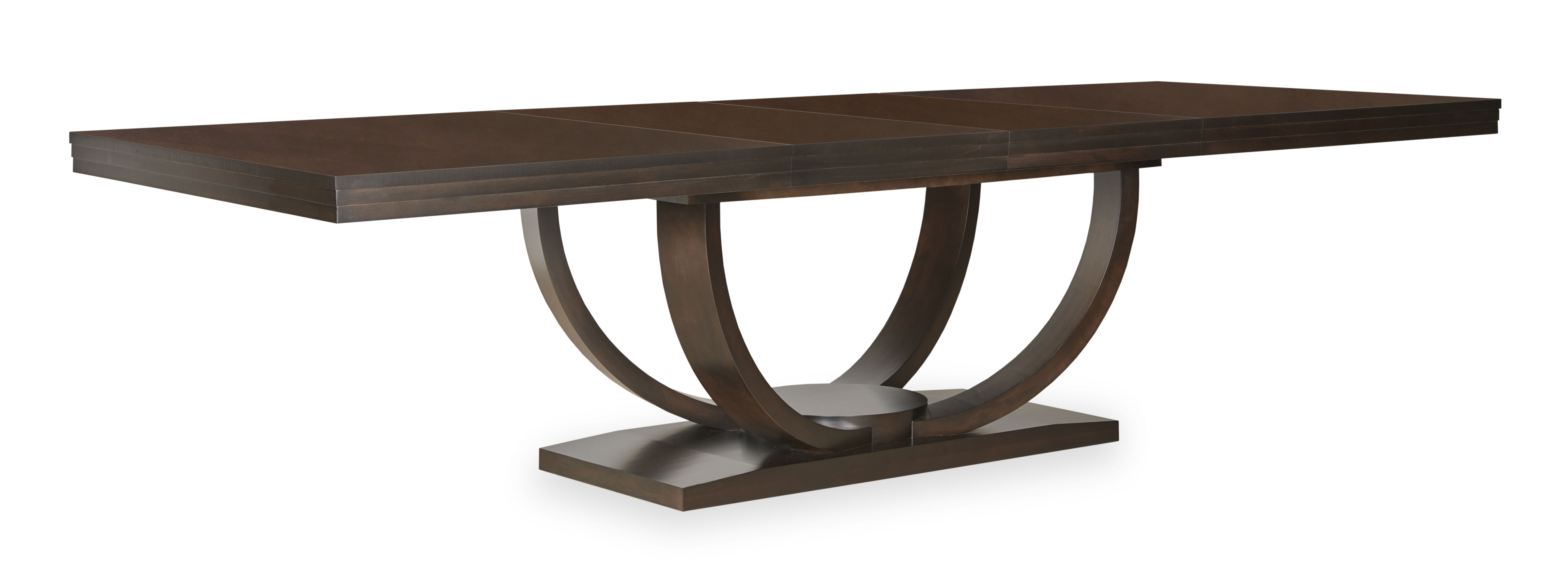 Our bestselling Omni dining table is a majestic "statement table" for the dining room. This table is composed of a comforting balance of curves and angles. A rectangular platform topped with a circular centerpiece from which radiate four graceful "arcs" flowing upward to support the tabletop. Rendered here in maple, this wood species is ideal for stains and painted finishes allowing for a more casualized and informal dining room option.