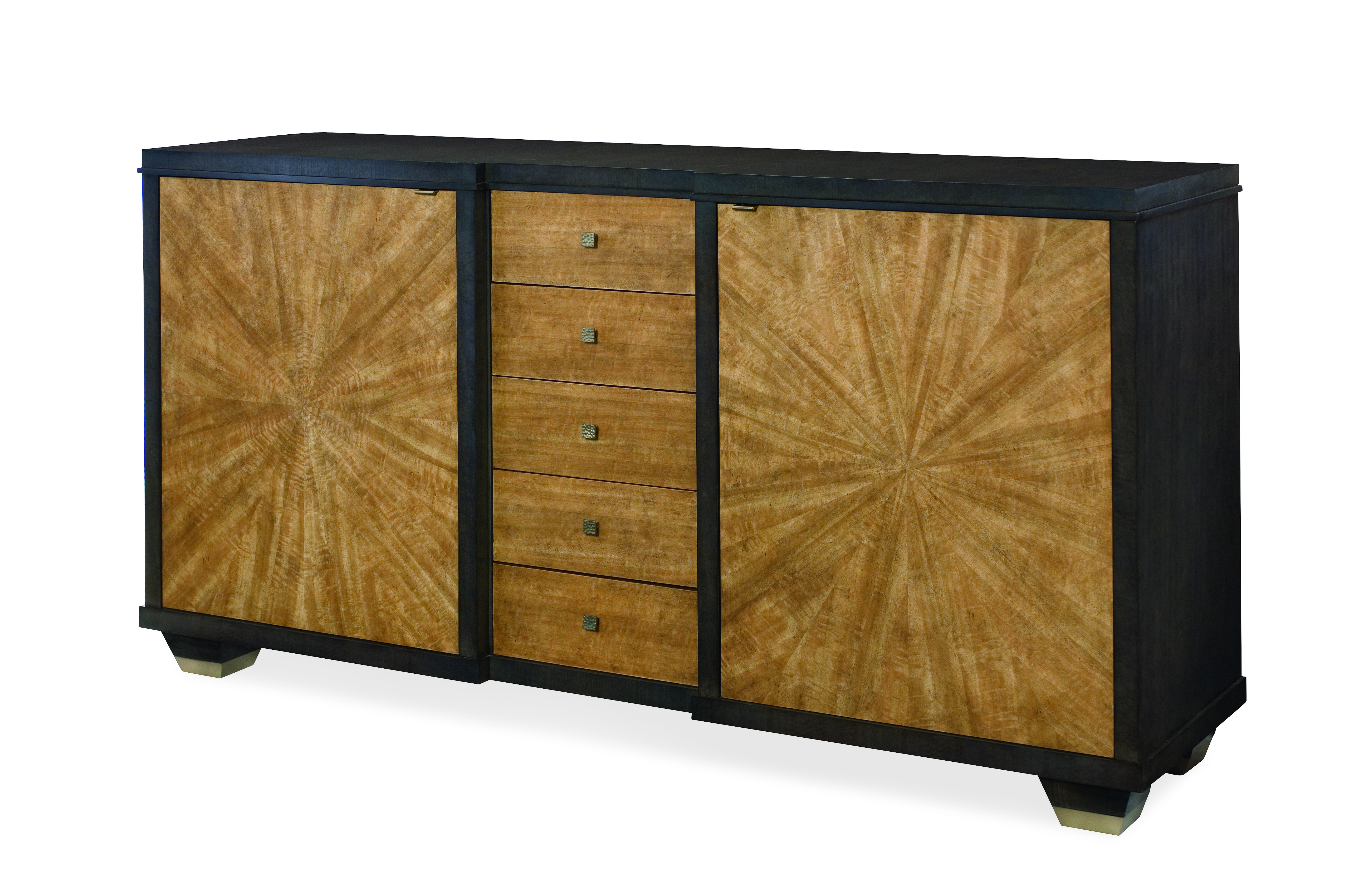 The natural character of Eucalyptus steals the spotlight in this elegant credenza- particularly on the pair of doors, where triangular veneers form a starburst pattern. One adjustable shelf behind each door. Five drawers. Textured square metal pulls in a nickel finish and ferrules on all four feet. Shown here in Century's custom finishes, it is also available in stocked Sable finish as 55H-403 for quick shipping.
