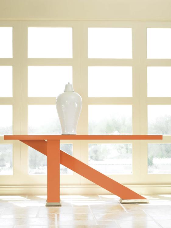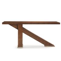 This elegant "cantilever" of a table is a marvel of engineering. Three "legs" originate at the same end of the table: two shorter vertical supports flanking a longer diagonal one that reaches almost to the opposite end. Beautifully figured Eucalyptus veneers envelop the piece and it rests on nickel toned metal feet. Also available in our stocked Sable finish as 55H-725 for quick shipping.