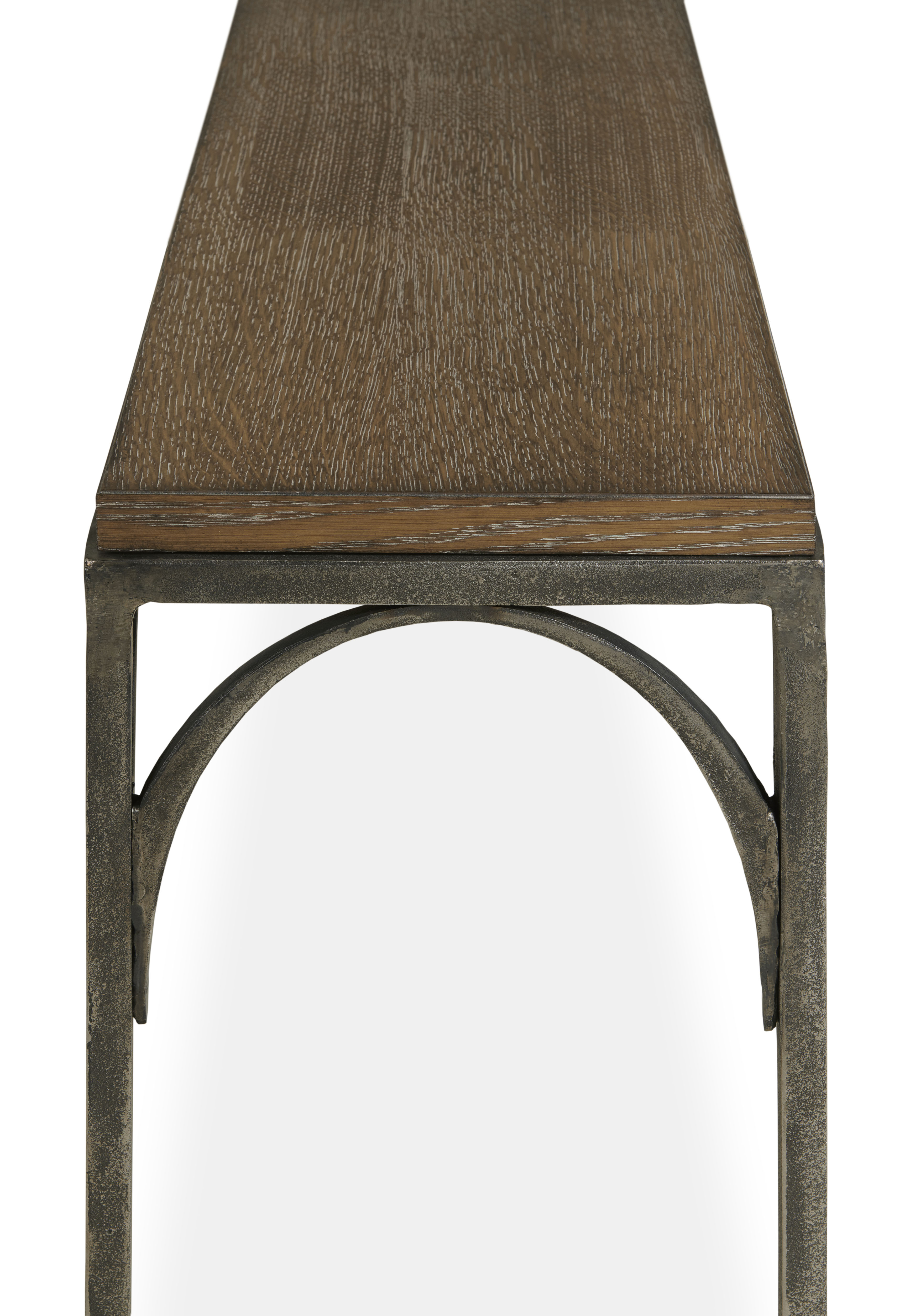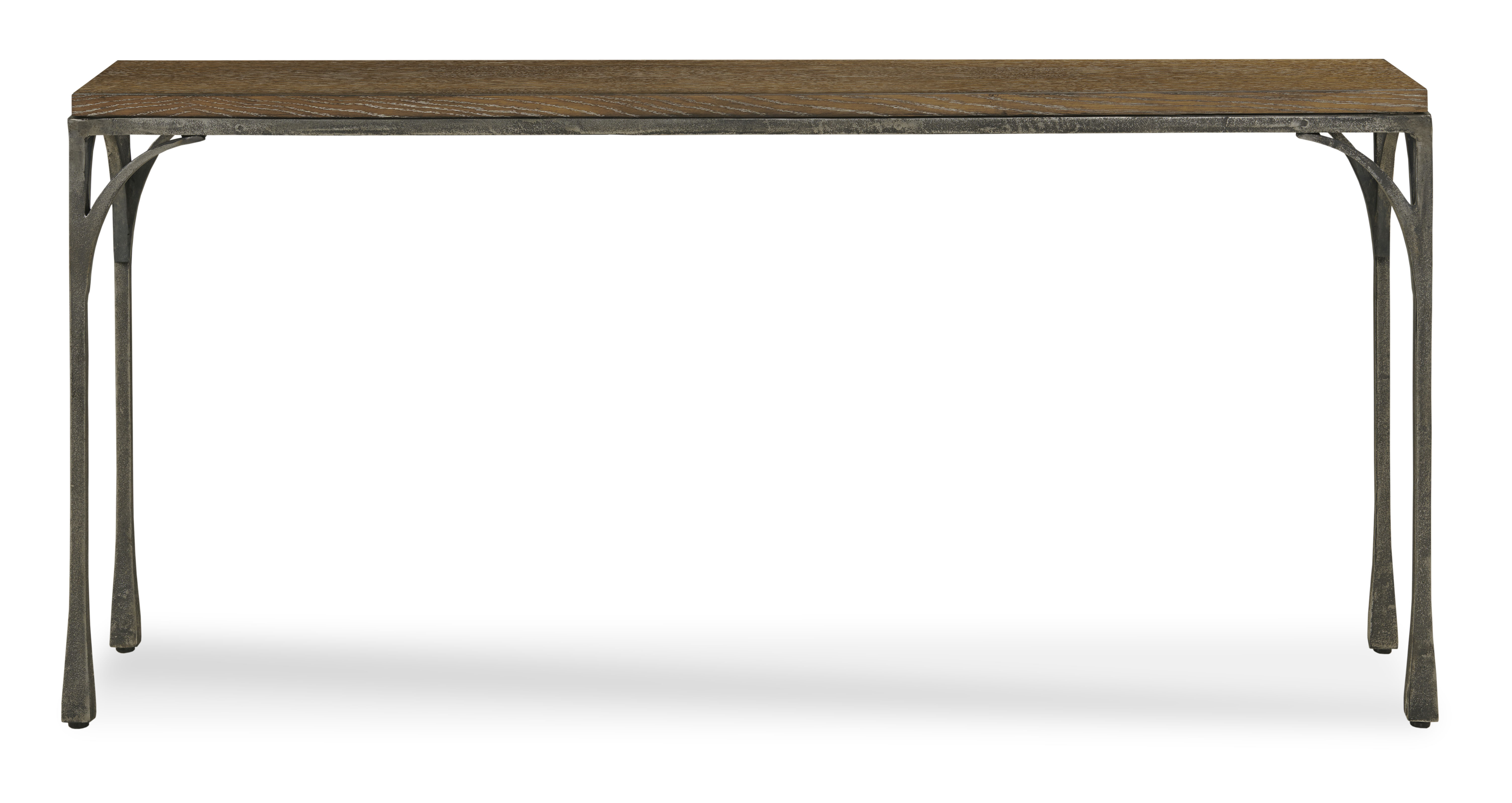 This textured iron base features flared feet and curved arched aprons that support a Oak veneer top. The top is available in any finish of your choice. The narrow width makes this console a perfect piece for any hallway or to tuck behind a sofa or sectional.