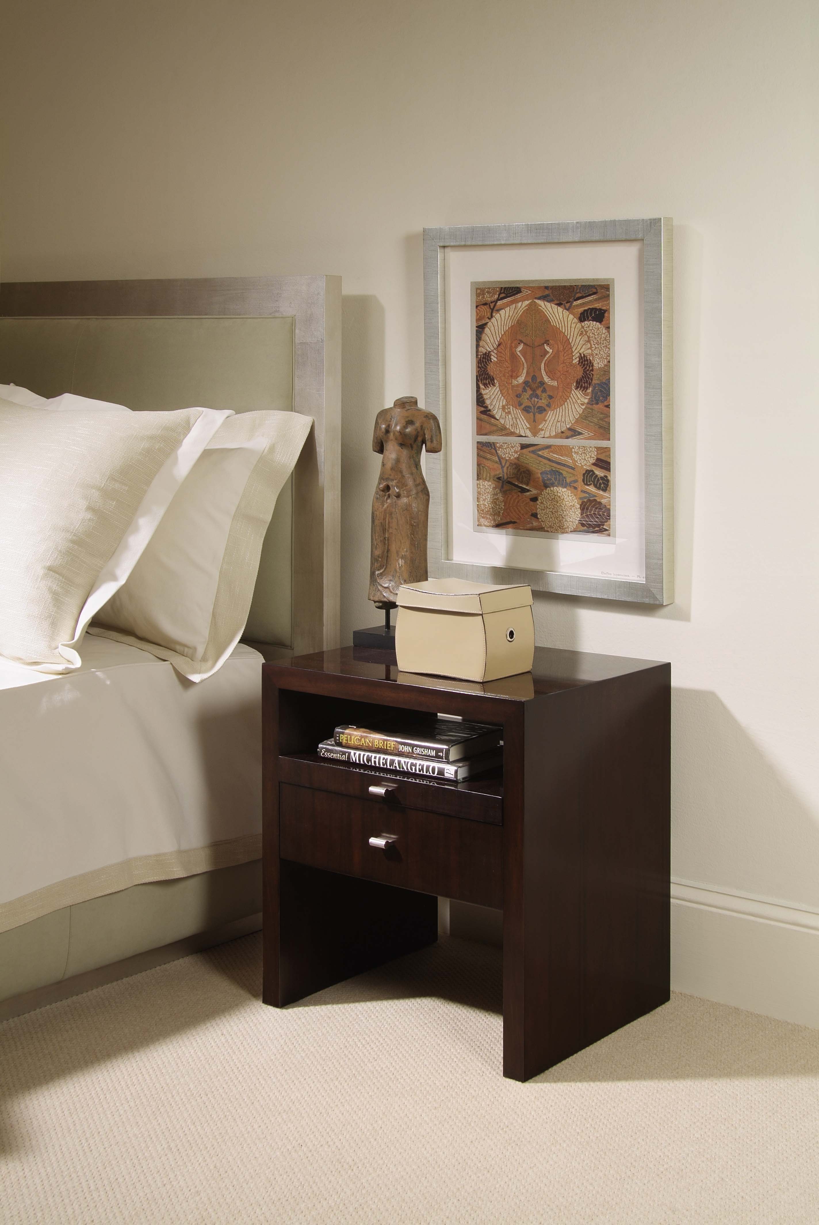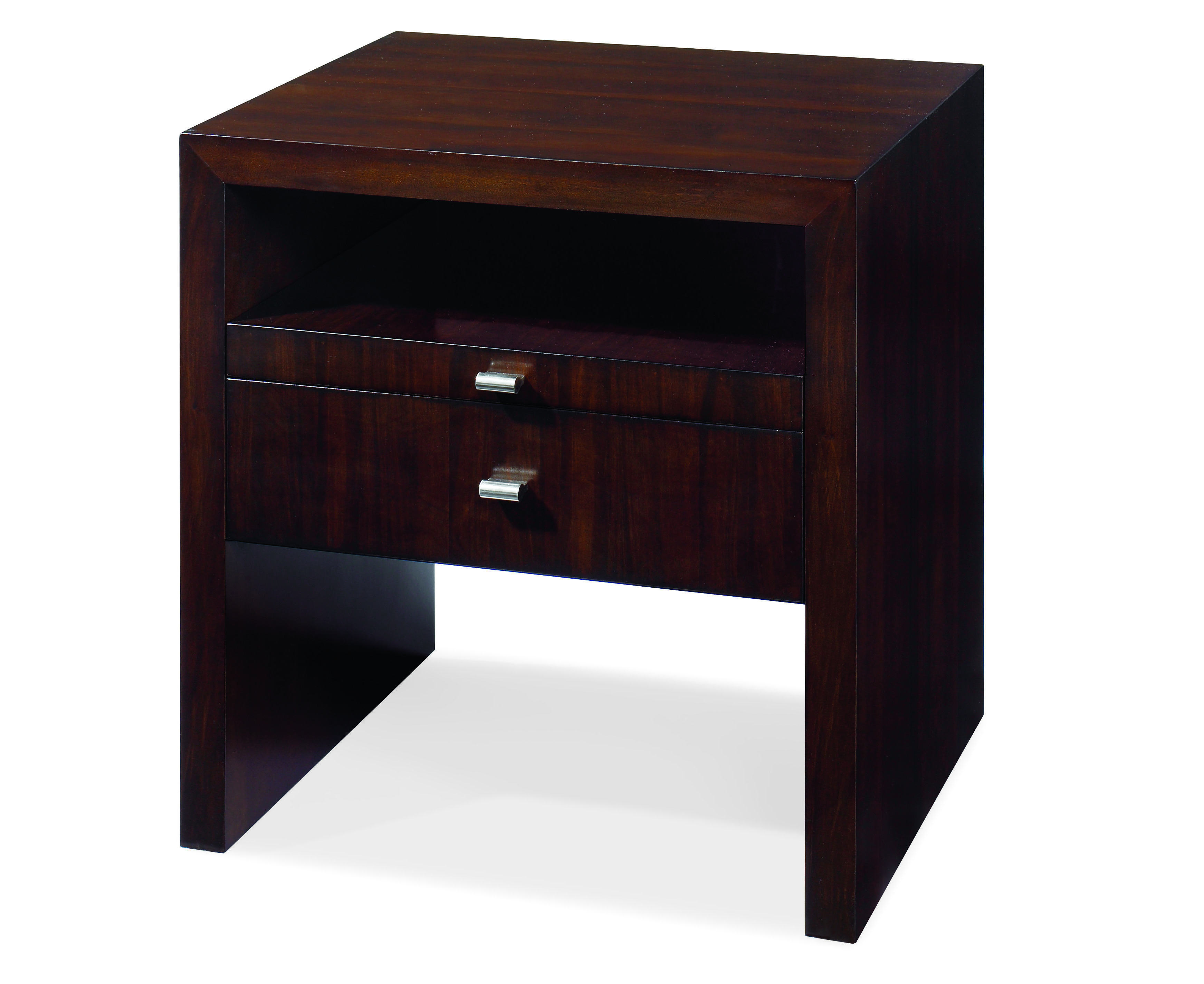 A single drawer suspended between simple panel ends, this bedside table is a masterwork in satin walnut veneer. Open storage compartment over pull-out tray. “Soft close” glide option on drawers. Hardware finished in Soft Silver or Bronze.