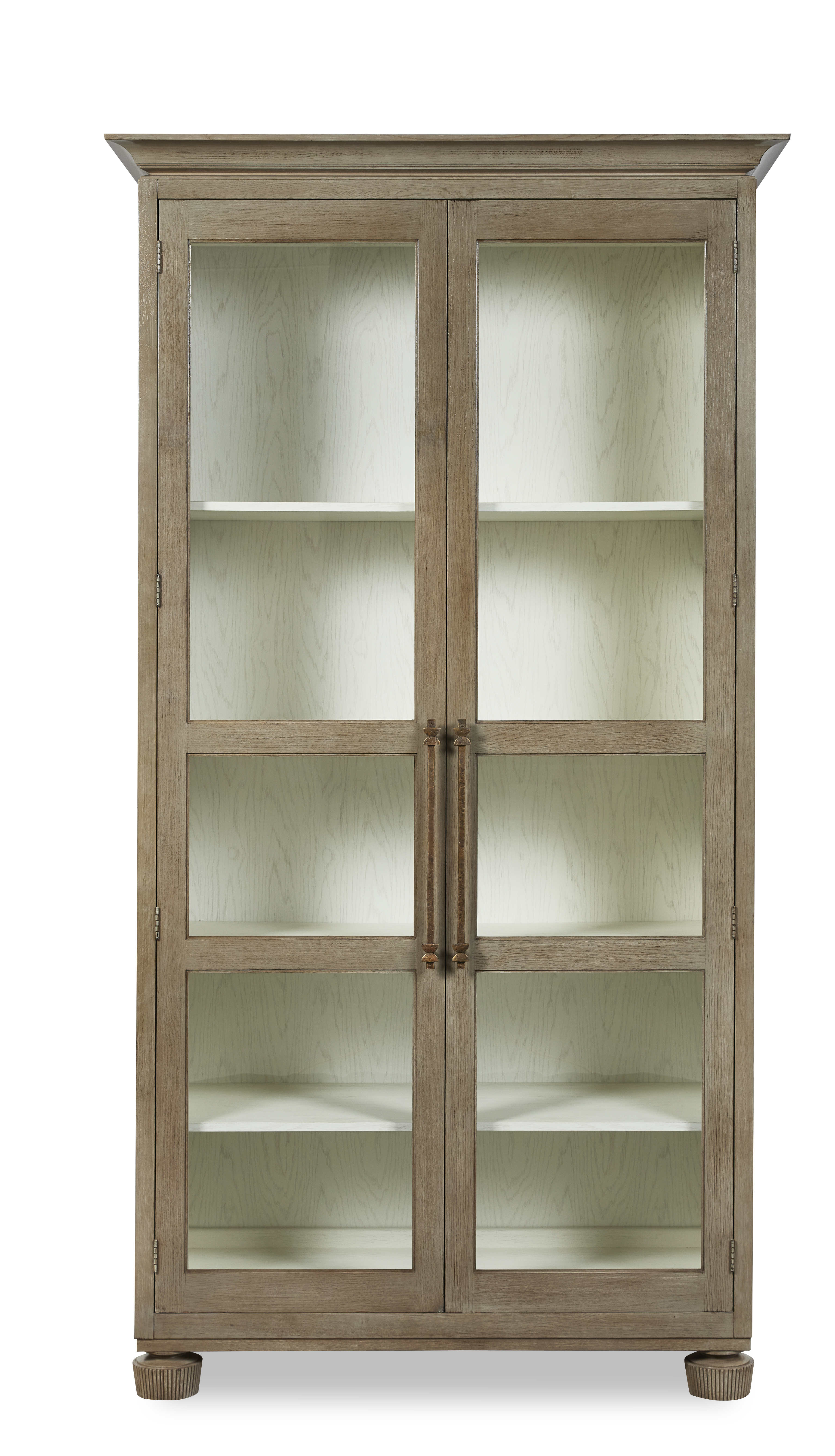 COMBO FINISH: Available as Exterior/Interior combination ONLY. Behind two wood framed glass doors with hammered brass hardware are two fixed shelves with one adjustable shelf above and one adjustable shelf below Tip restraint included |