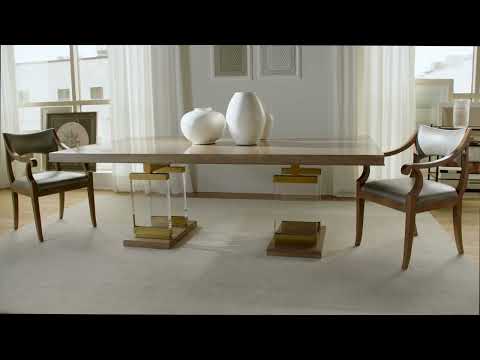 "The Porto Dining Table is an elegant new modern dining table with solid brass and substantial Lucite panels. The top is in thick oak veneer and with it we are introducing the new Carmel finish – inspired by my recent visit to the West Coast. The design started with my Porto Light from Visual Comfort. The lamp was inspired by a classic French modern light from the 1920’s. We studied several ways to create this new table. It has two bases, each with two Lucite and brass panels." - Thomas O'Brien