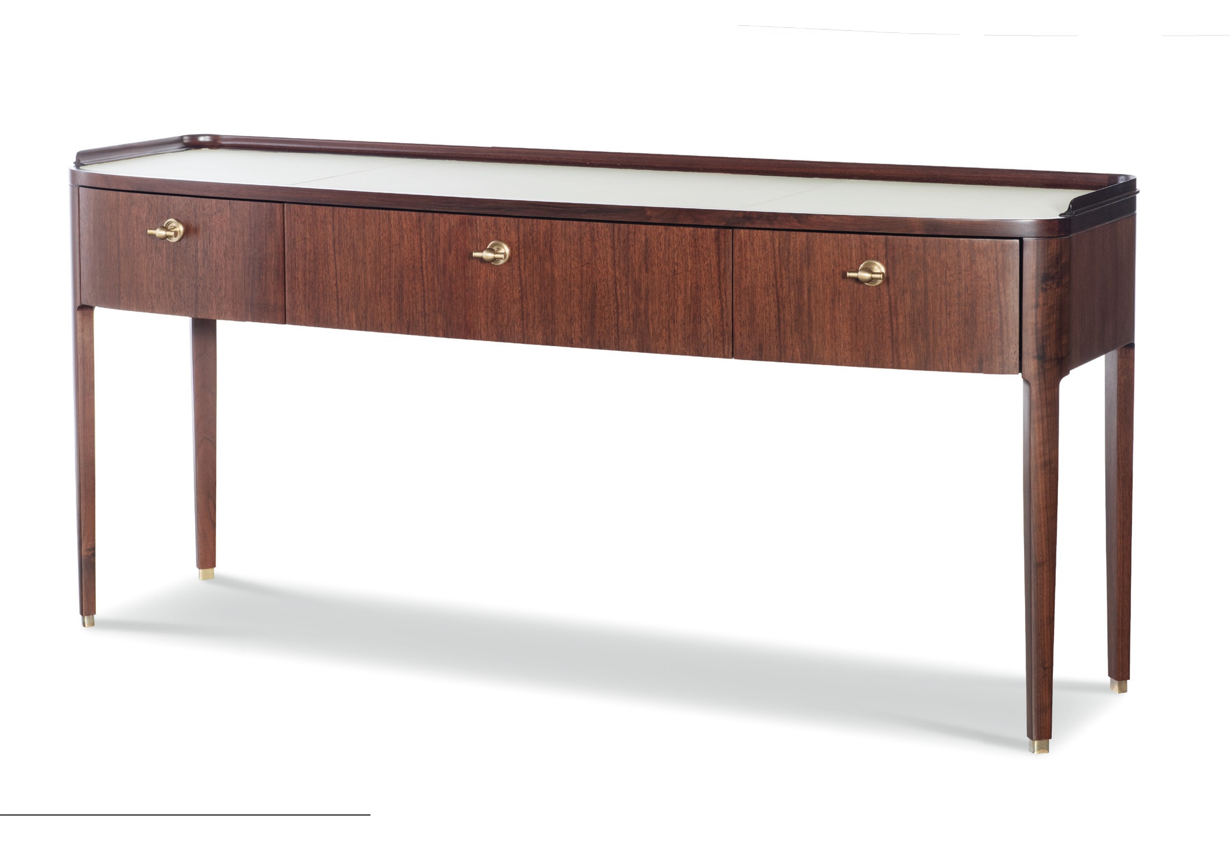 **Limited Quantities Available** Cream leather inset top Three soft-close drawers Antique brass finish hardware and ferrules |