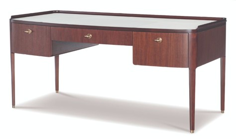 **Limited Quantities Available** Cream leather inset top Three soft-close drawers Antique brass finish hardware and ferrules |